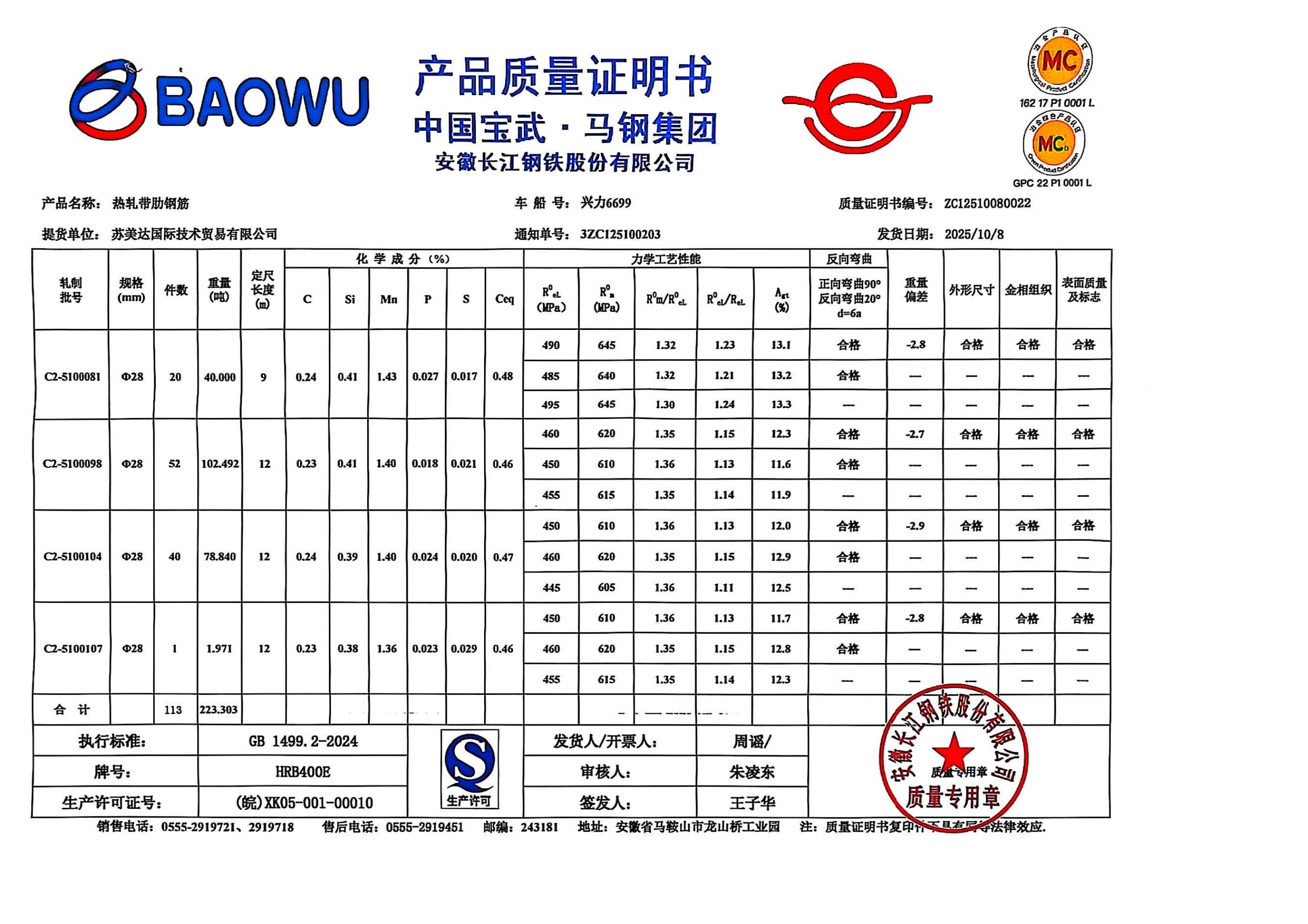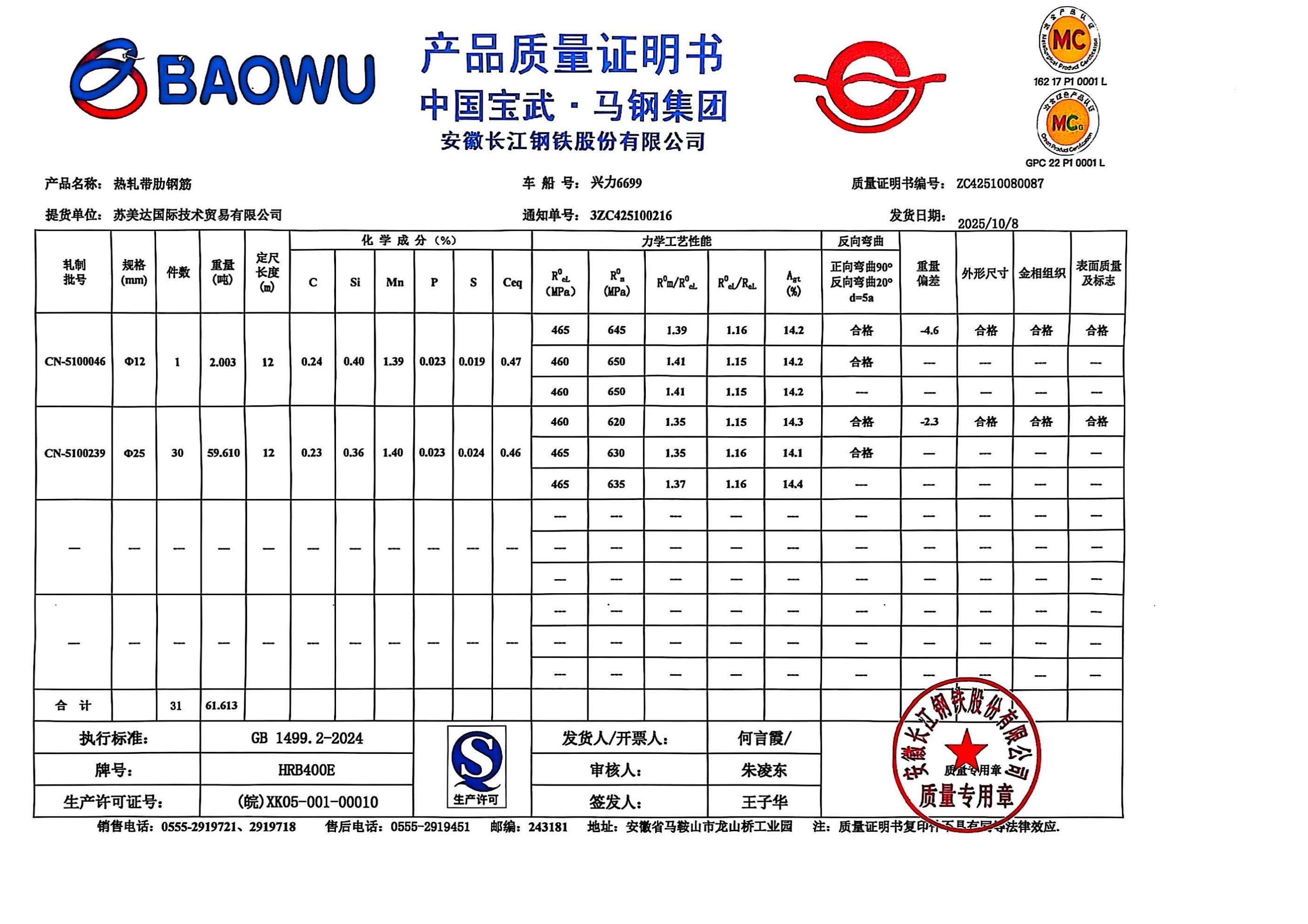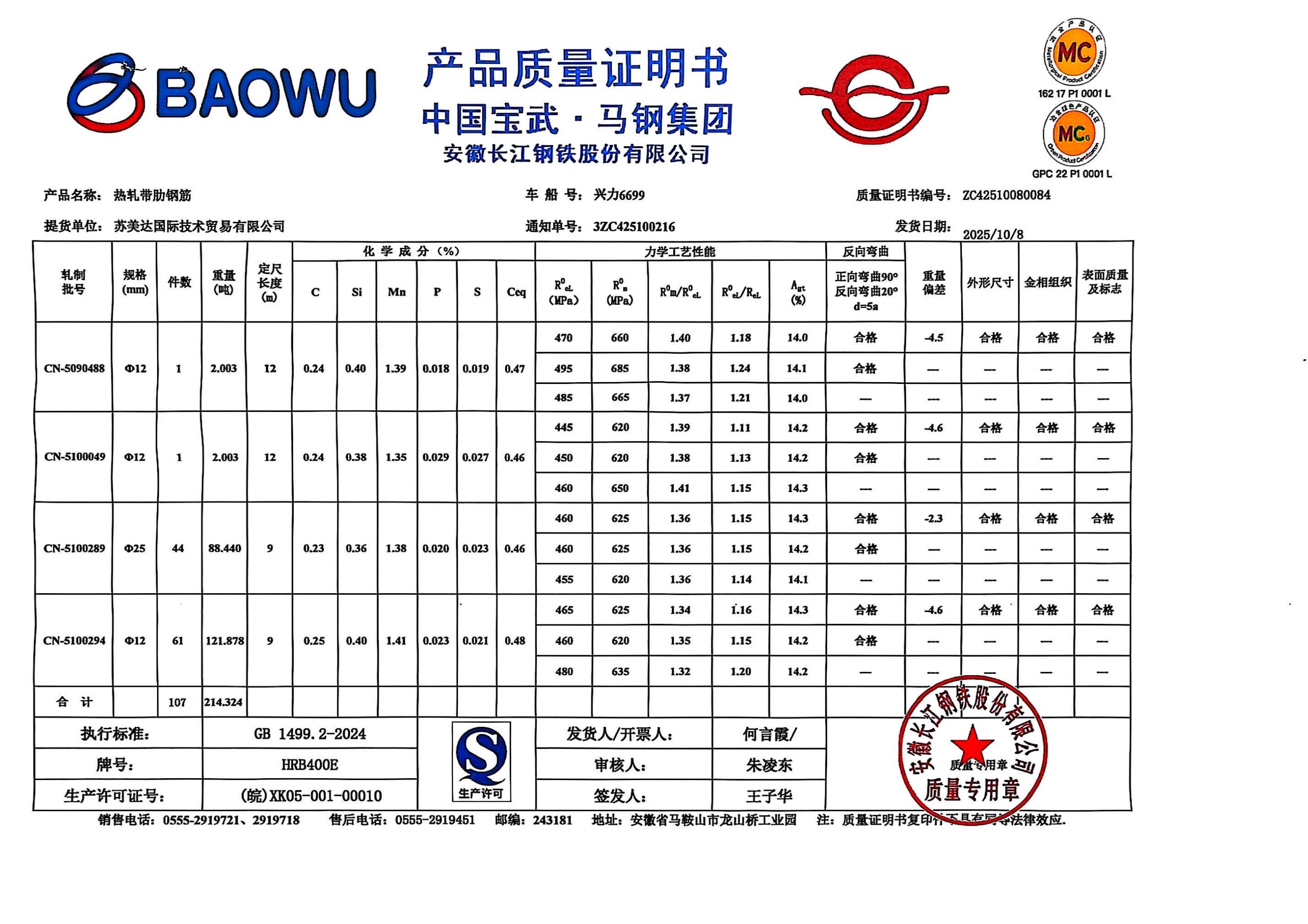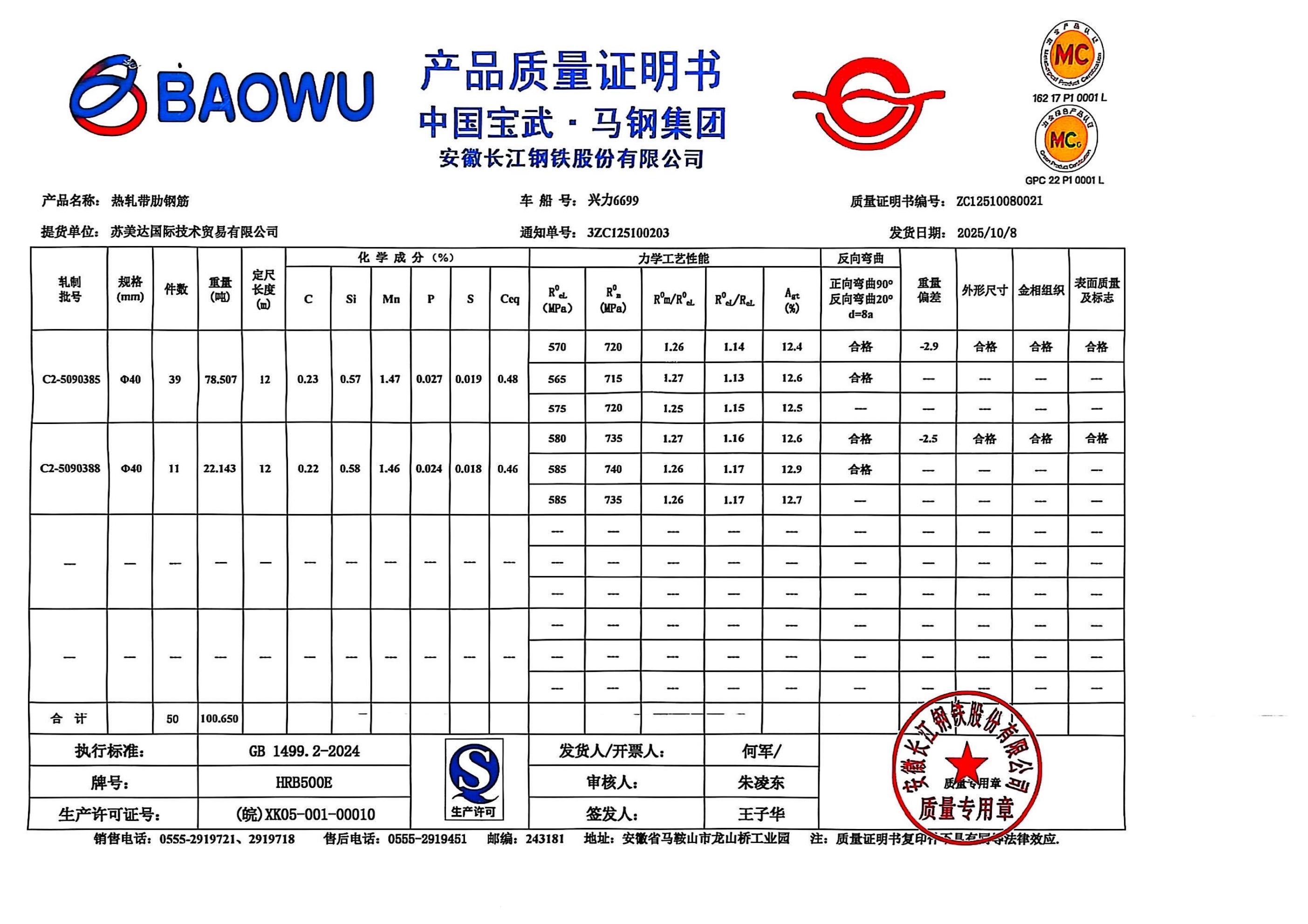 安徽长江钢铁股份有限公司提货单位:苏美达国际技术贸易有限公司