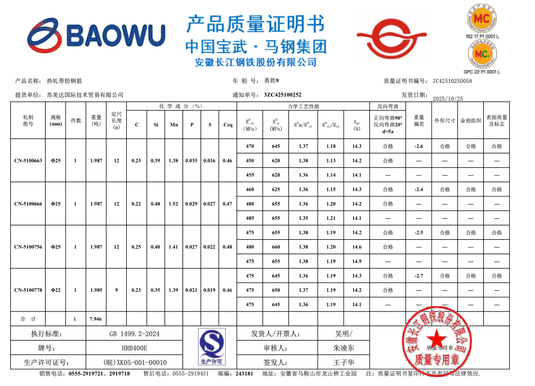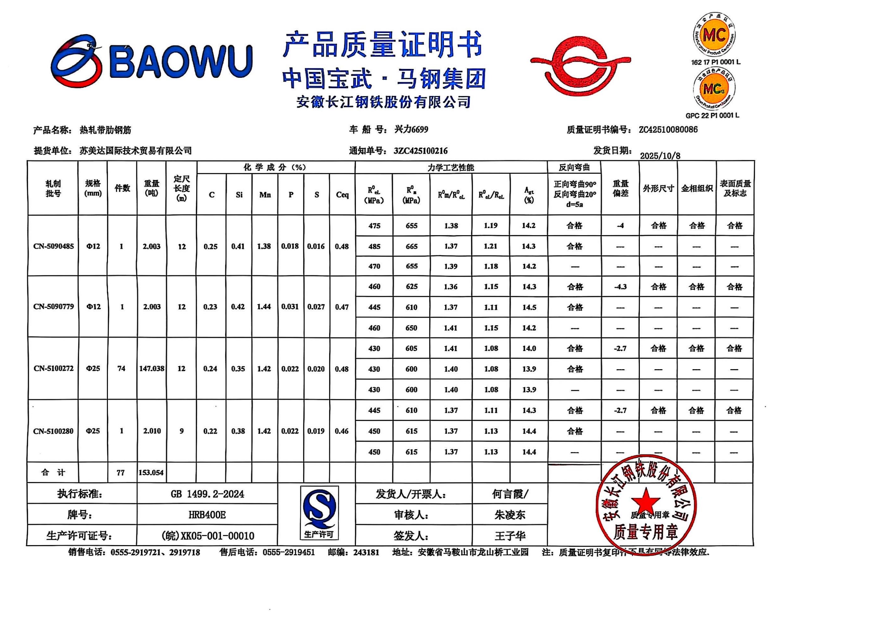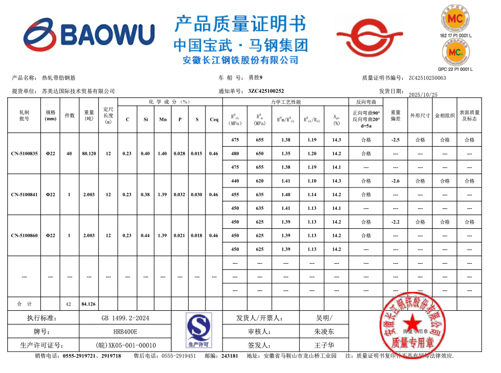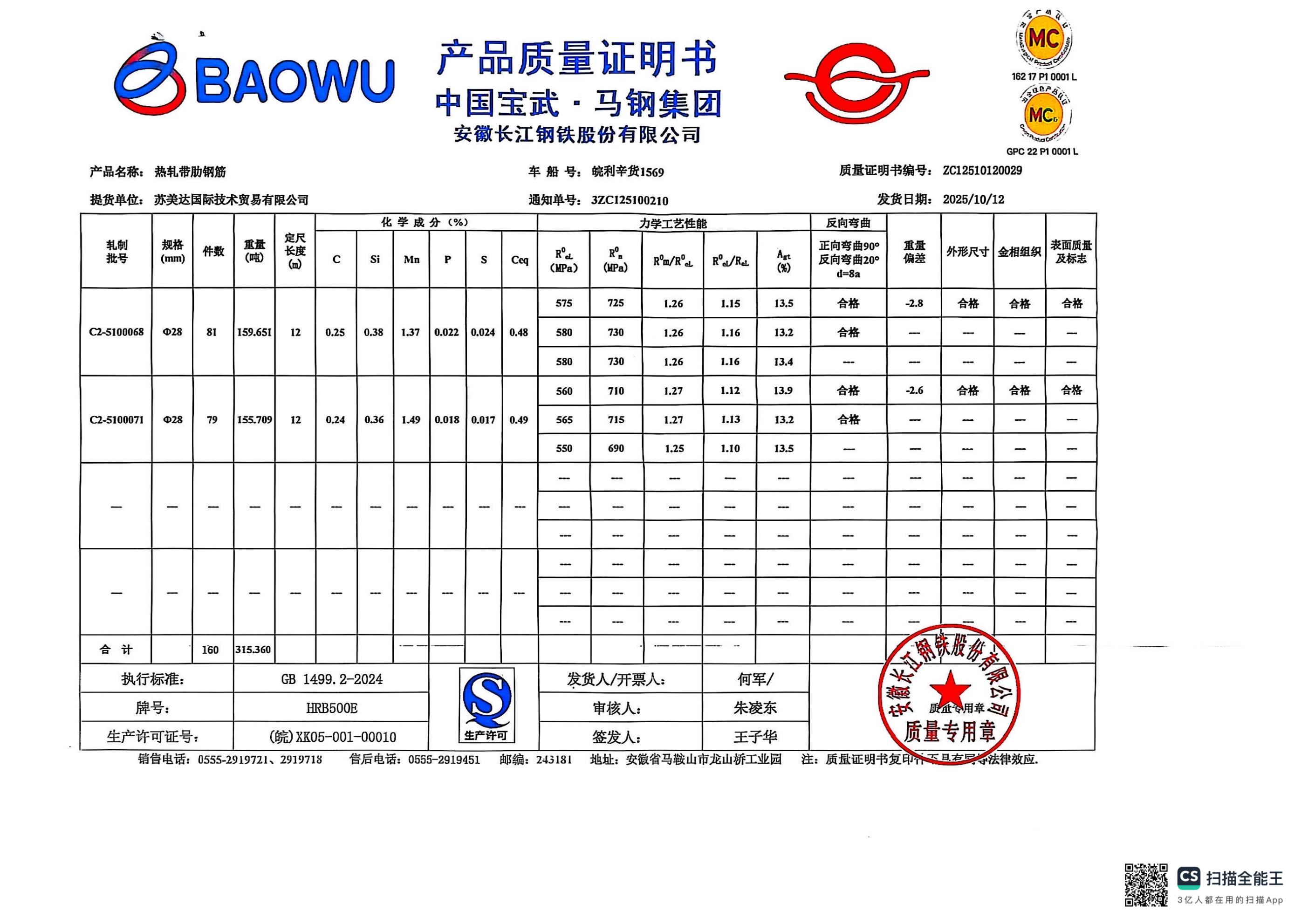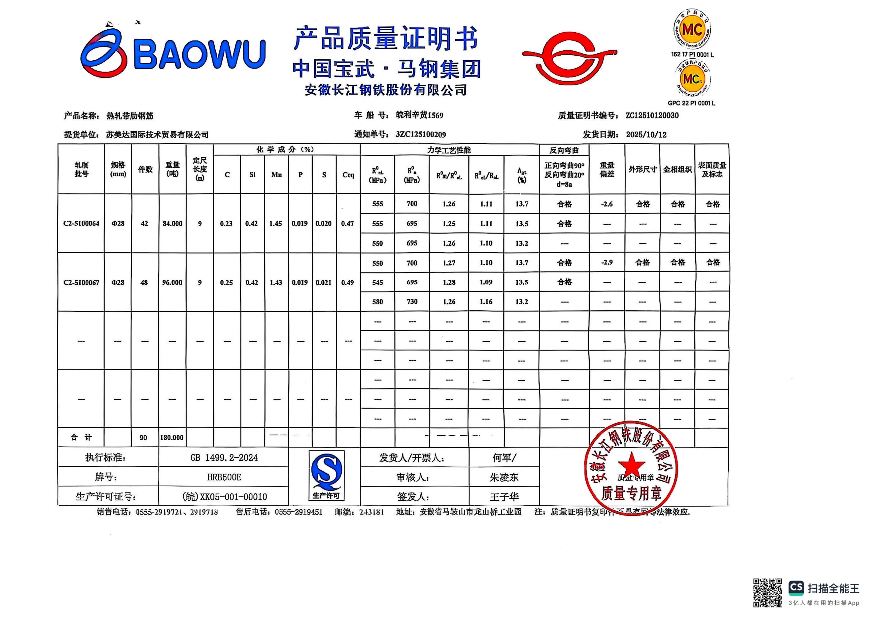 安徽长江钢铁股份有限公司提货单位:苏美达国际技术贸易有限公司