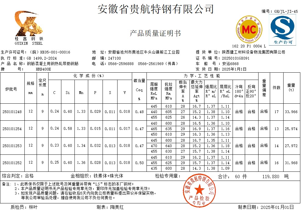 安徽省贵航特钢有限公司GH/JL-JZ-45提货单位:陕西建工材料设备物流集团有限公司3、如发现产品质量问题,请在验收后5天内向我公司质量科提出异议并保留实物,等我公司审验后处理,擅自使用我公司不负任何责任。