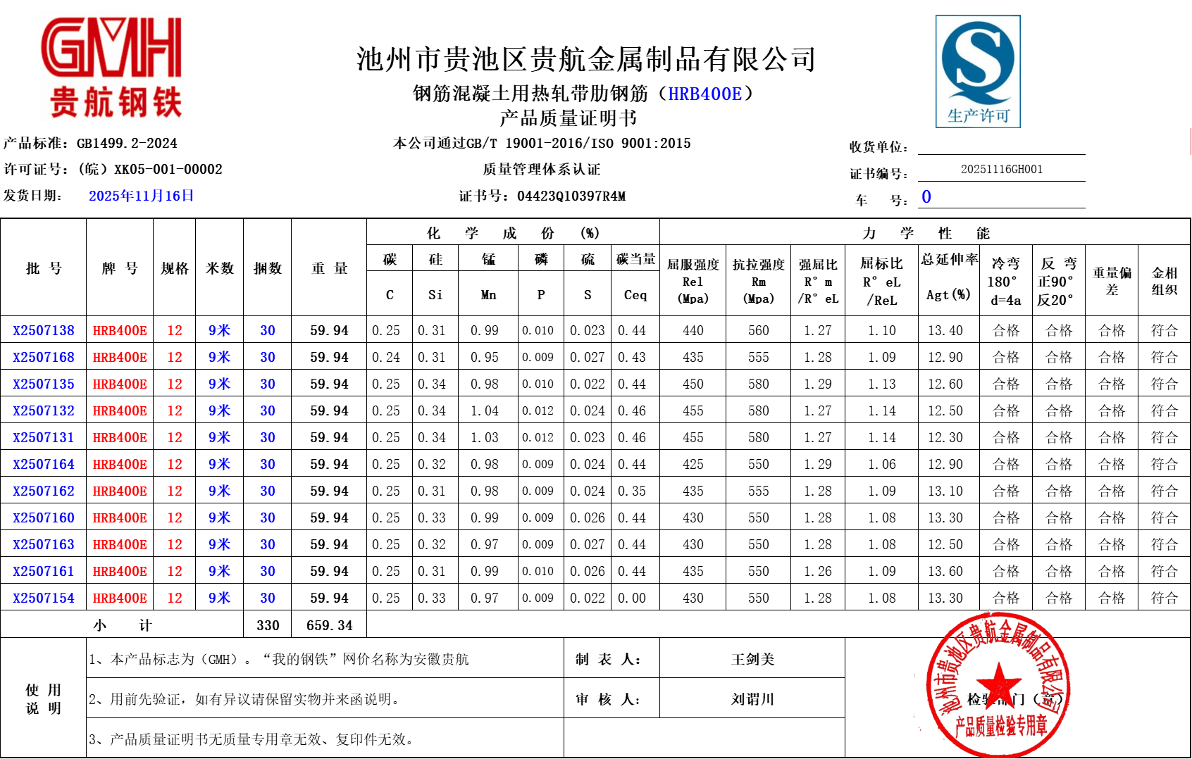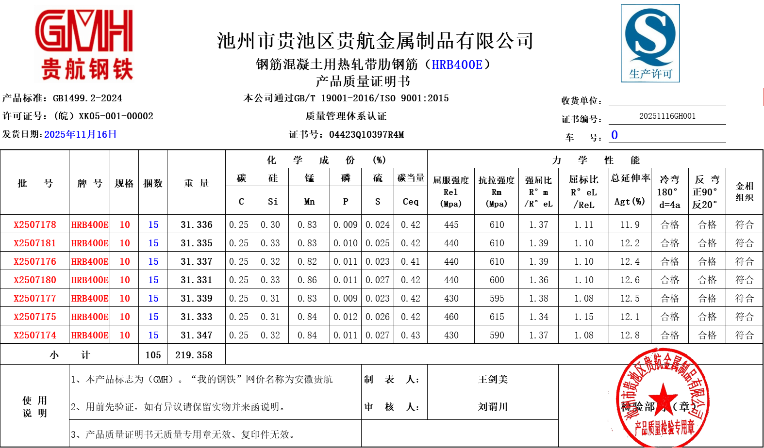 安徽省贵航特钢有限公司GH/JL-JZ-45提货单位:上海世亚电子商务有限公司3、如发现产品质量问题,请在验收后5天内向我公司质量科提出异议并保留实物,等我公司审验后处理,擅自使用我公司不负任何责任。