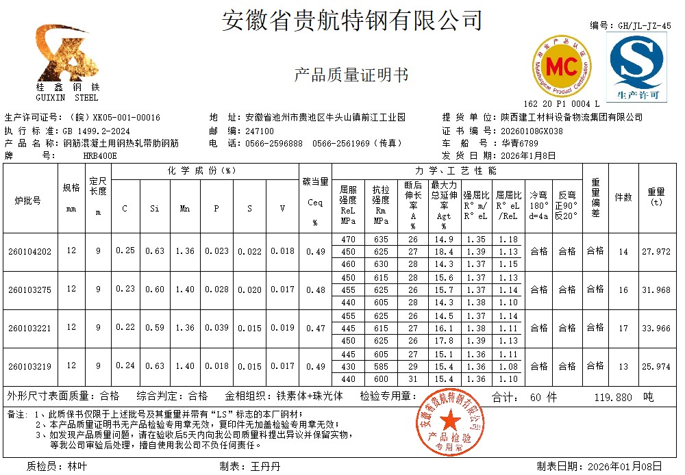 安徽省贵航特钢有限公司GH/JL-JZ-45提货单位:陕西建工材料设备物流集团有限公司3、如发现产品质量问题,请在验收后5天内向我公司质量科提出异议并保留实物,等我公司审验后处理,擅自使用我公司不负任何责任。