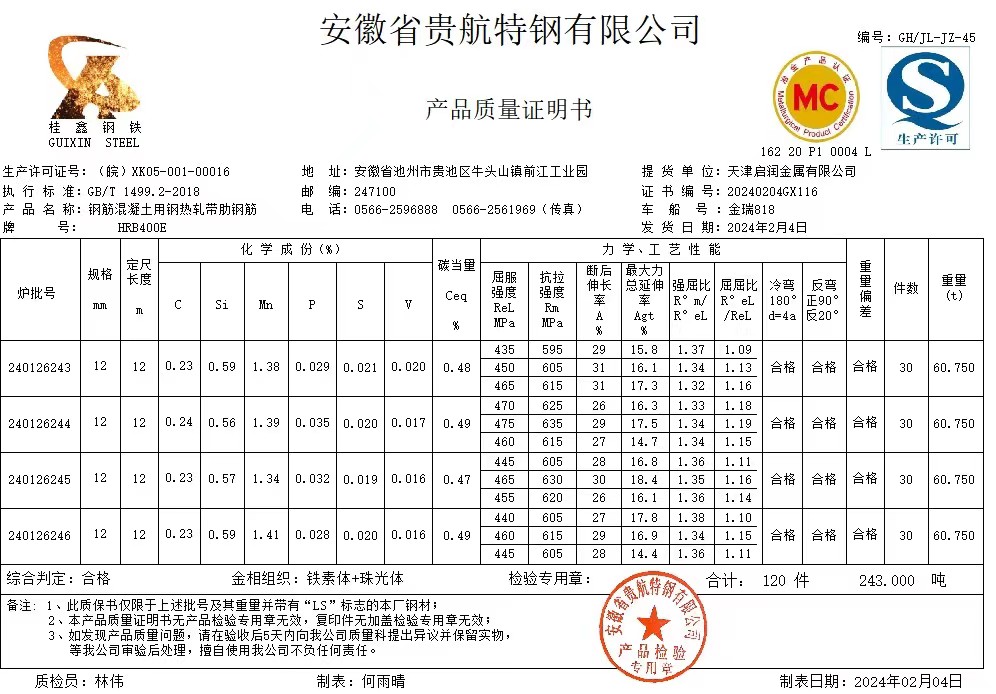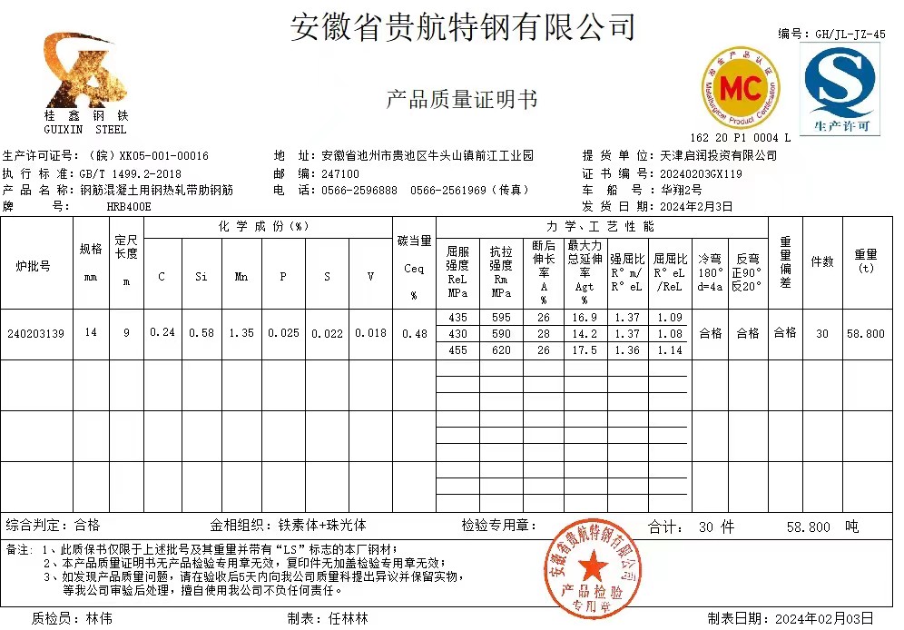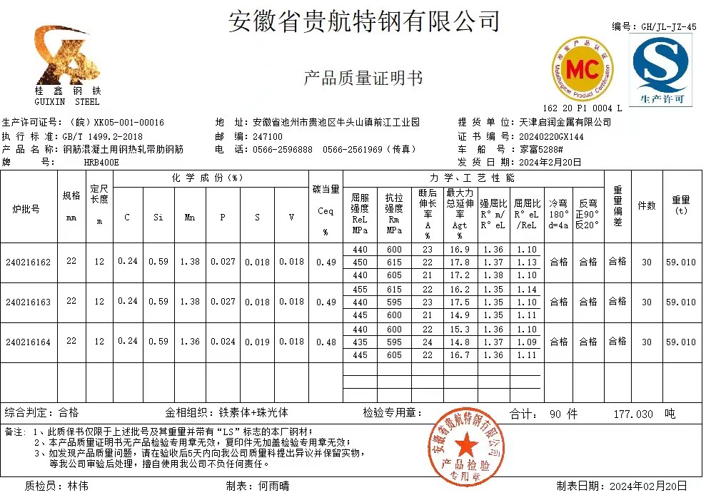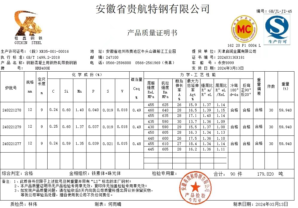 安徽省贵航特钢有限公司GH/JL-JZ-45提货单位:天津启润金属有限公司3、如发现产品质里问题,请在验收后5天内向我公司质里科提出异议并保留实物,等我公司审验后处理,擅自使用我公司不负任何责任。