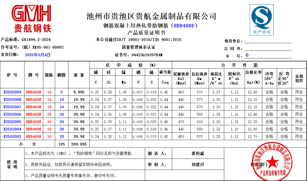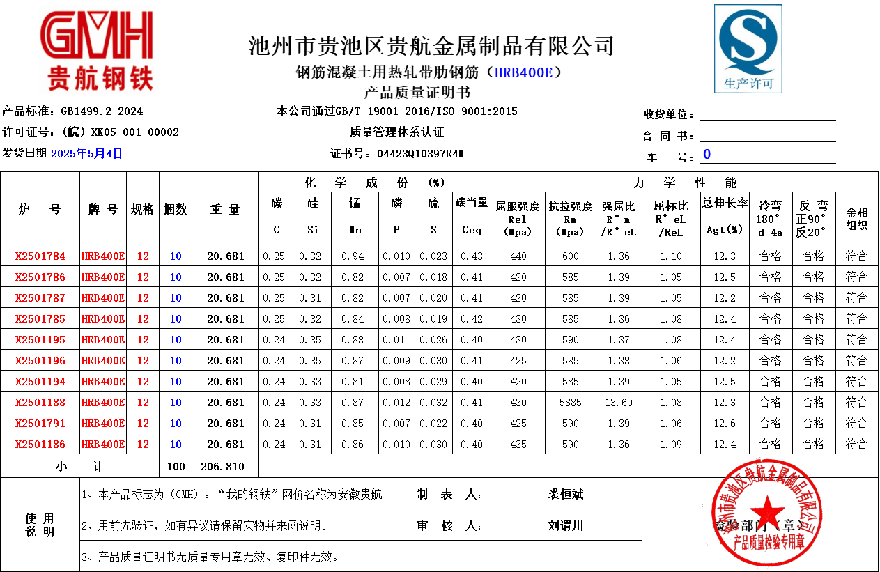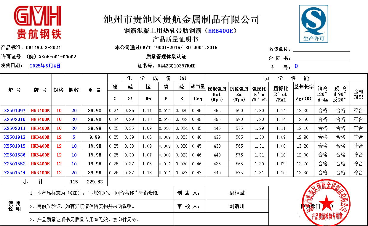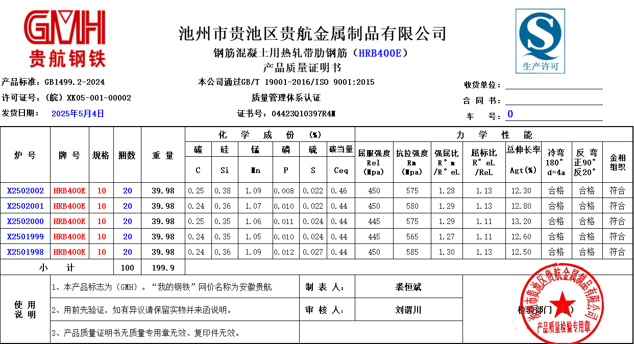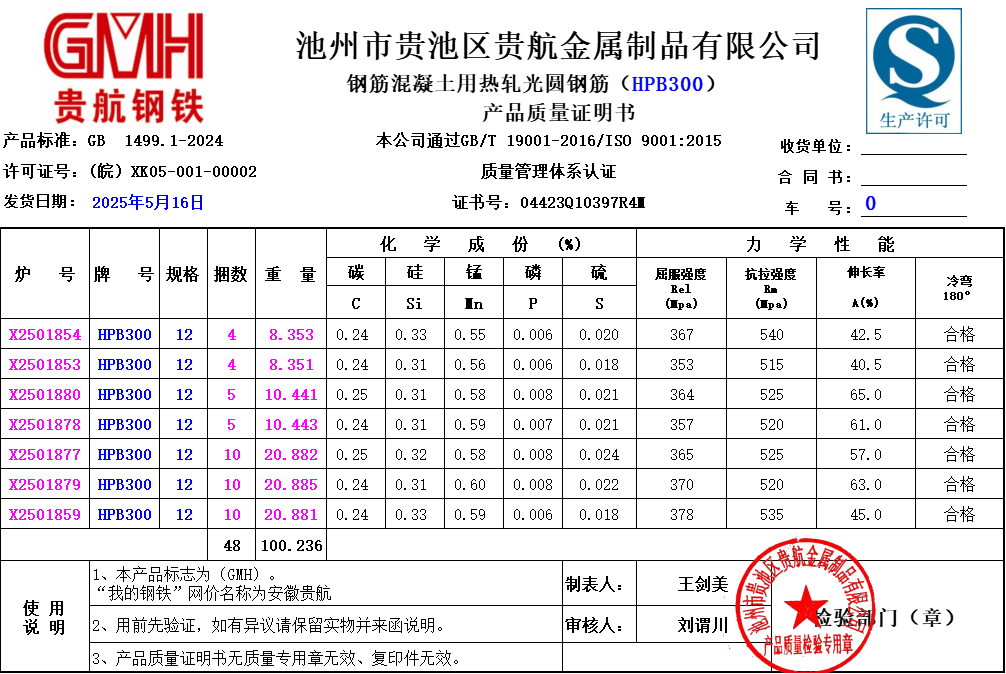 安徽省贵航特钢有限公司GH/JL-JZ-45提货单位:国贸启润(上海)有限公司3、如发现产品质量问题,请在验收后5天内向我公司质量科提出异议并保留实物,等我公司审验后处理,擅自使用我公司不负任何责任。