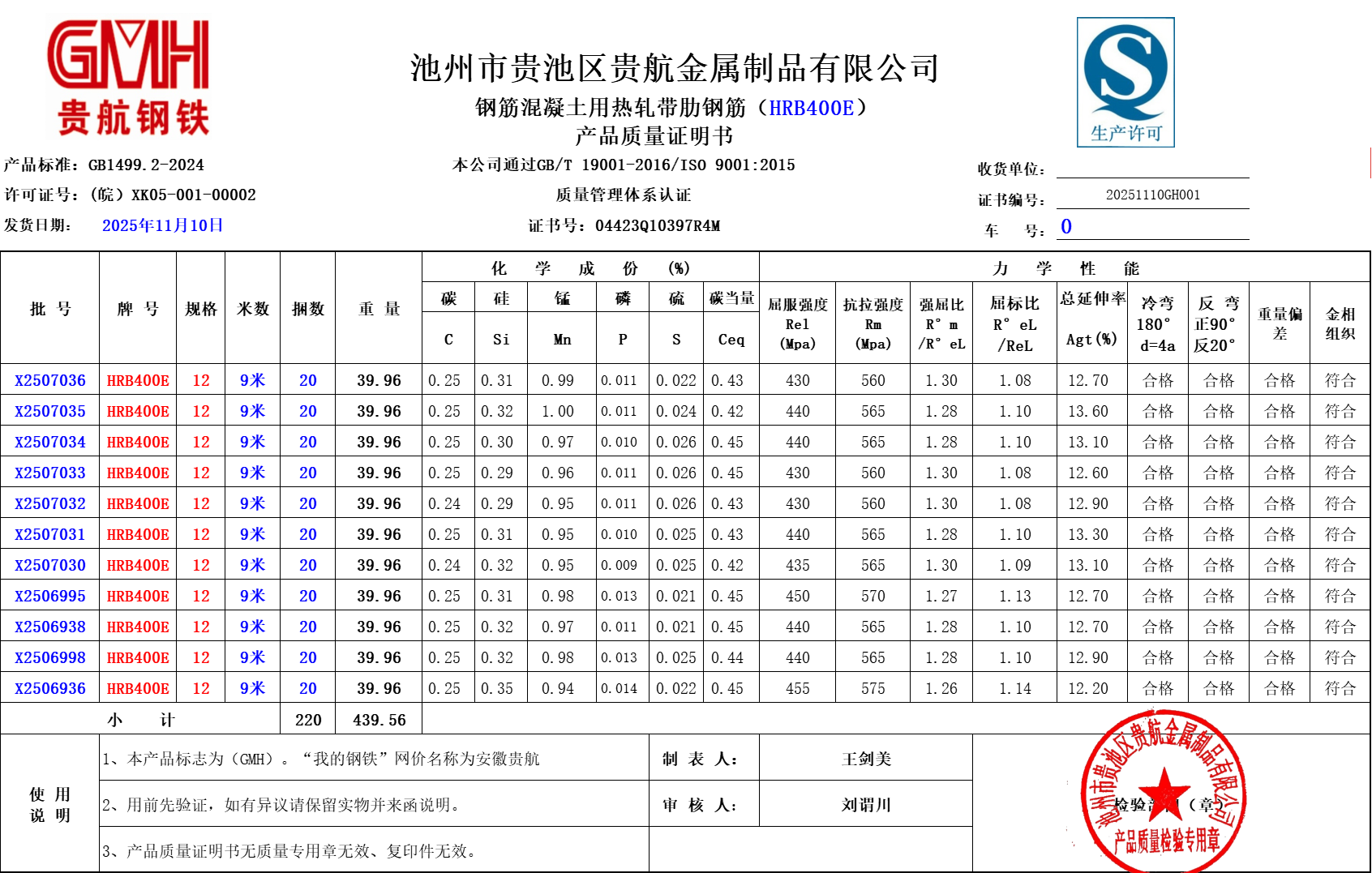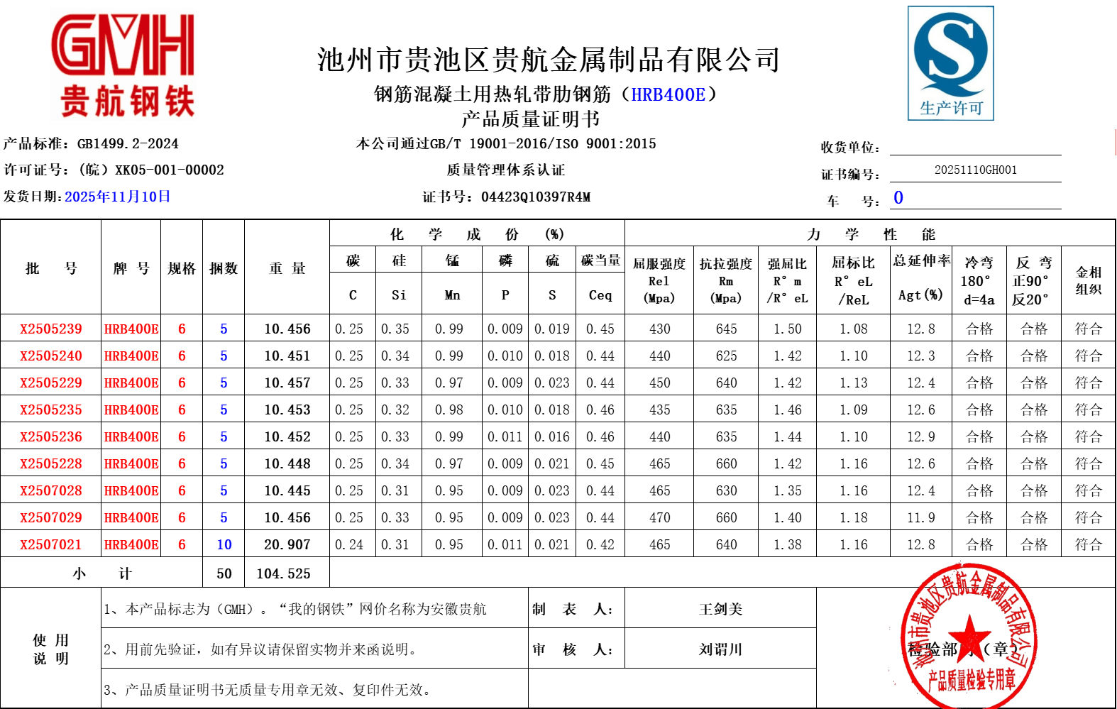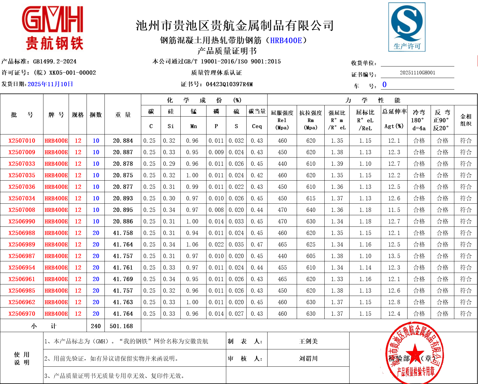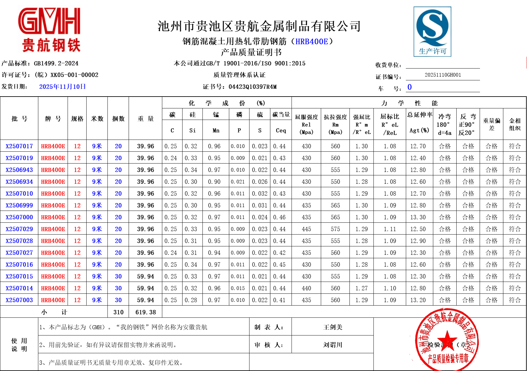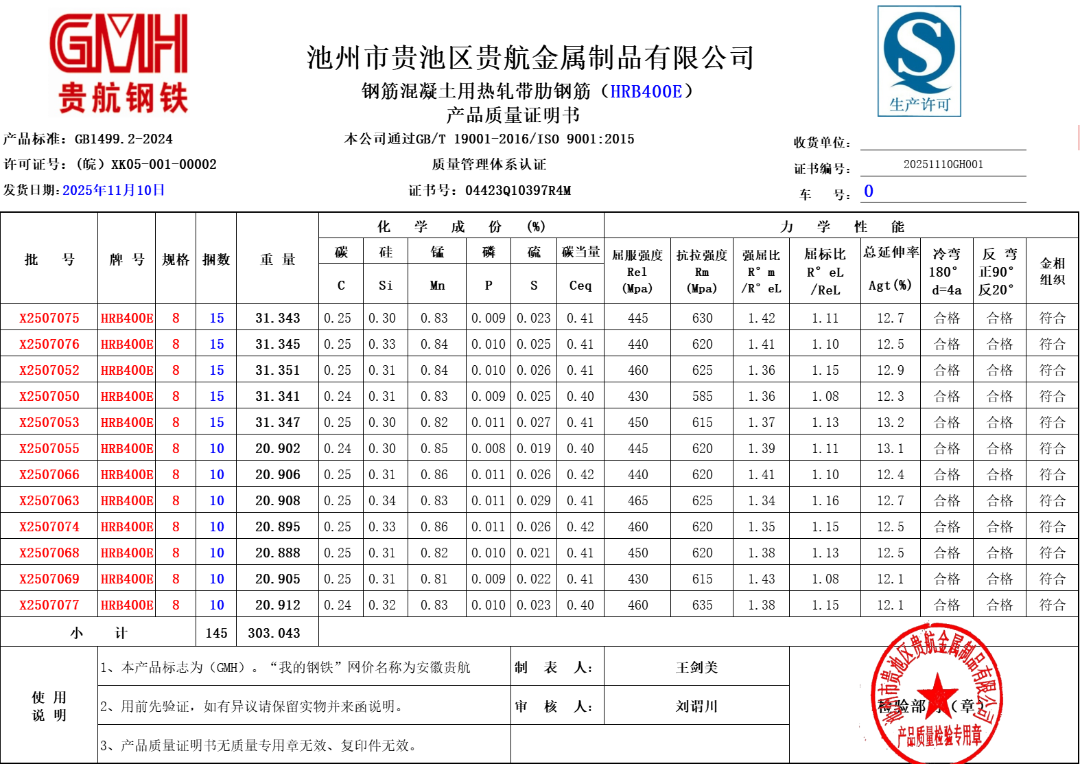 安徽省贵航特钢有限公司GH/JL-JZ-45提货单位:上海世亚电子商务有限公司3、如发现产品质量问题,请在验收后5天内向我公司质量科提出异议并保留实物,等我公司审验后处理,擅自使用我公司不负任何责任。