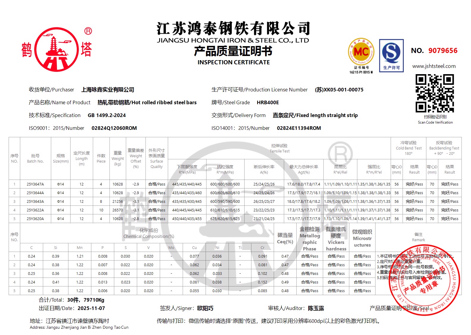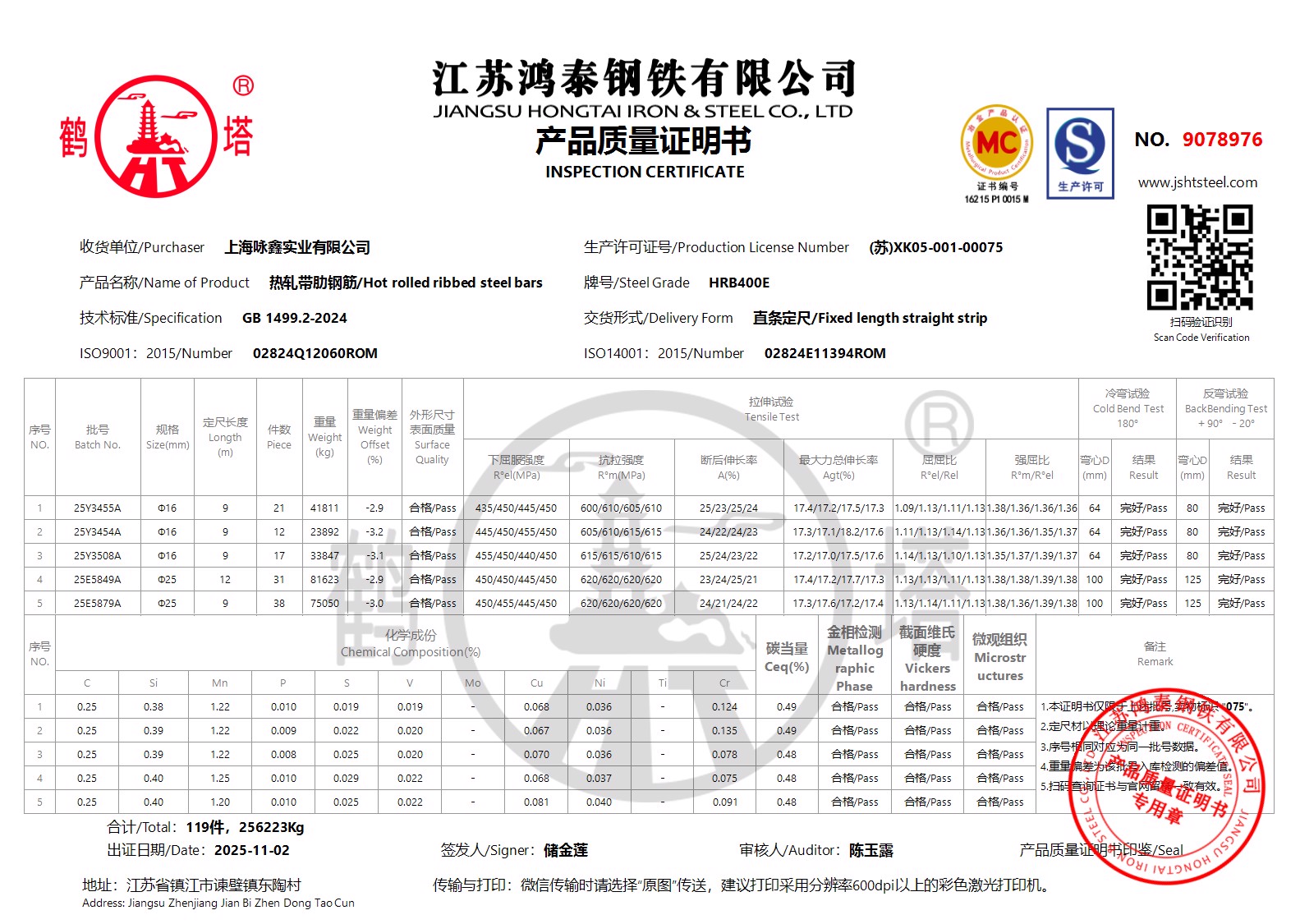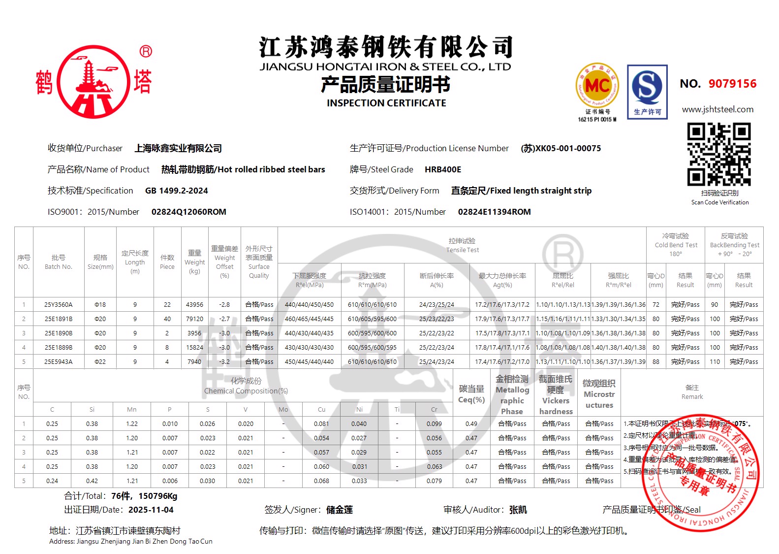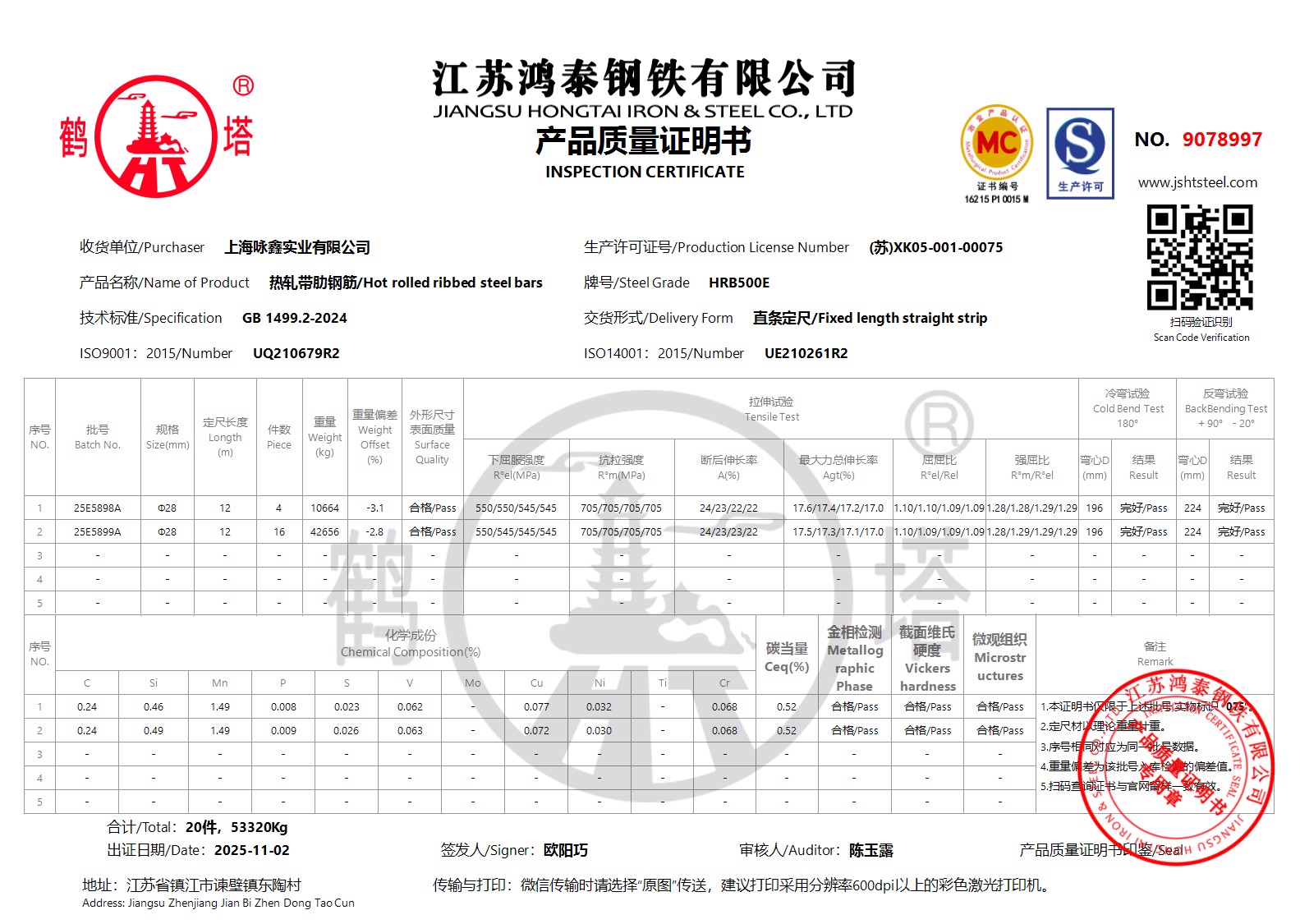 江苏鸿泰钢铁有限公司9079327上海咏鑫实业有限公司NOHIIV