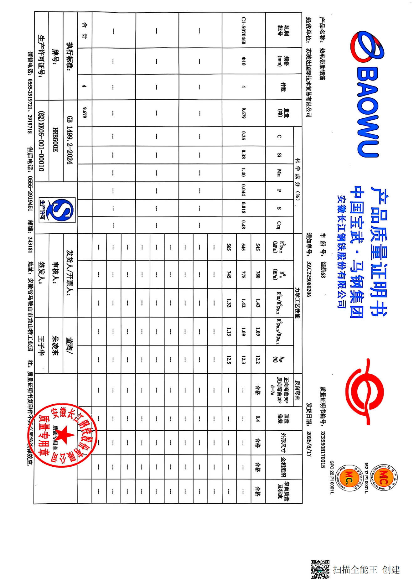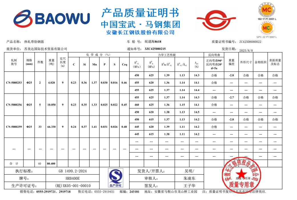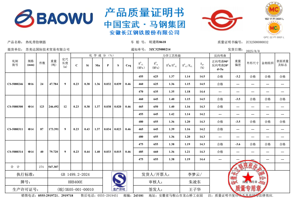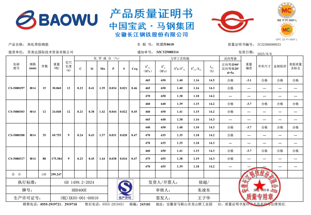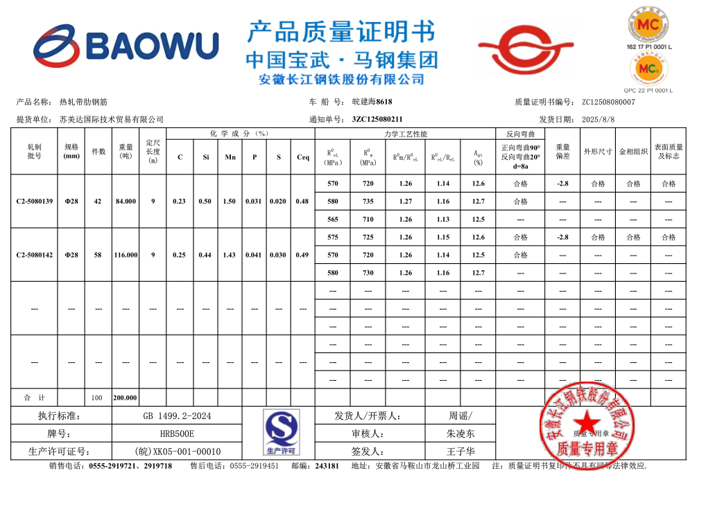 安徽长江钢铁股份有限公司提货单位:苏美达国际技术贸易有限公司