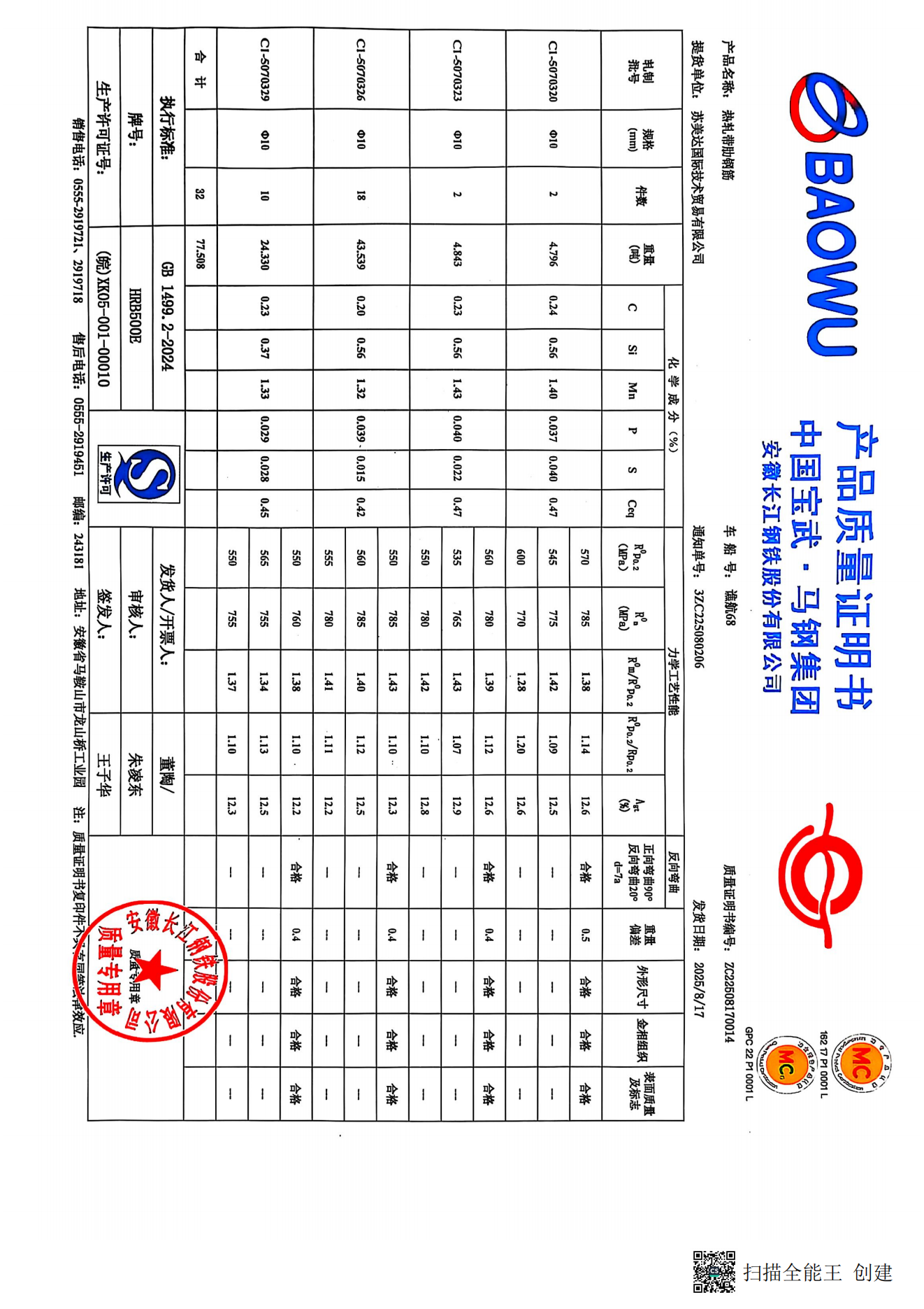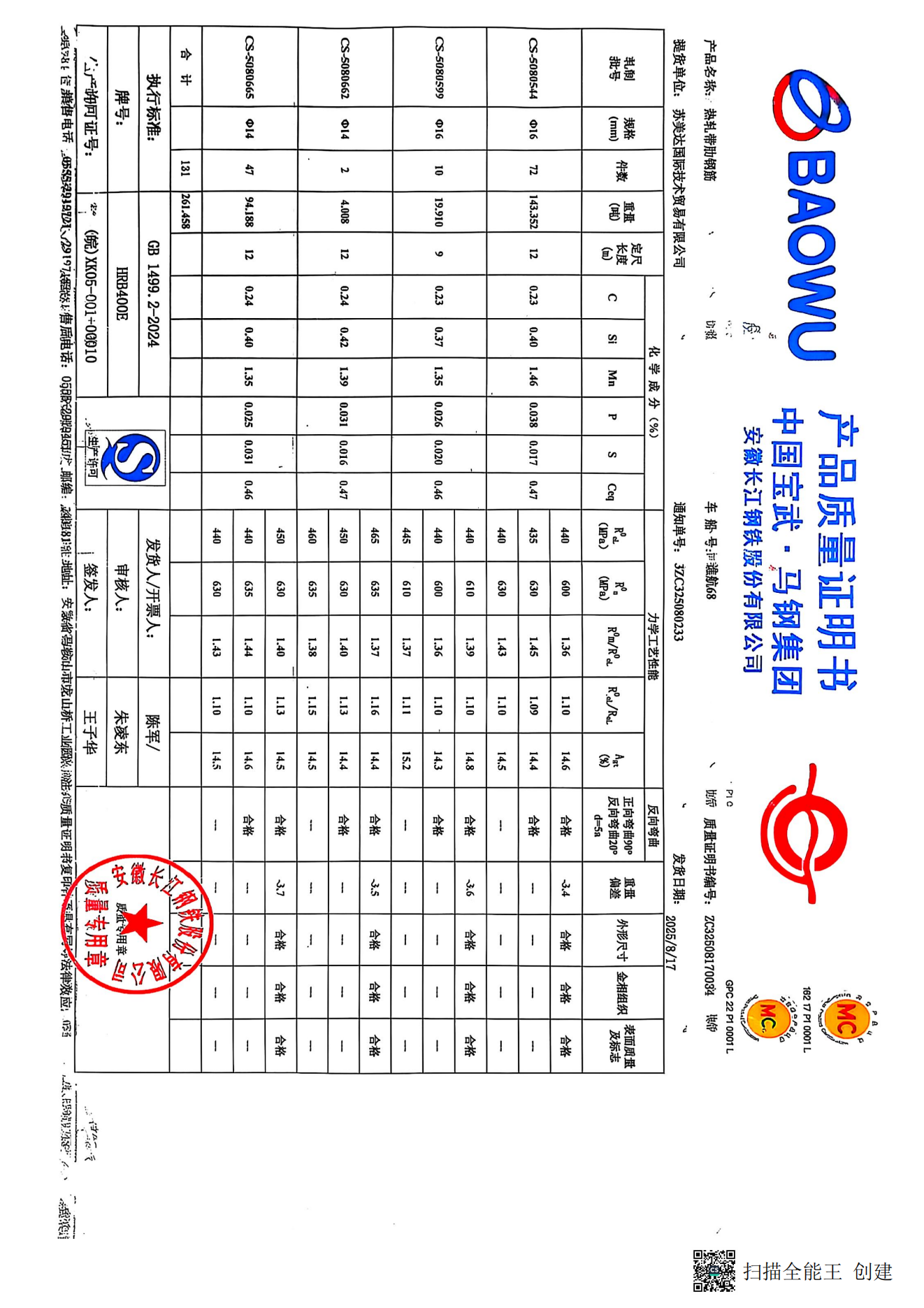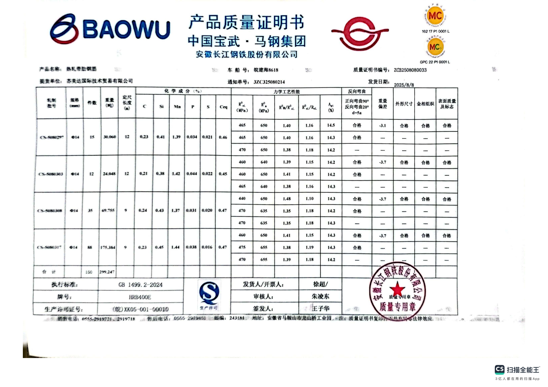 安徽长江钢铁股份有限公司提货单位:苏美达国际技术贸易有限公司