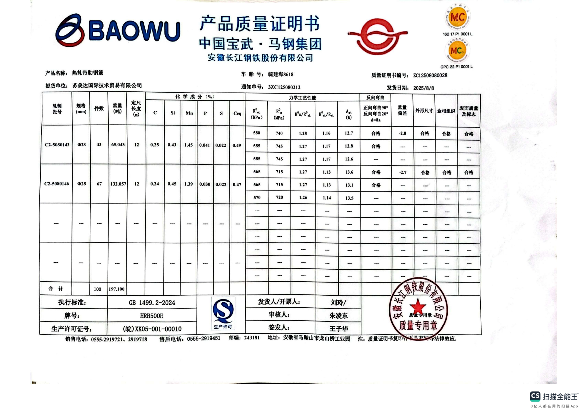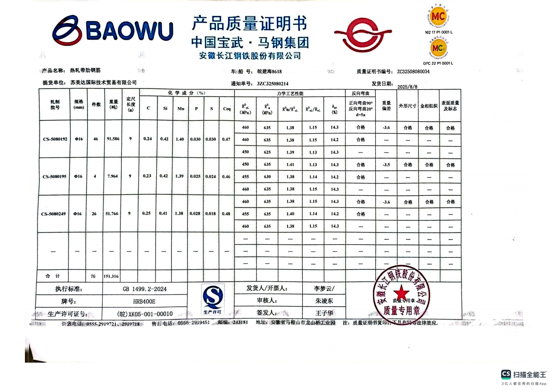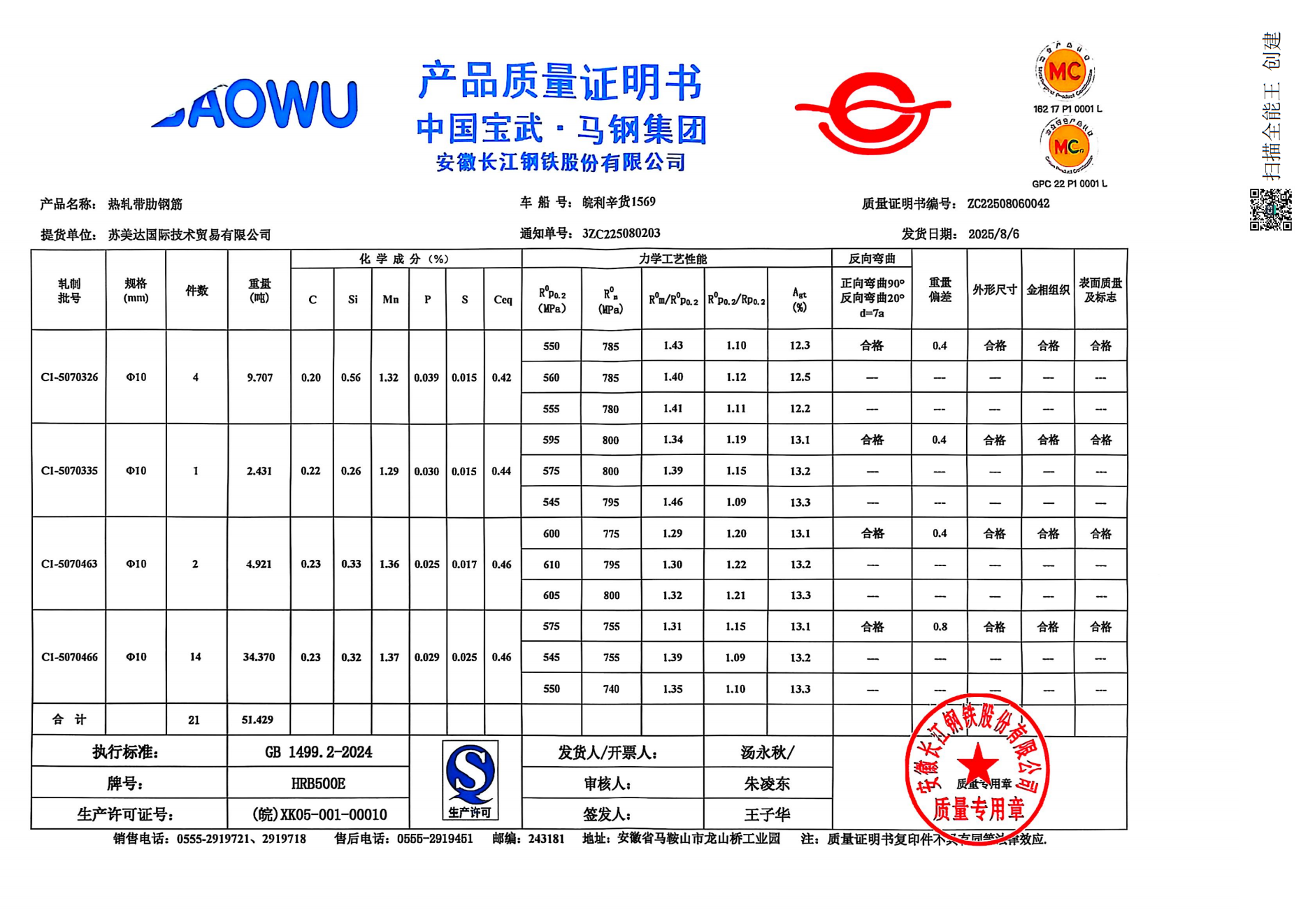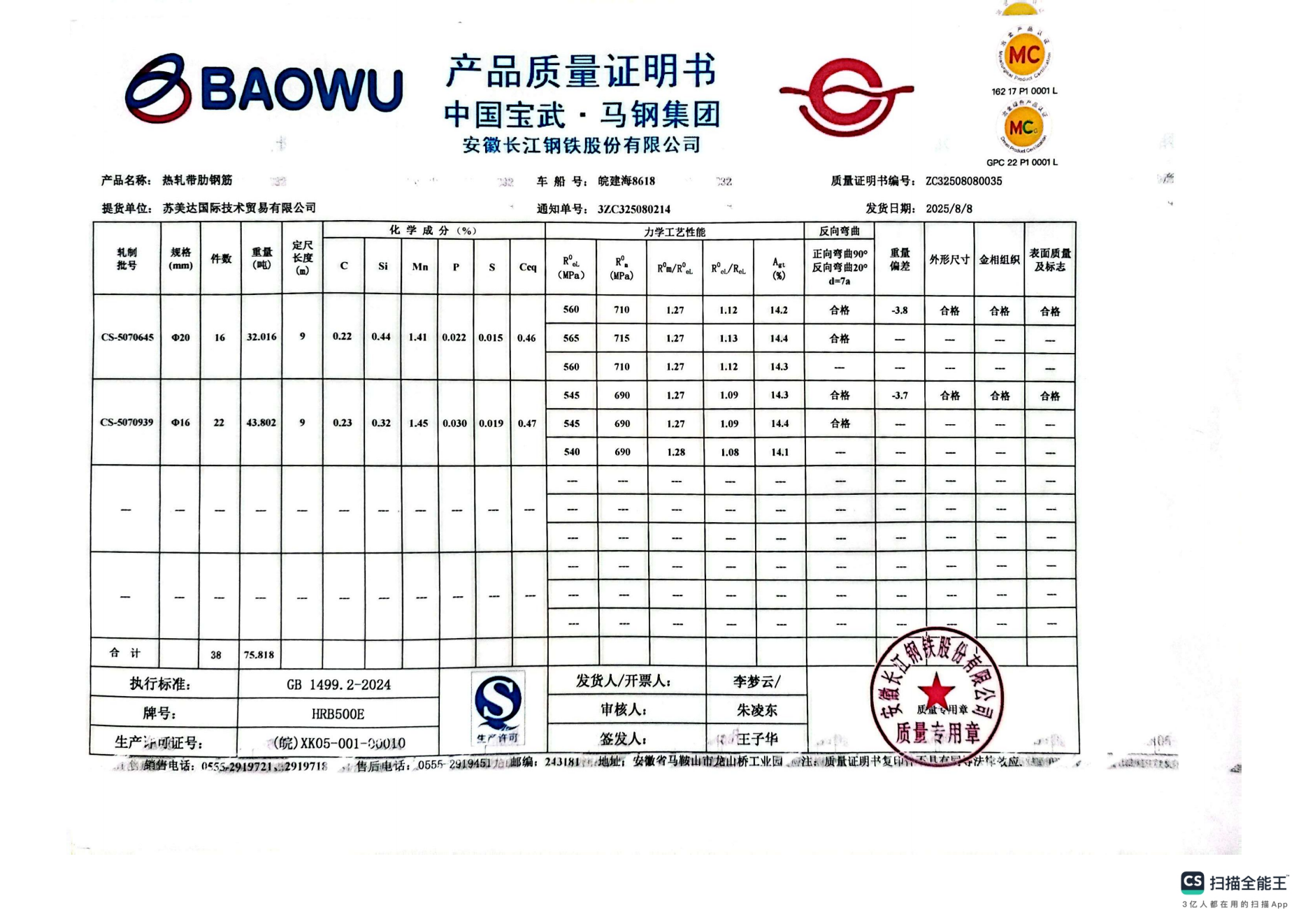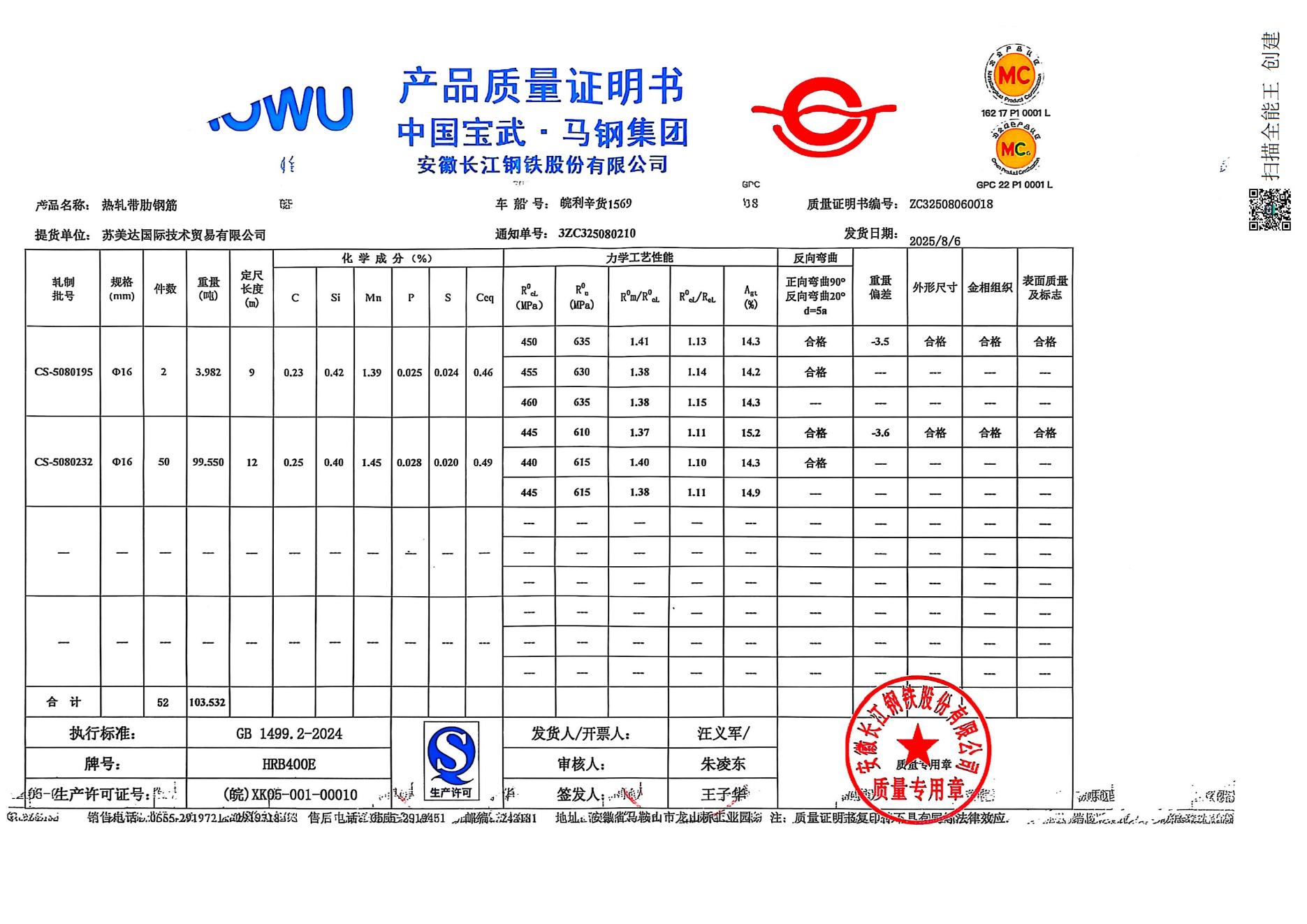 安徽长江钢铁股份有限公司提货单位:苏美达国际技术贸易有限公司