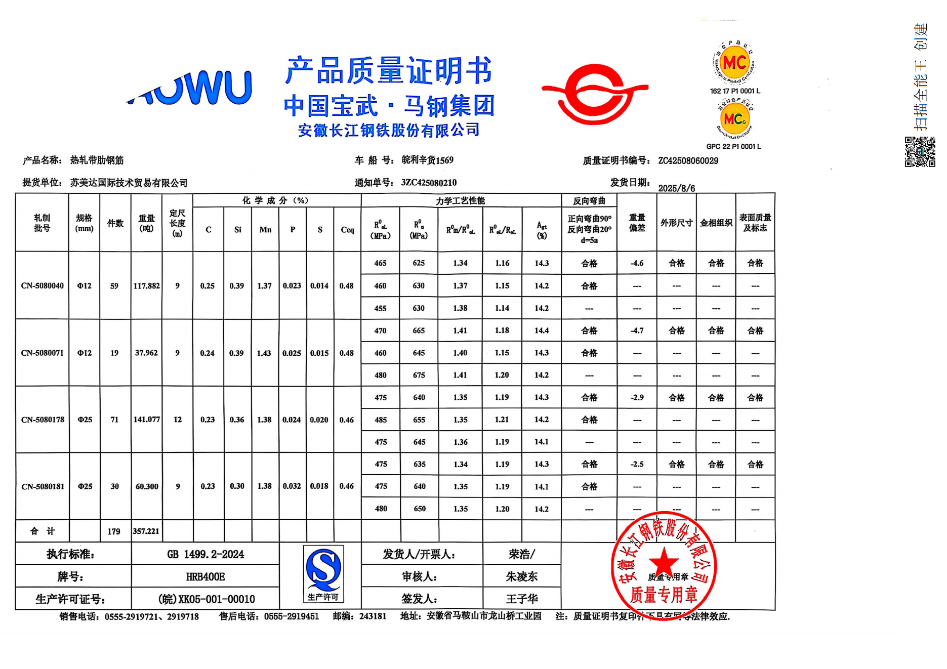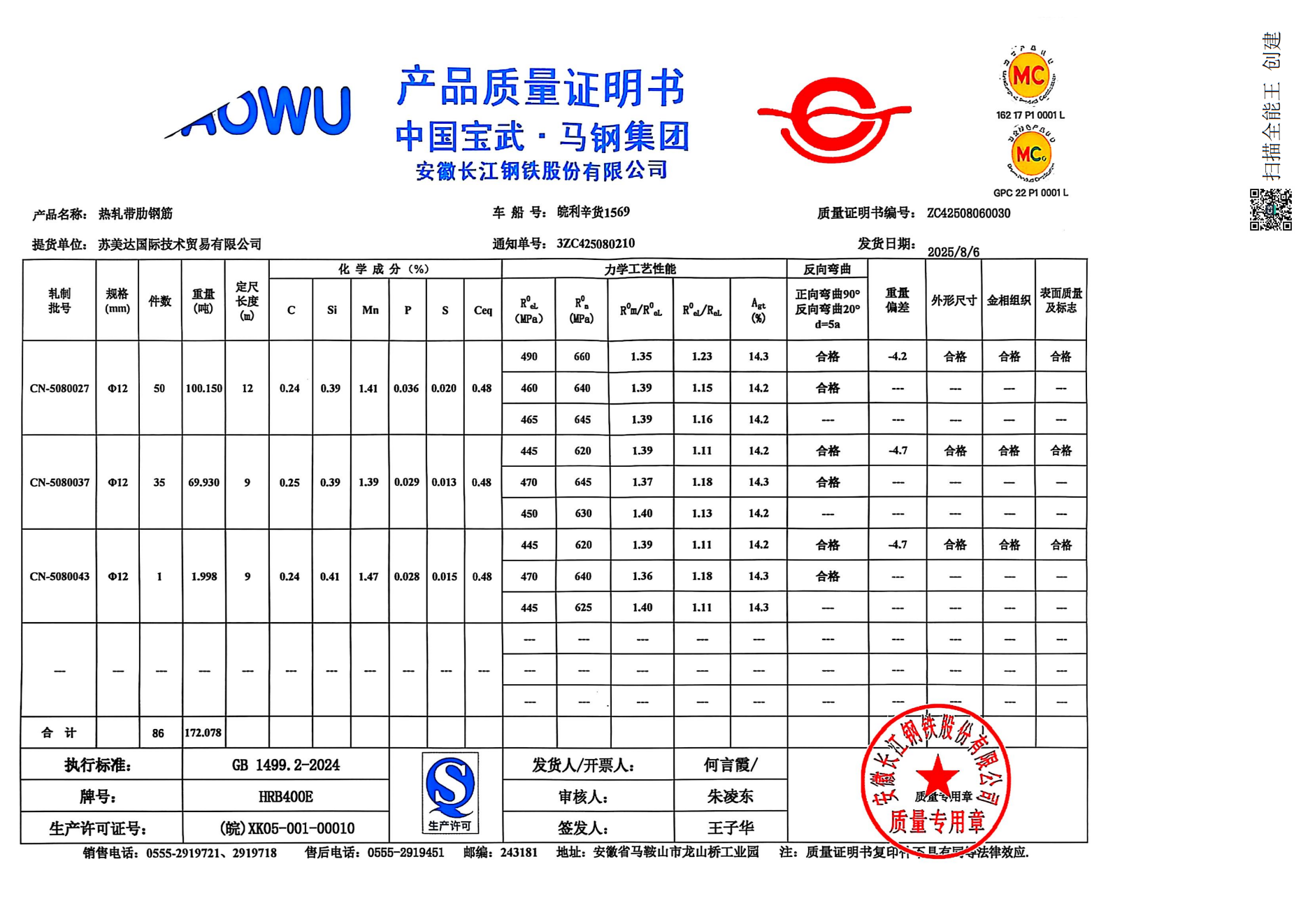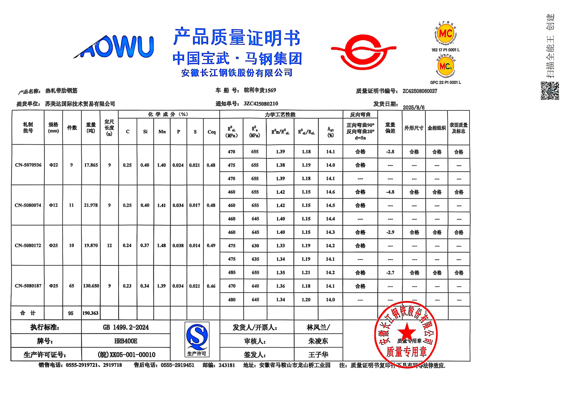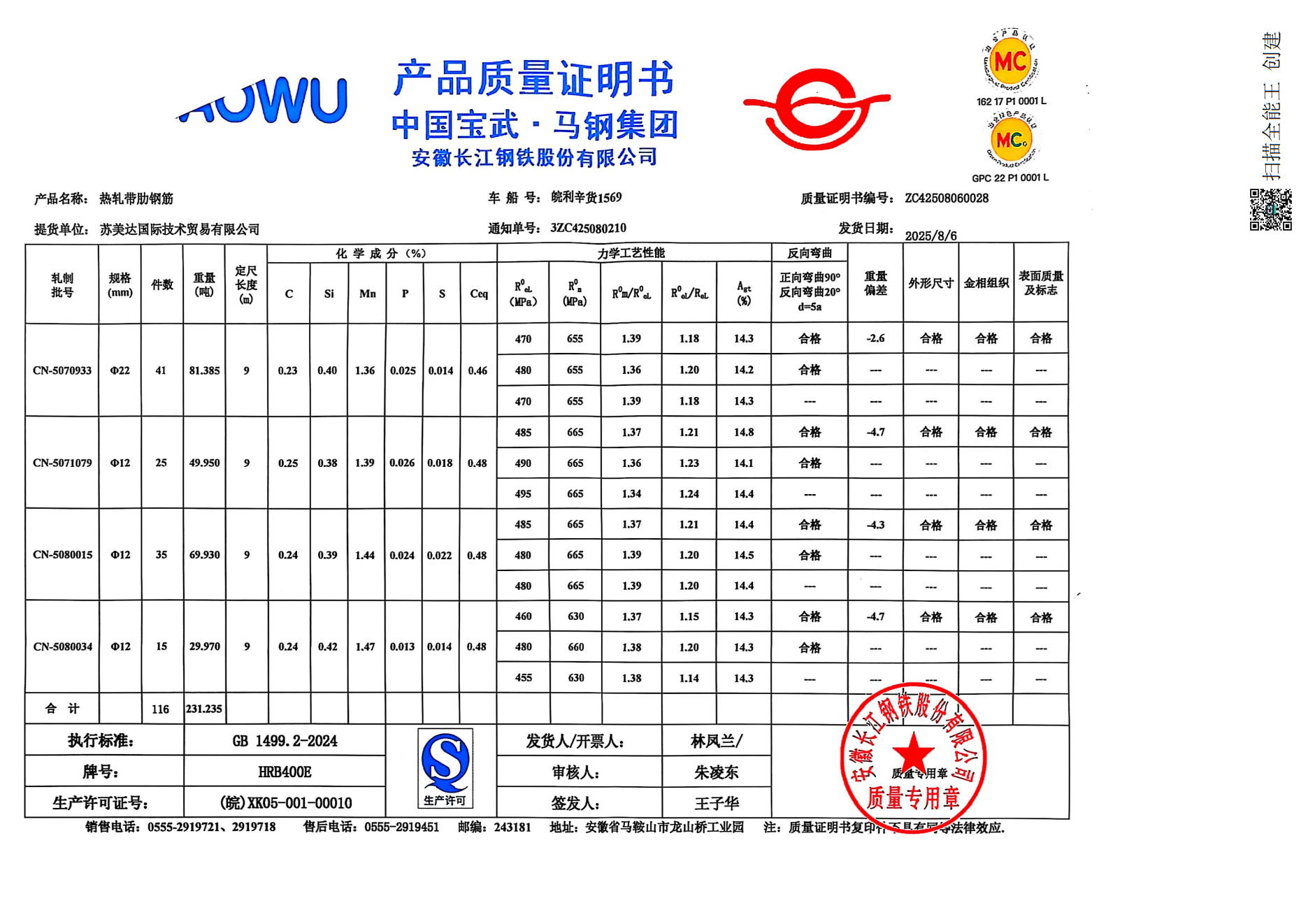 安徽长江钢铁股份有限公司提货单位:苏美达国际技术贸易有限公司