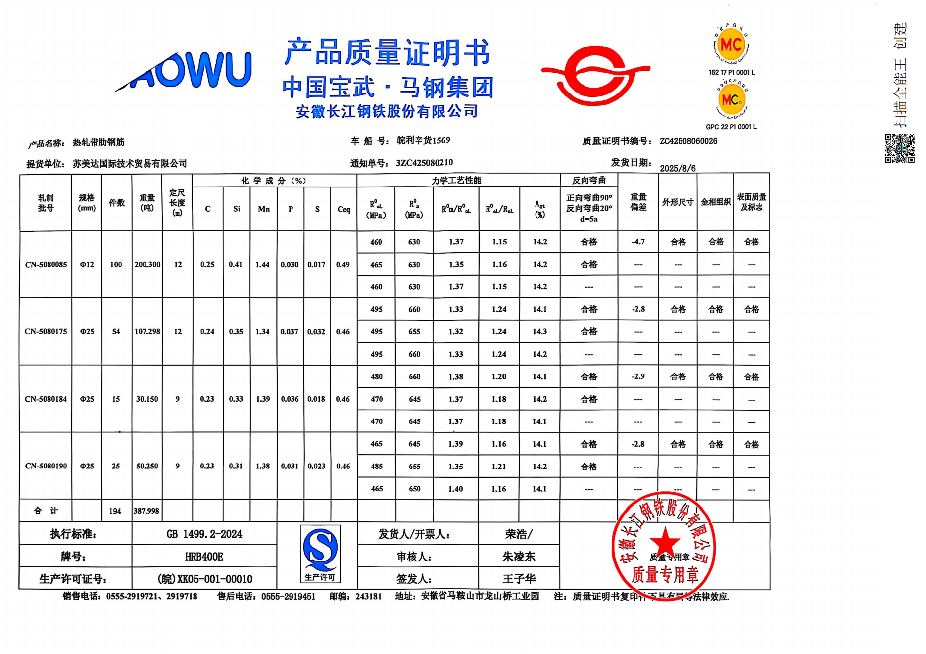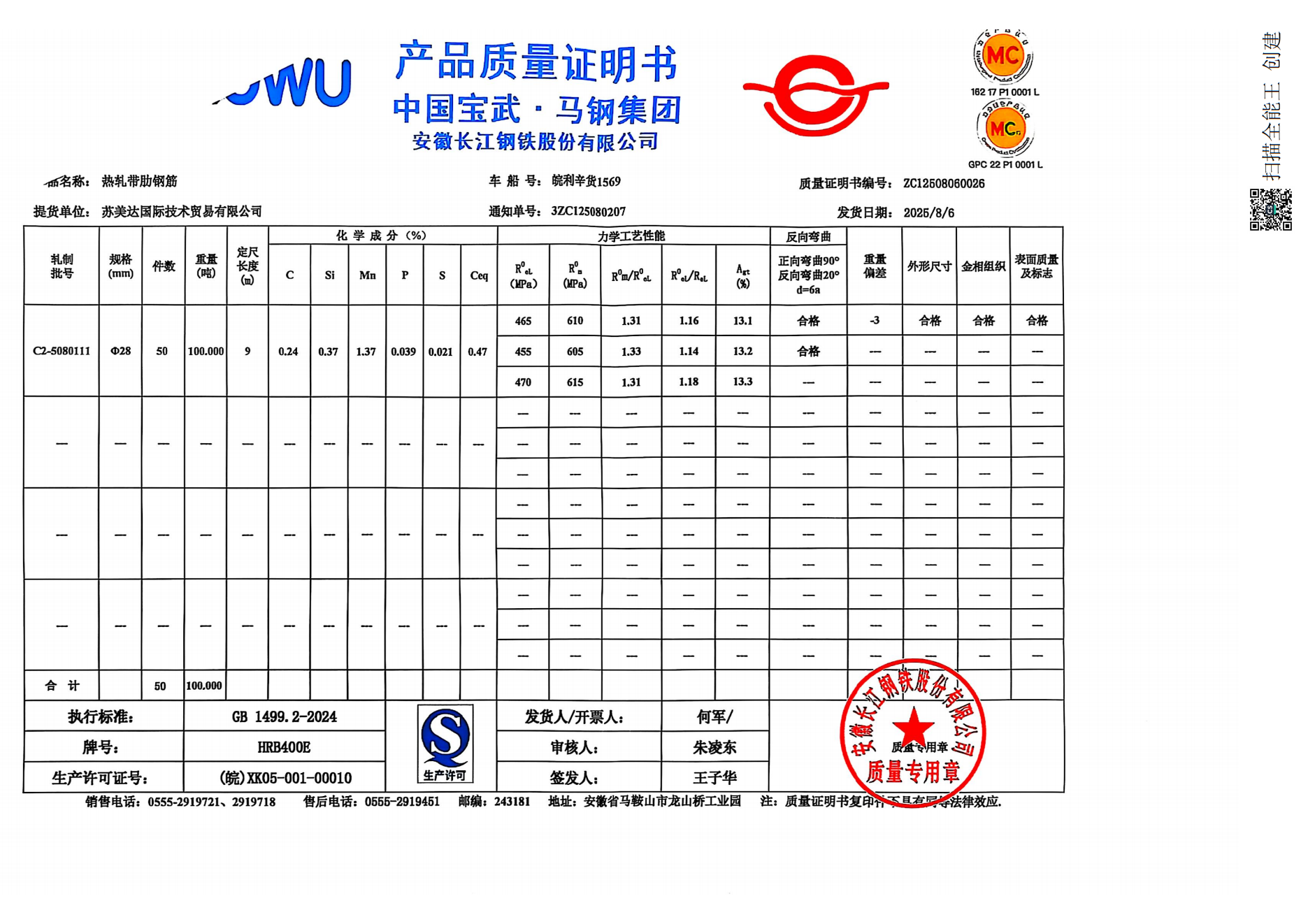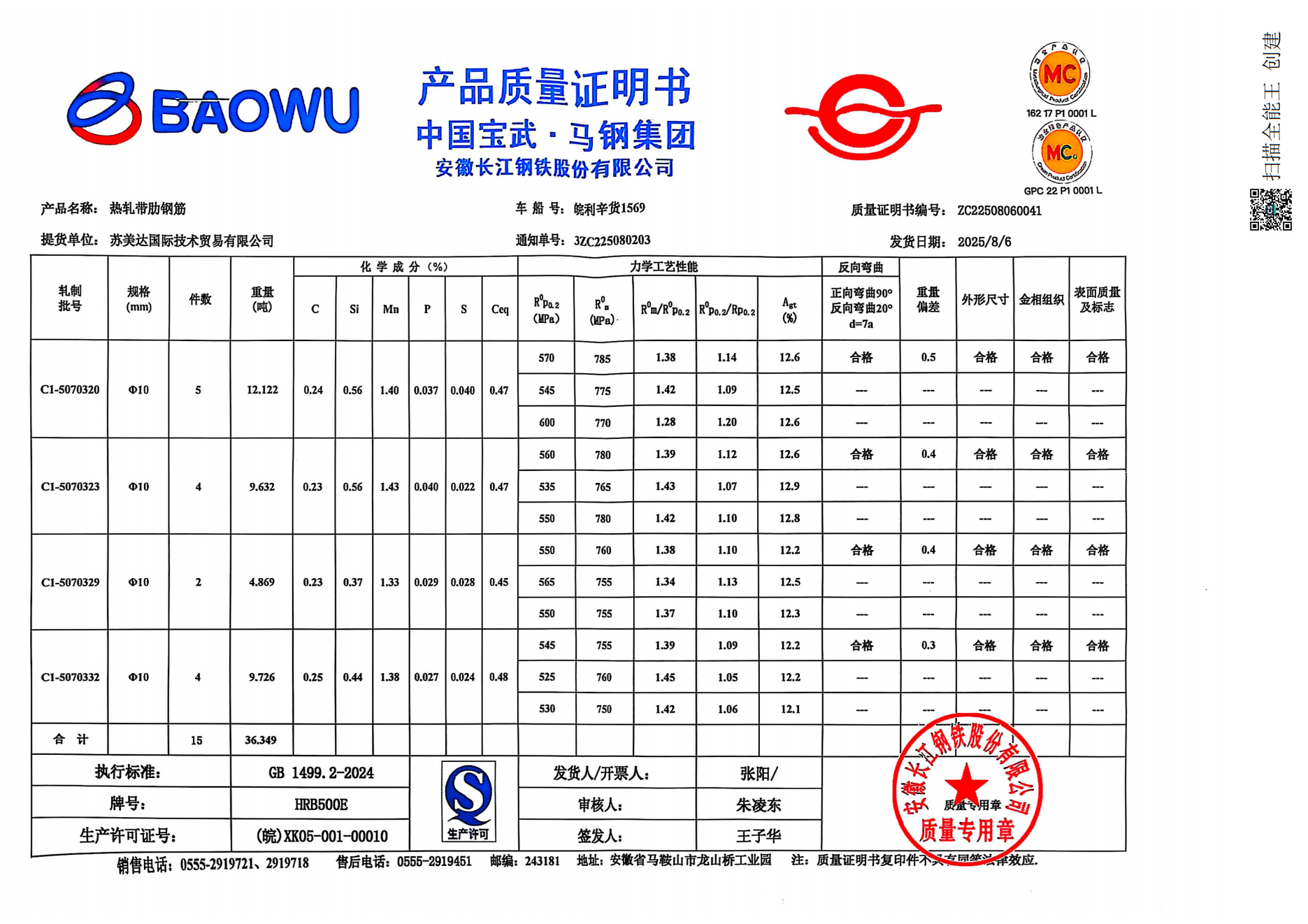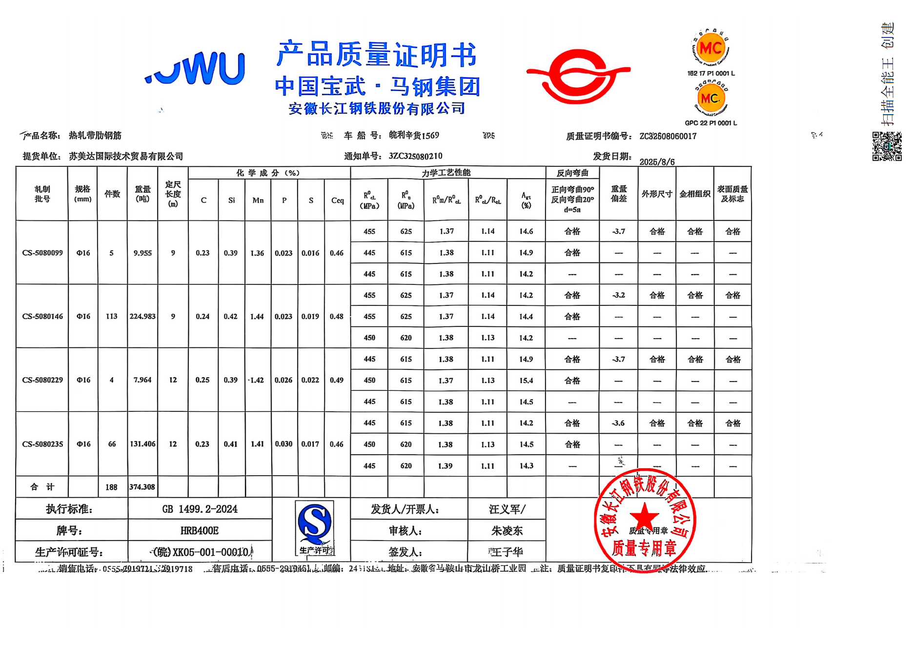安徽长江钢铁股份有限公司提货单位:苏美达国际技术贸易有限公司
