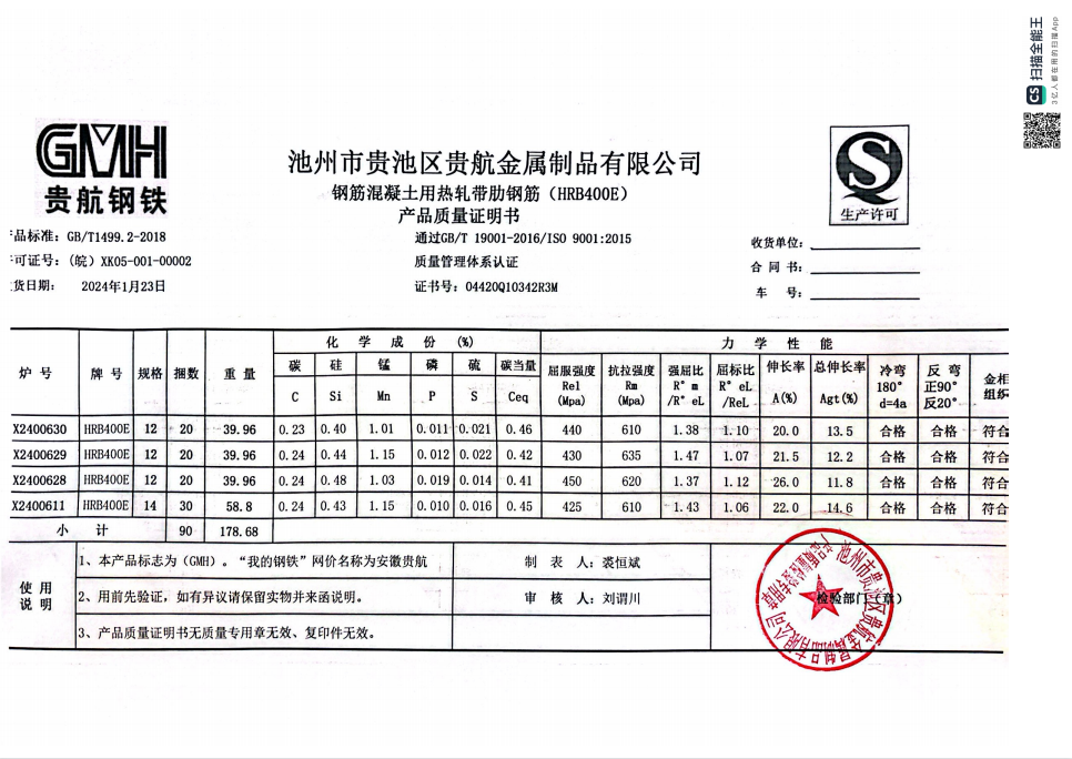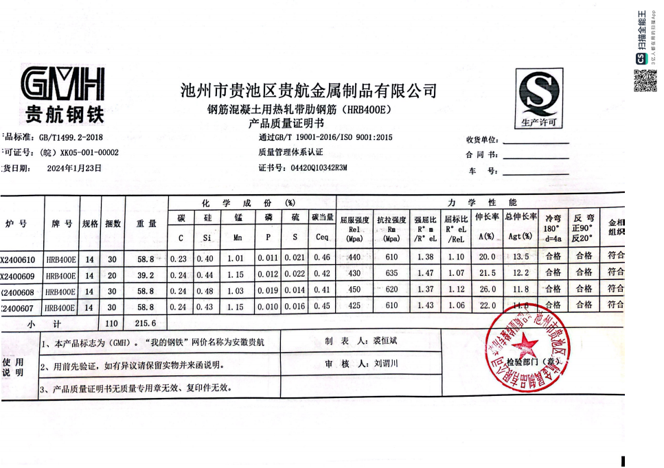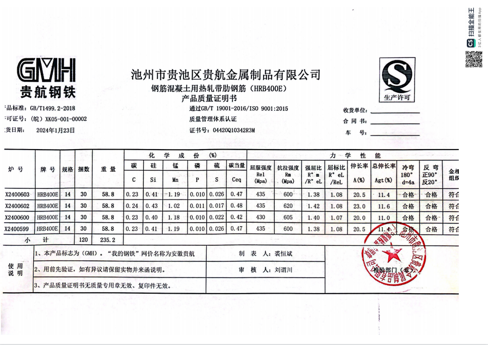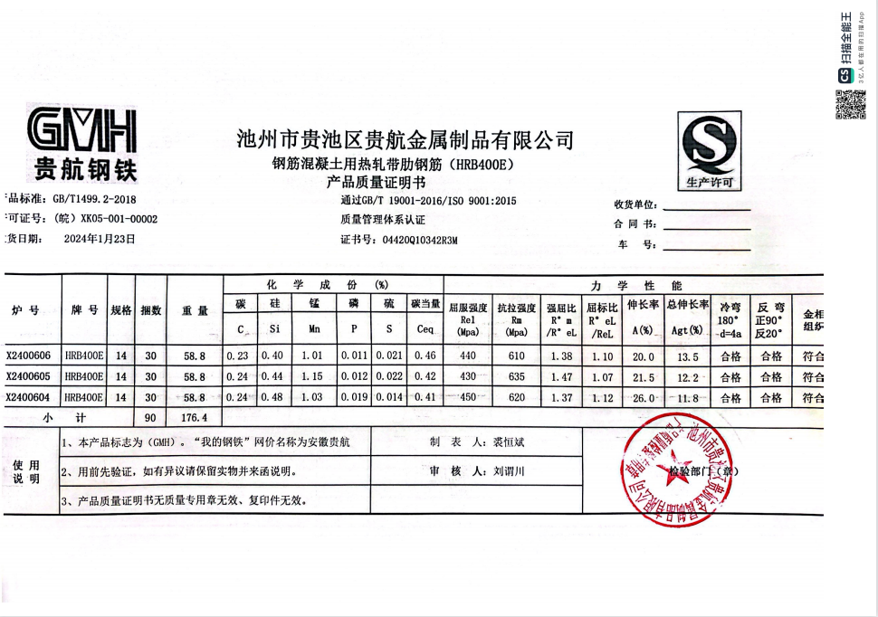 安徽省贵航特钢有限公司GH/JL-JZ-45提货单位:上海咏鑫实业有限公司3、如发现产品质重问题,请在验收后5天内向我公司质里科提出异议并保留实物,等我公司审验后处理,擅自使用我公司不负任何责任。