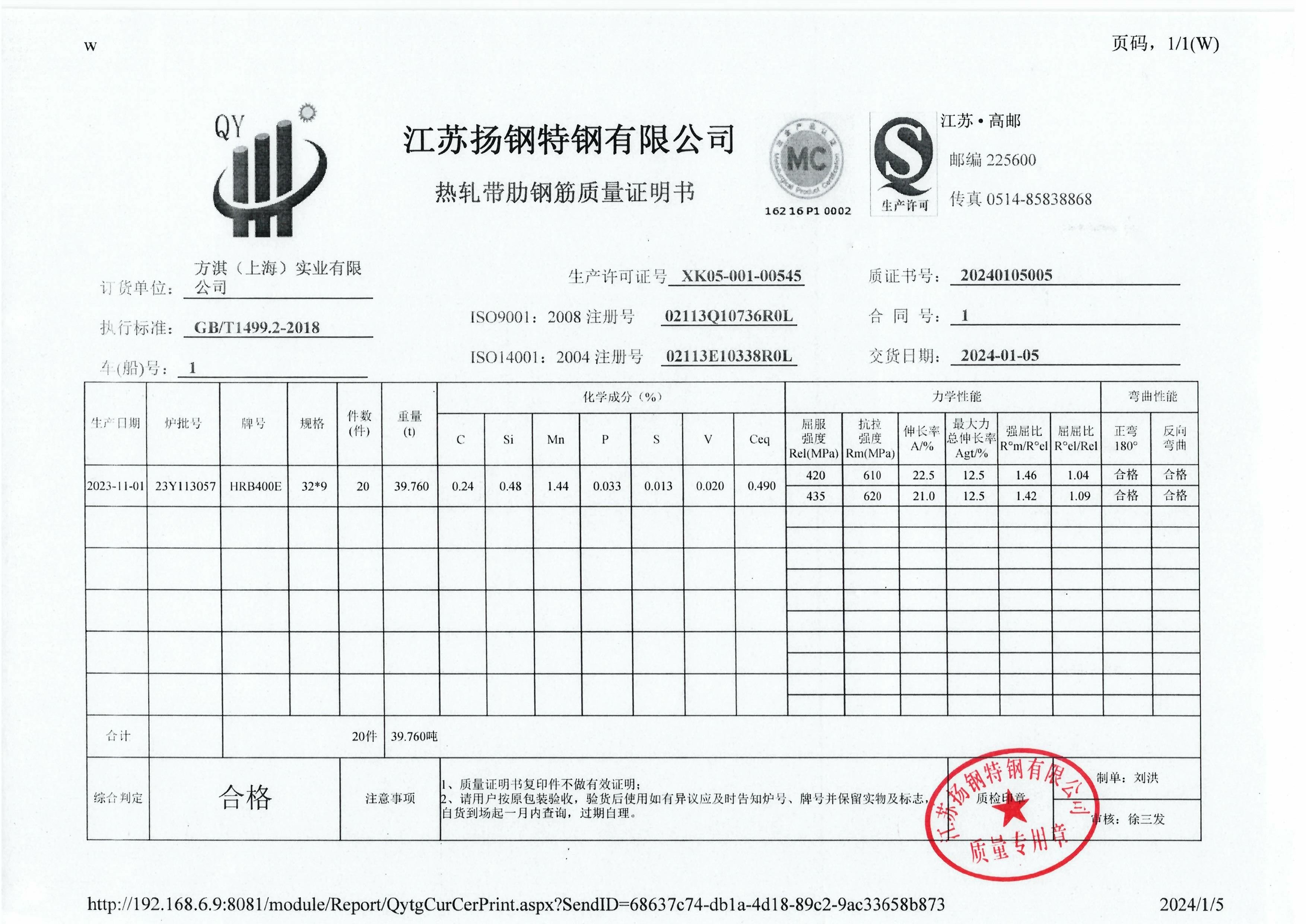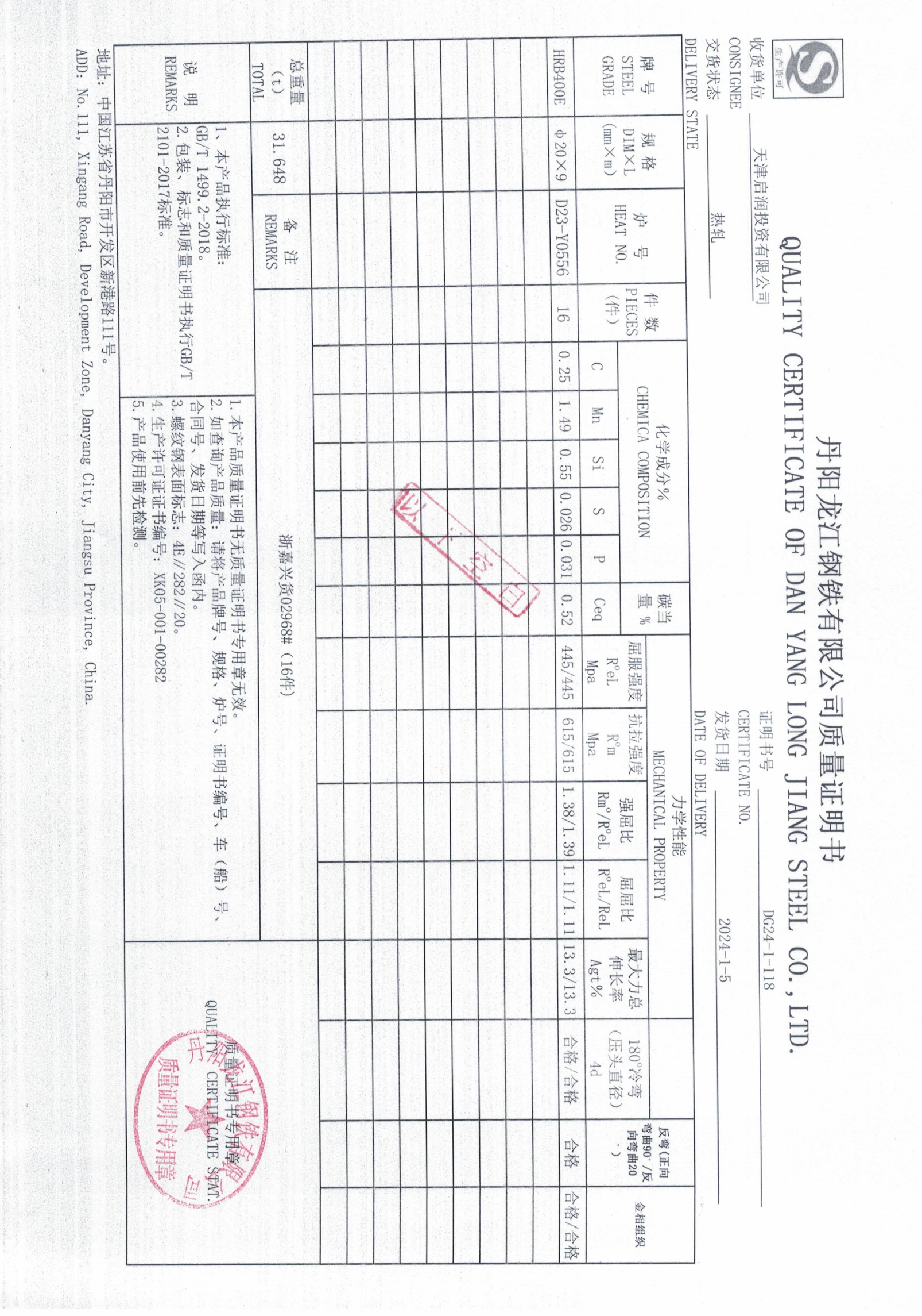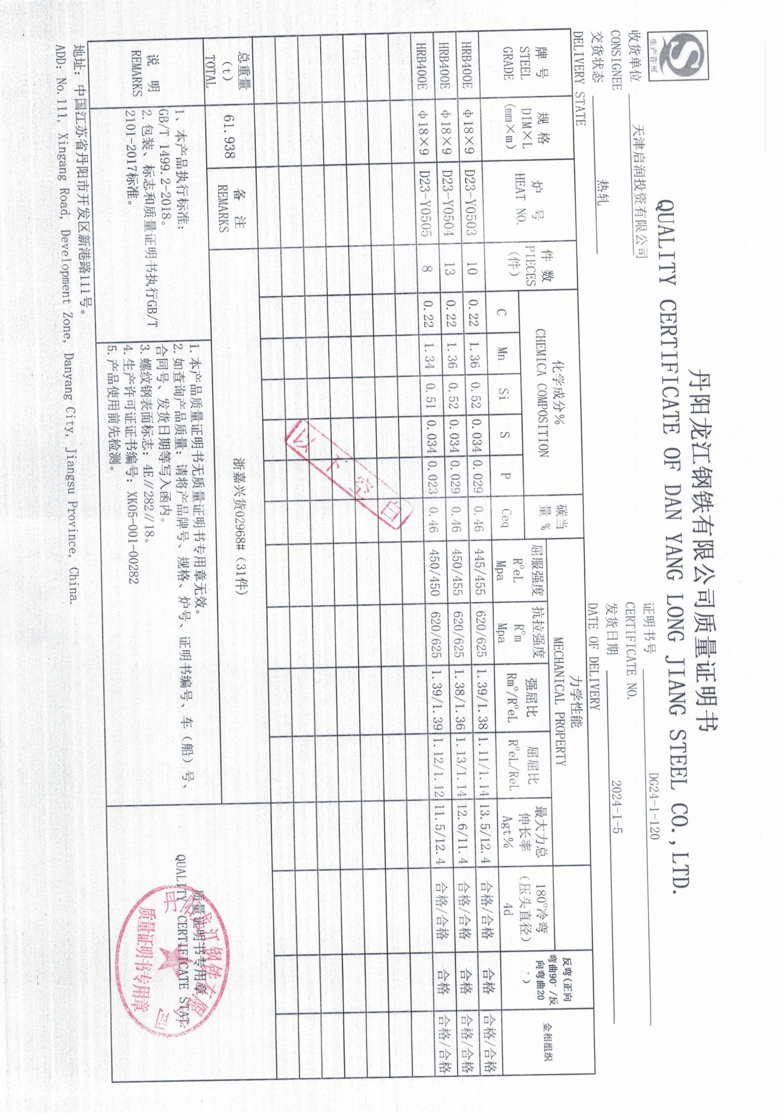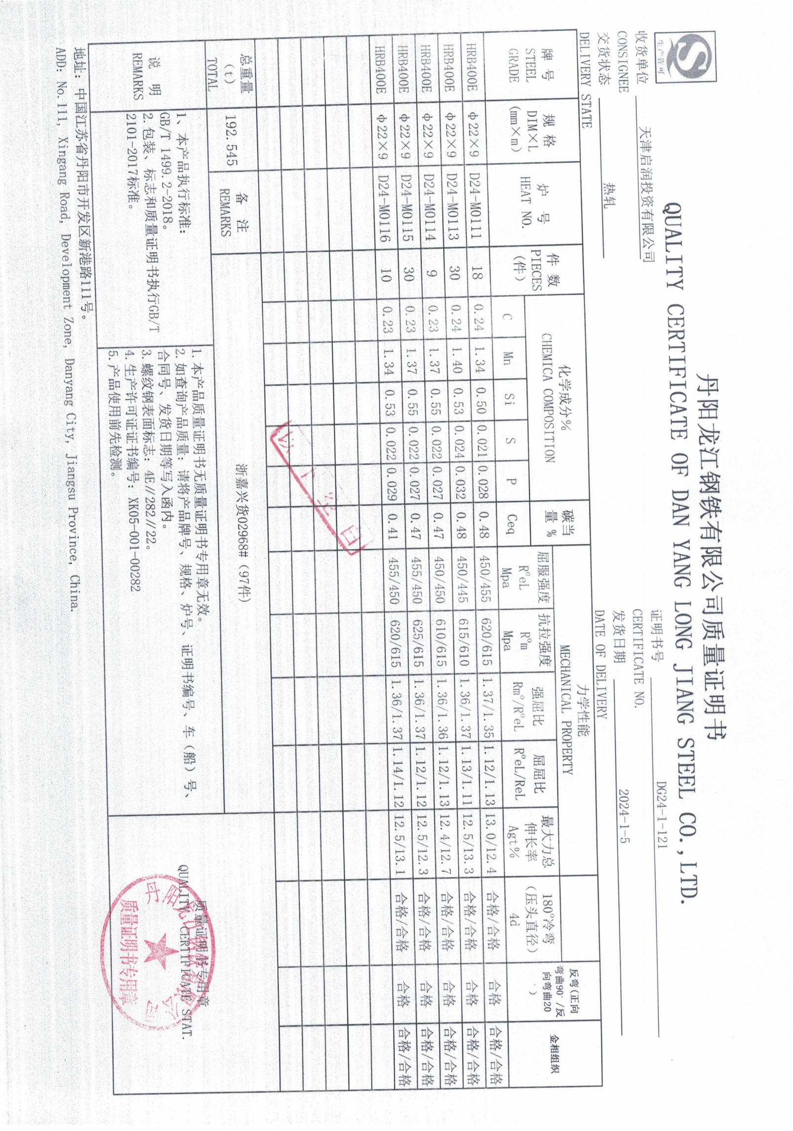 丹阳龙江钢铁有限公司质量证明书天津启润投资有限公司