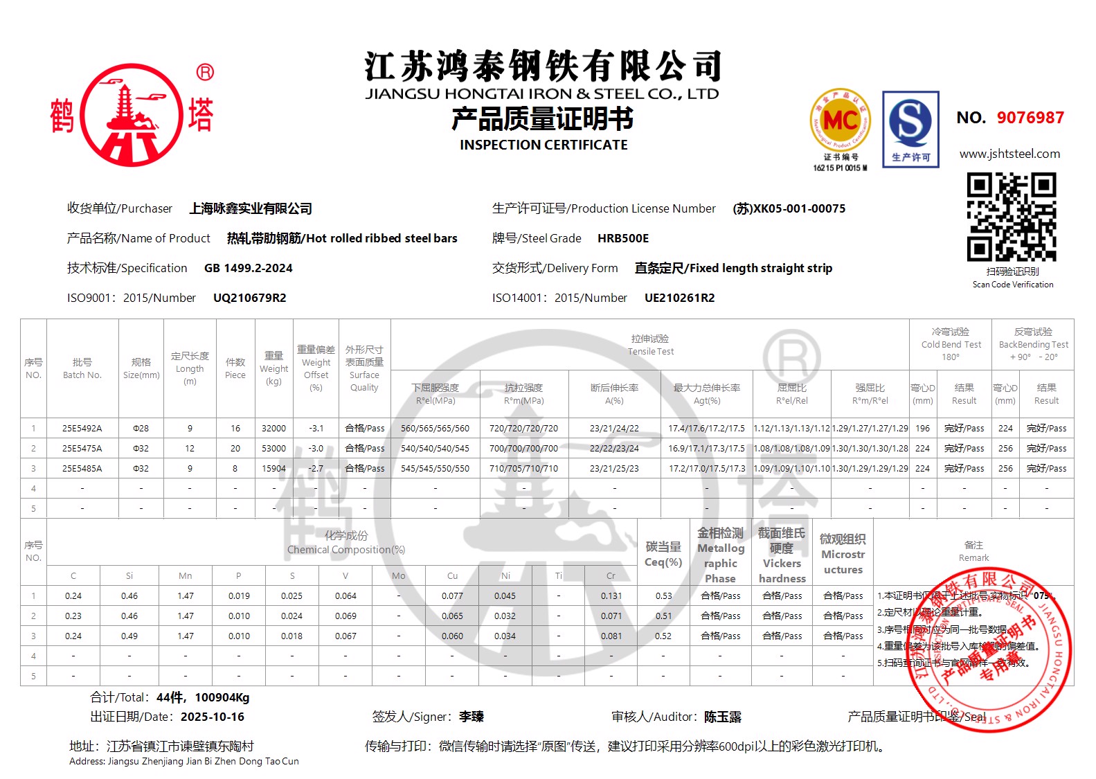 江苏鸿泰钢铁有限公司 9077457上海咏鑫实业有限公司NOHI IVI