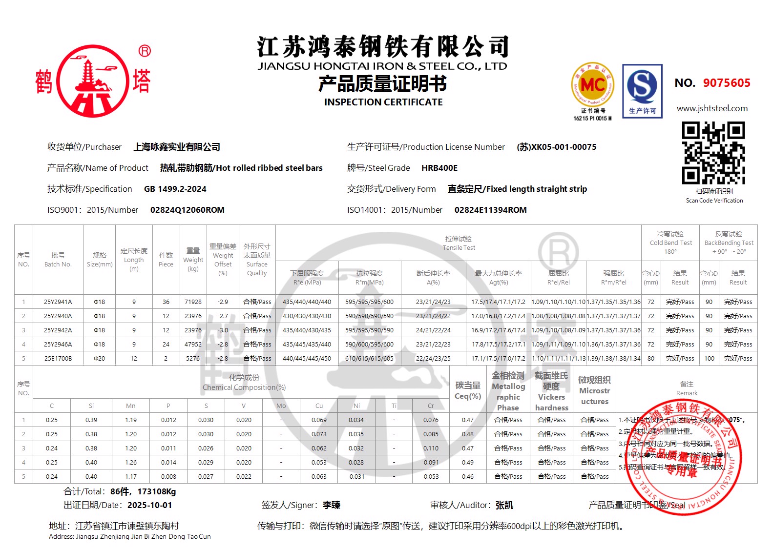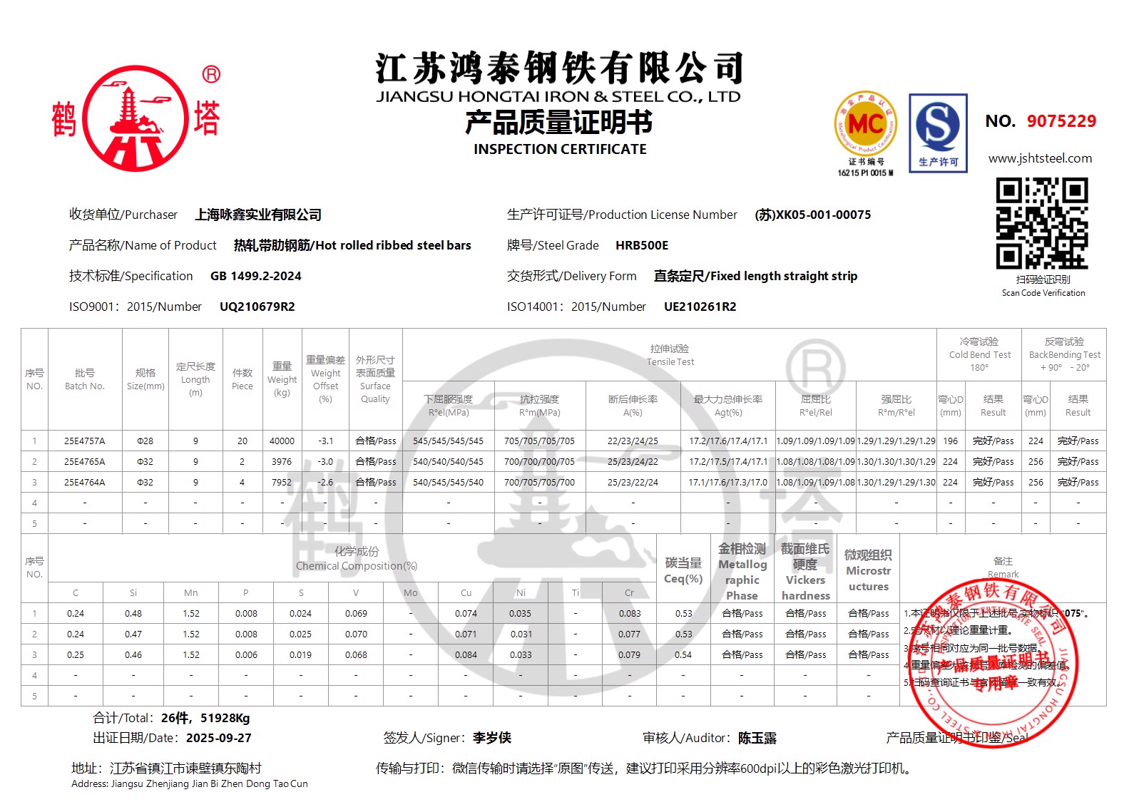 江苏鸿泰钢铁有限公司9075604上海咏鑫实业有限公司NOHI