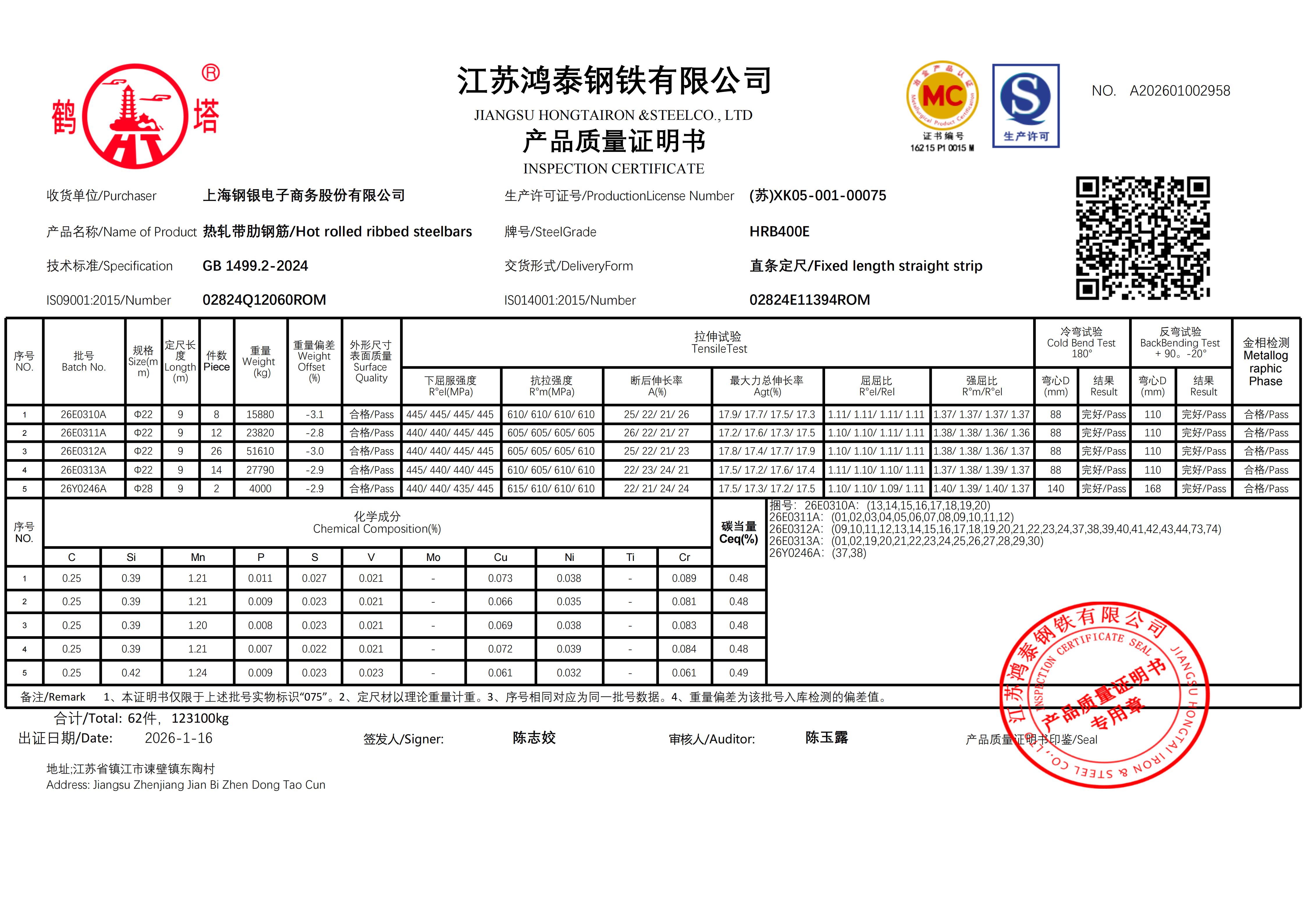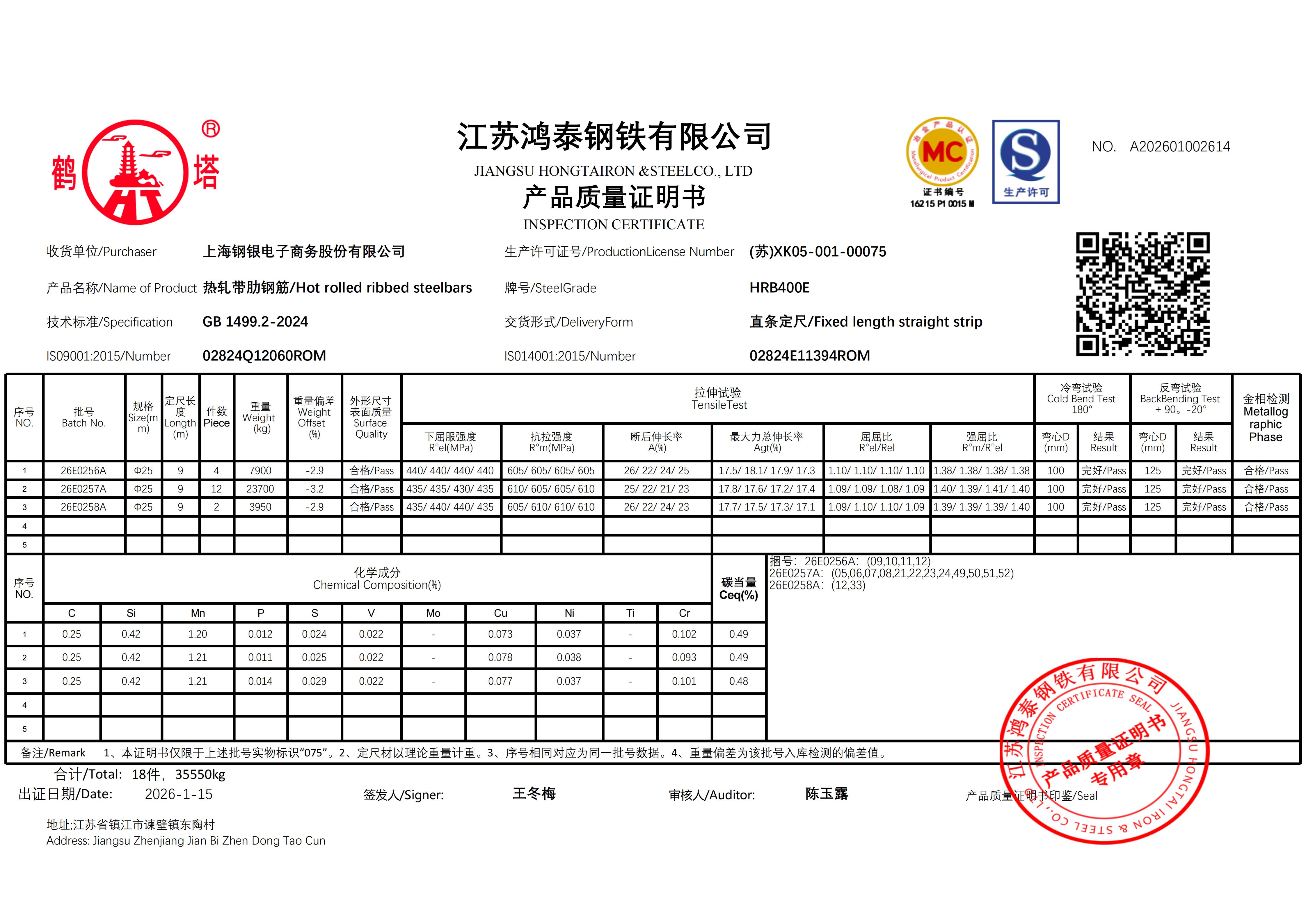 江苏鸿泰钢铁有限公司 A202601002615上海钢银电子商务股份有限公司NO