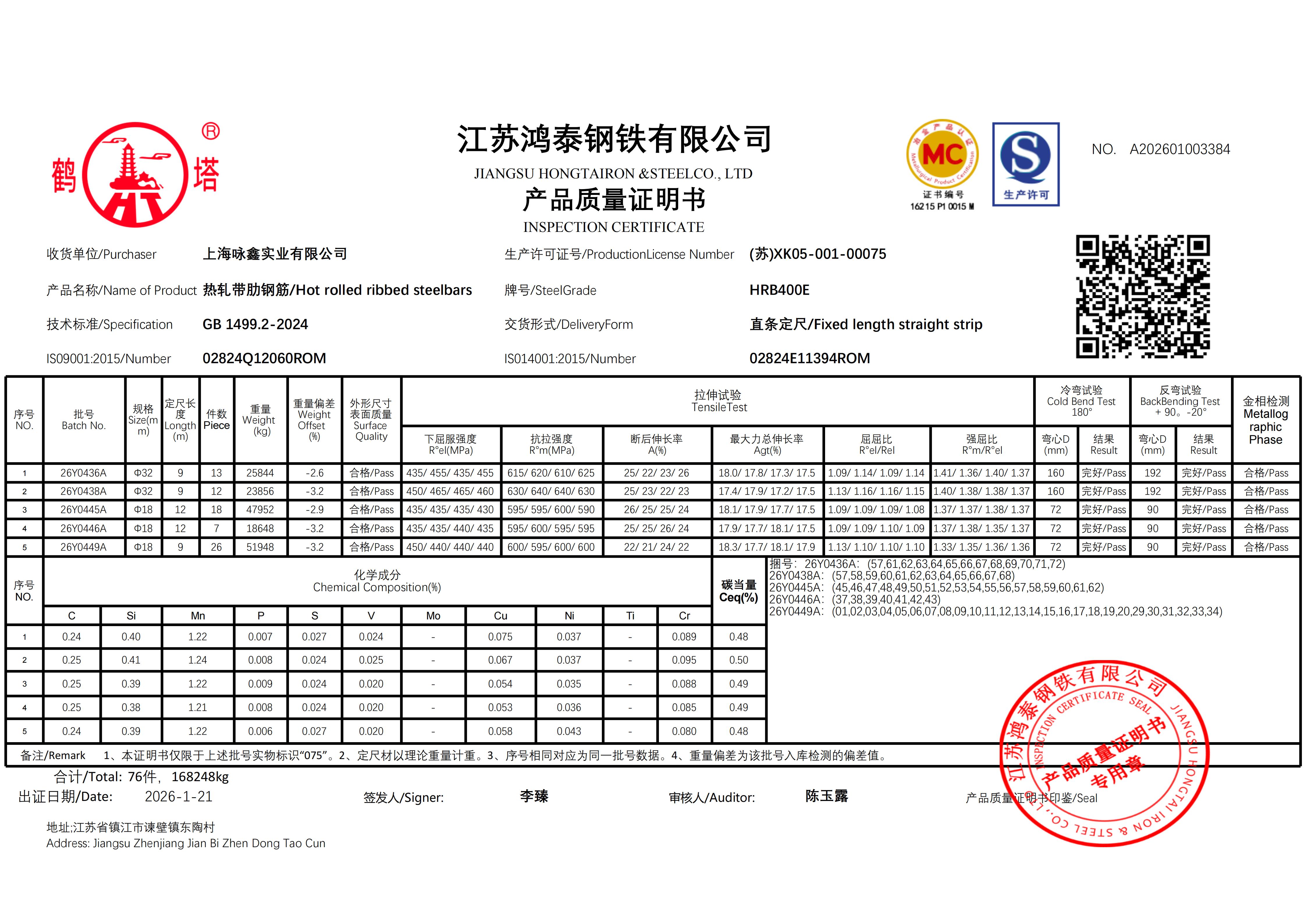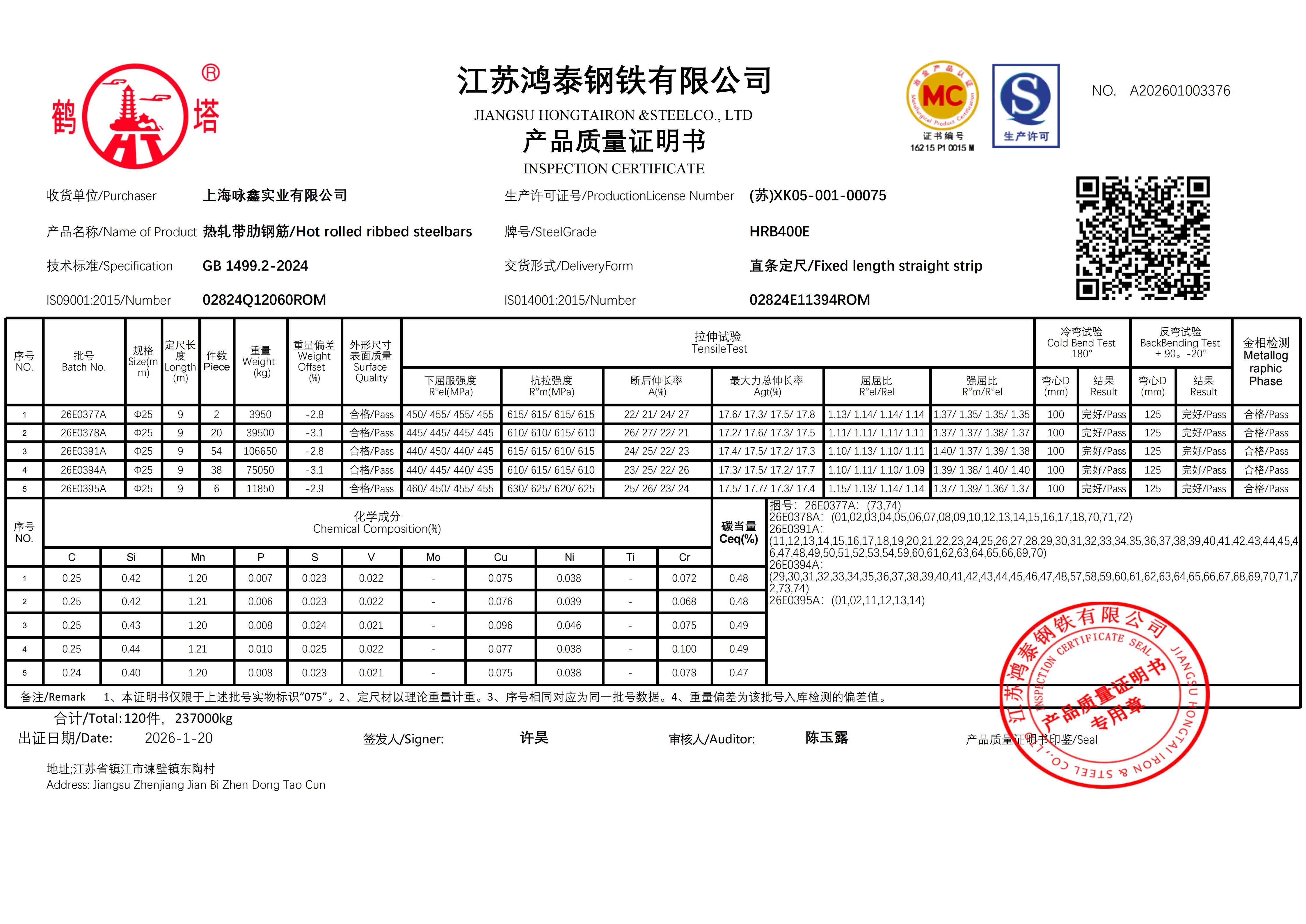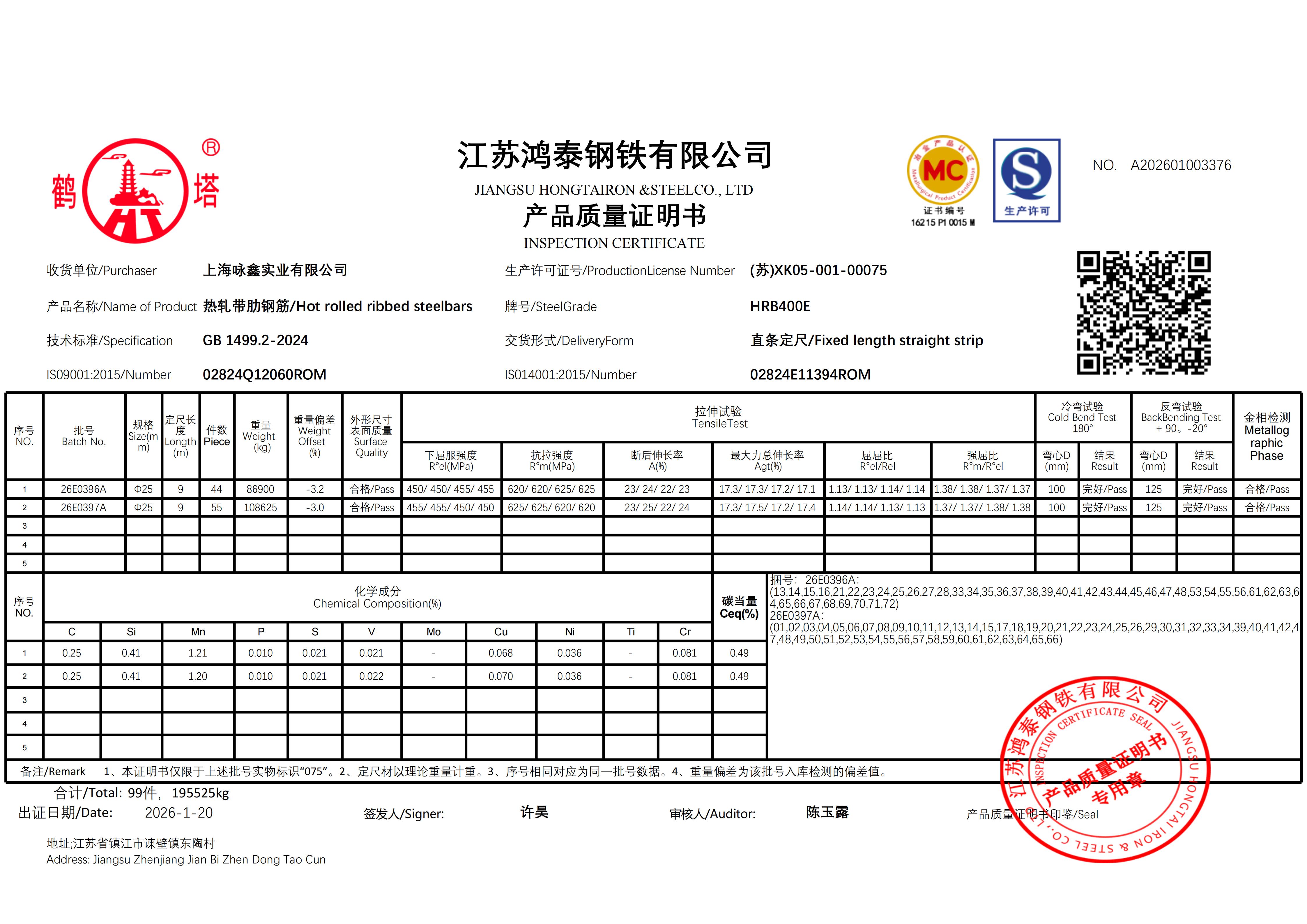 江苏鸿泰钢铁有限公司 A202601003376上海咏鑫实业有限公司NO