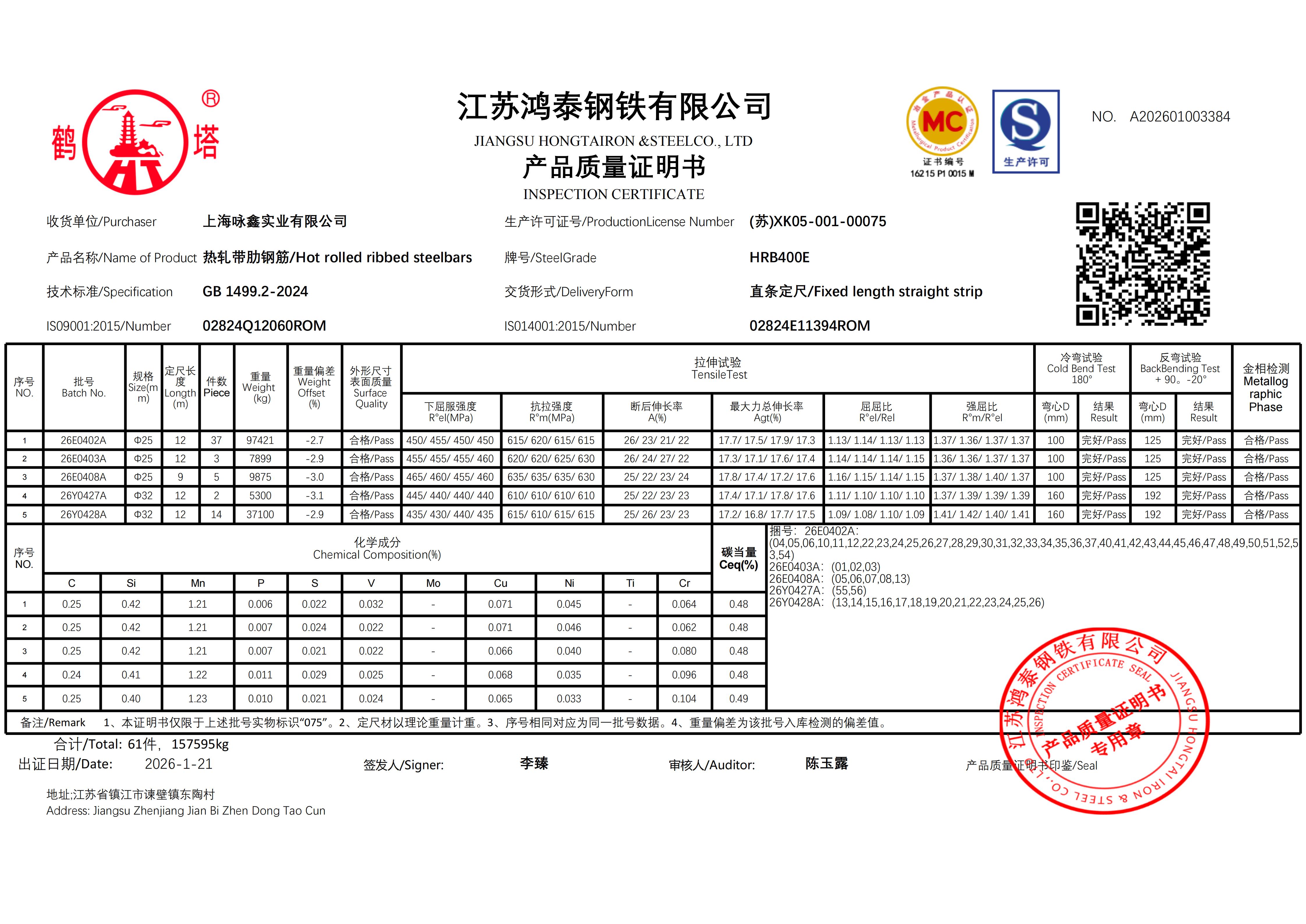 江苏鸿泰钢铁有限公司 A202601003376上海咏鑫实业有限公司