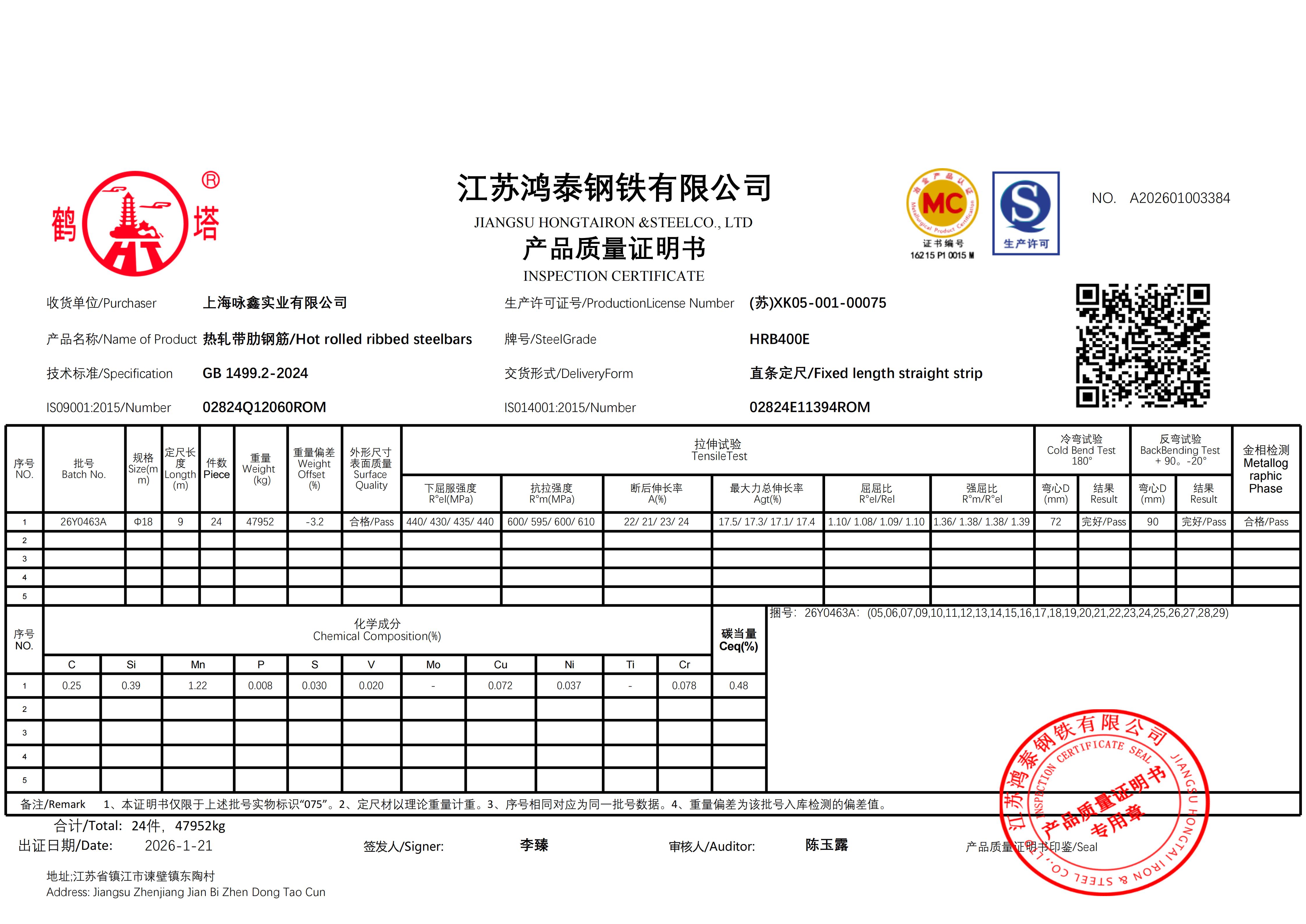 江苏鸿泰钢铁有限公司 A202601003384上海咏鑫实业有限公司NO