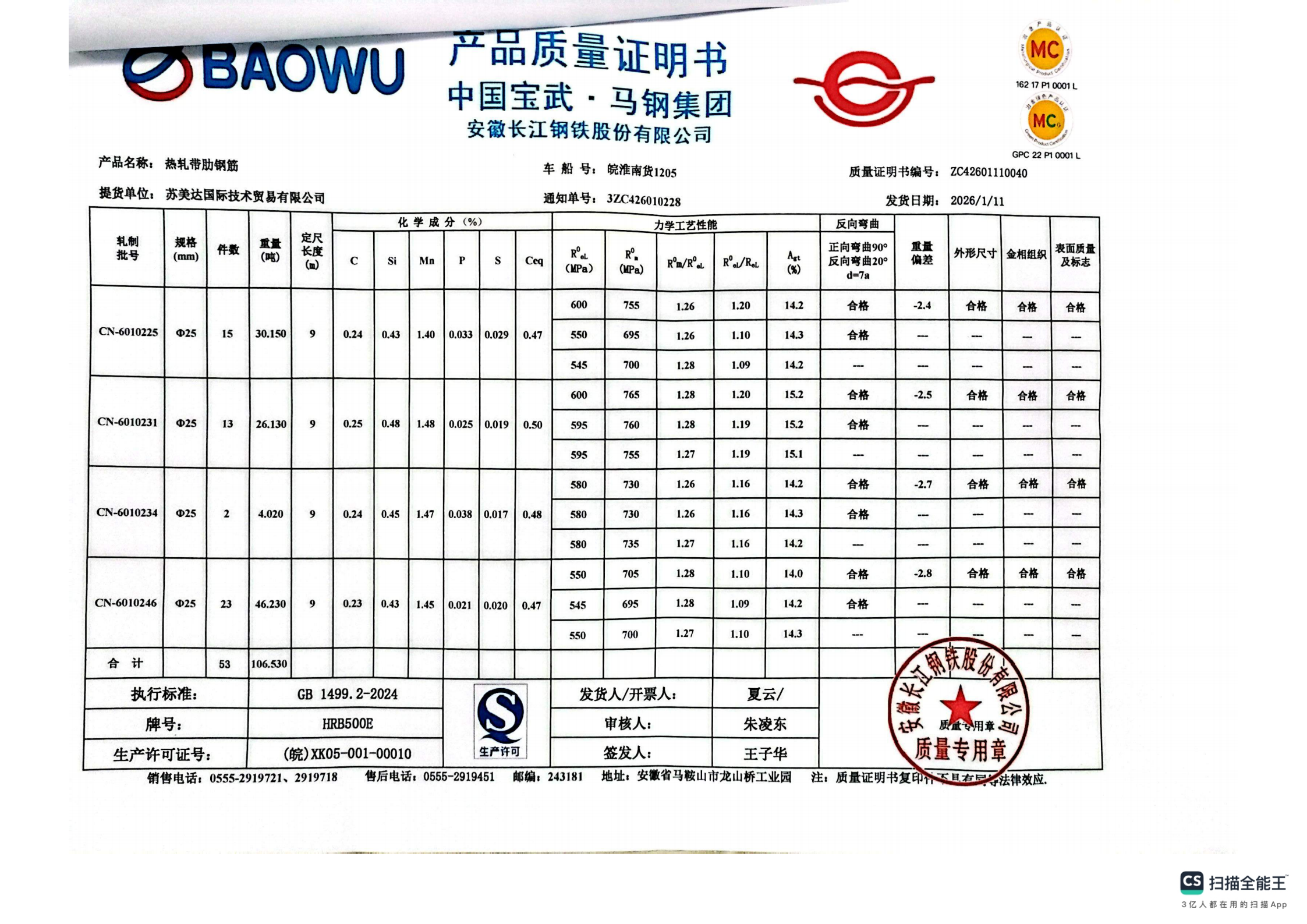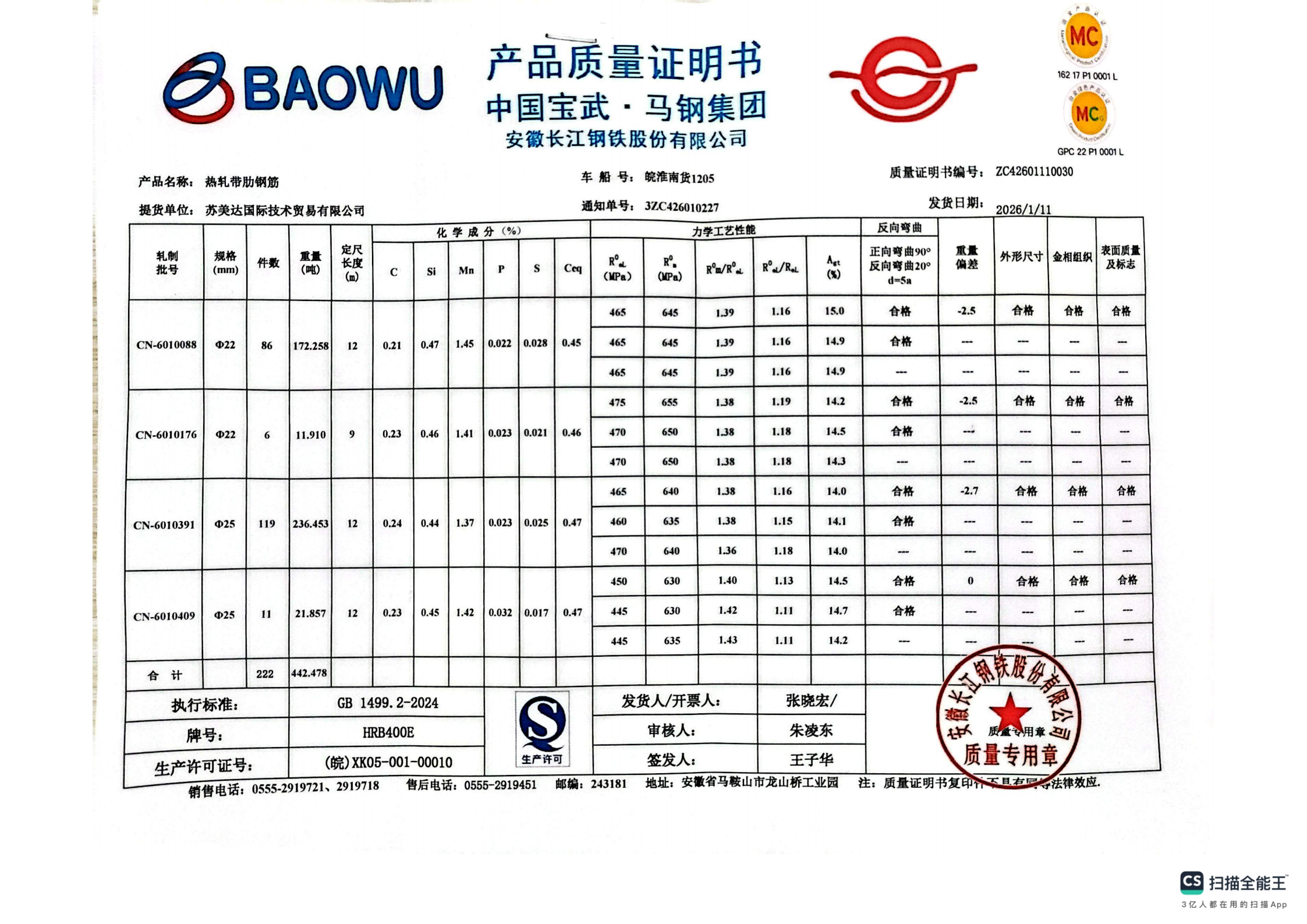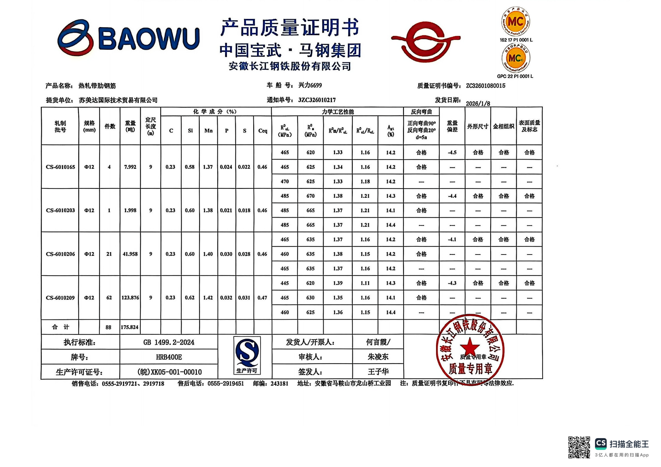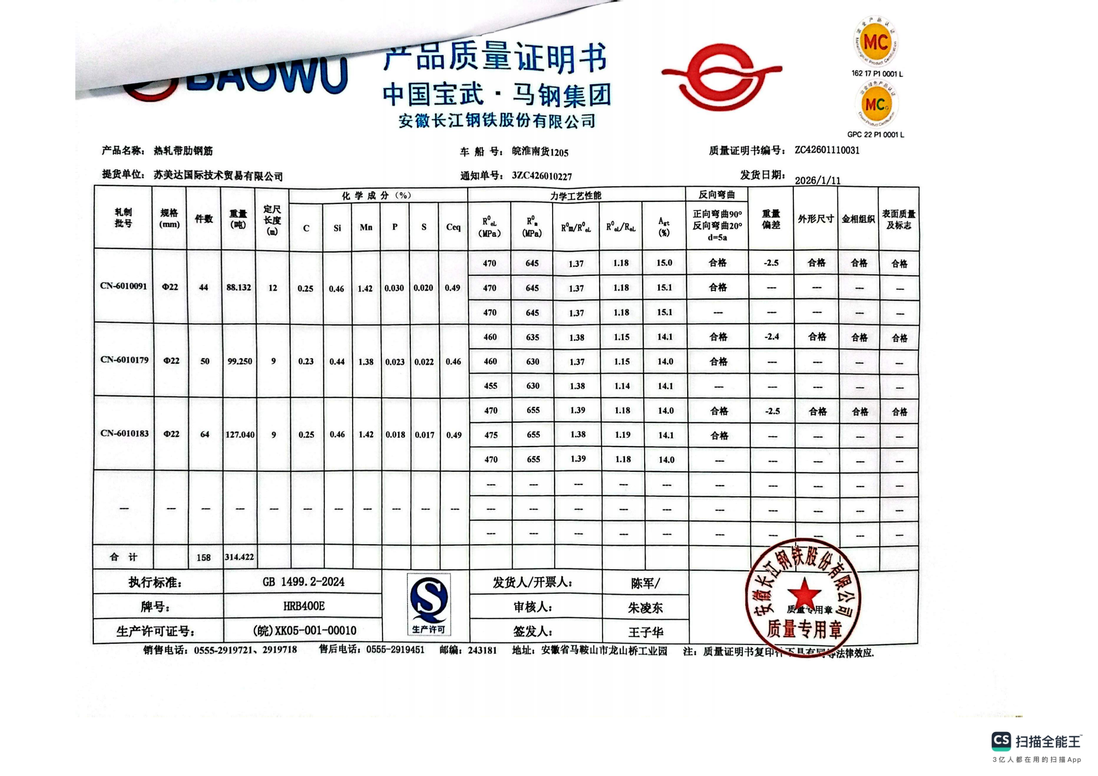 安徽长江钢铁股份有限公司提货单位:苏美达国际技术贸易有限公司