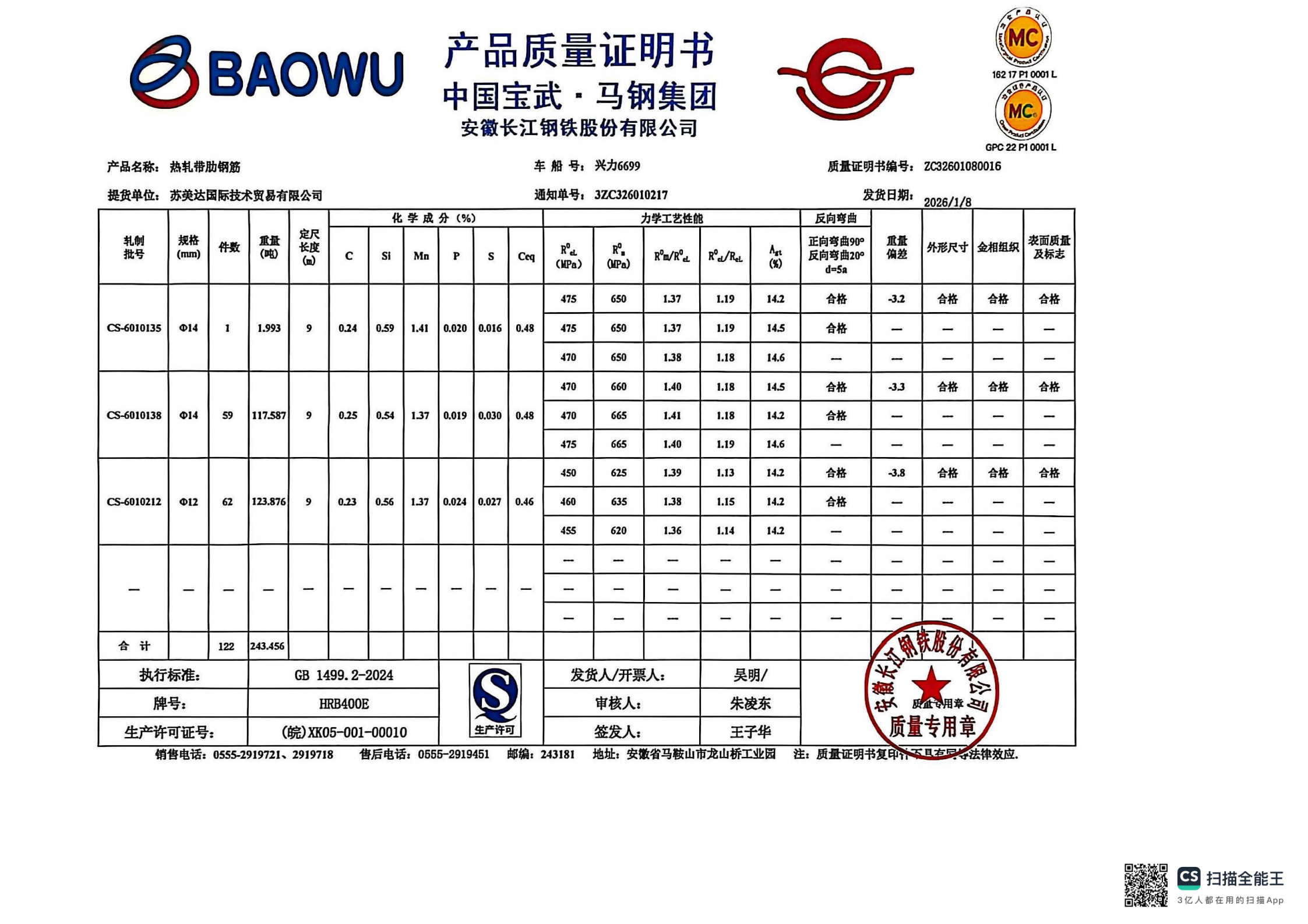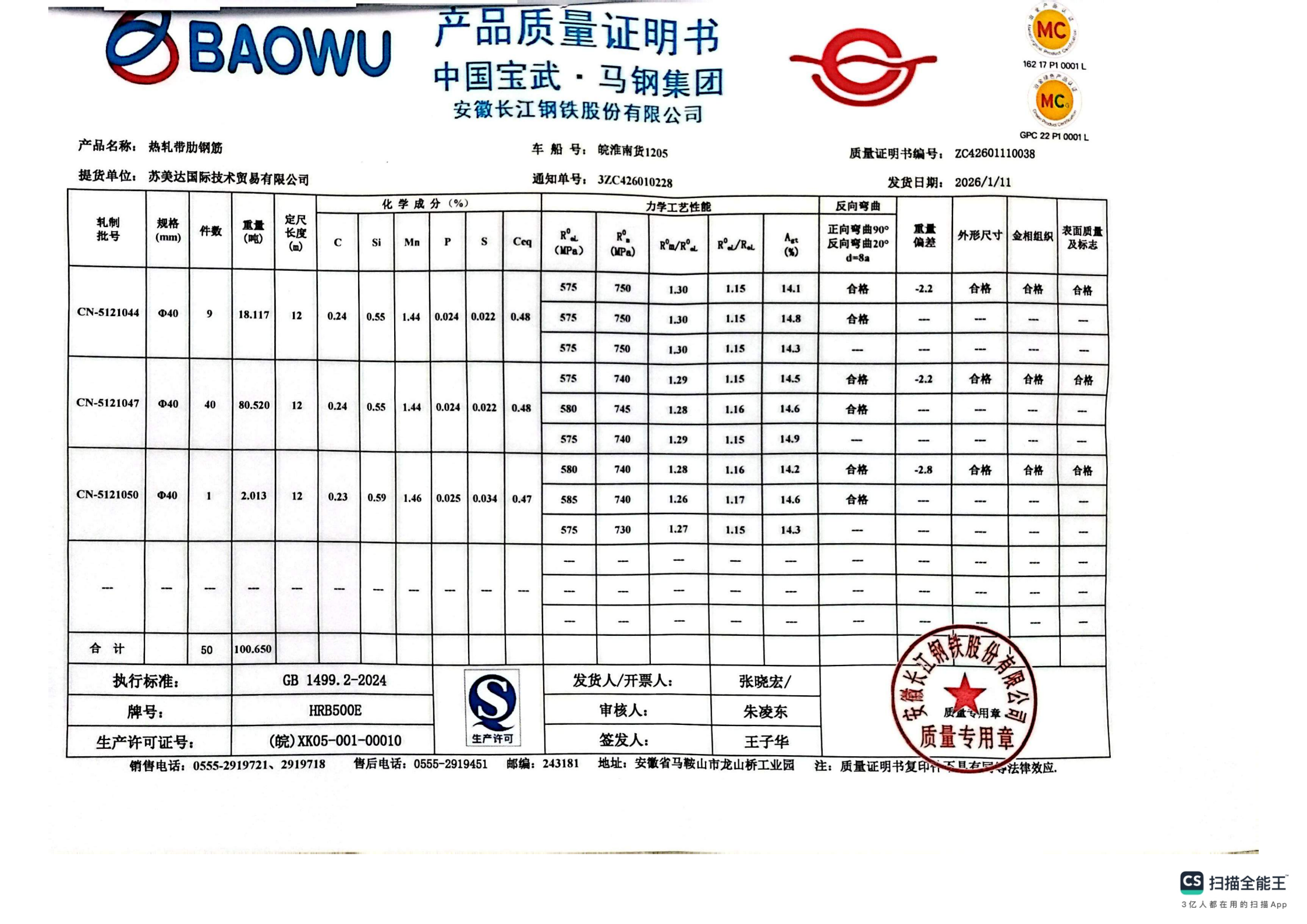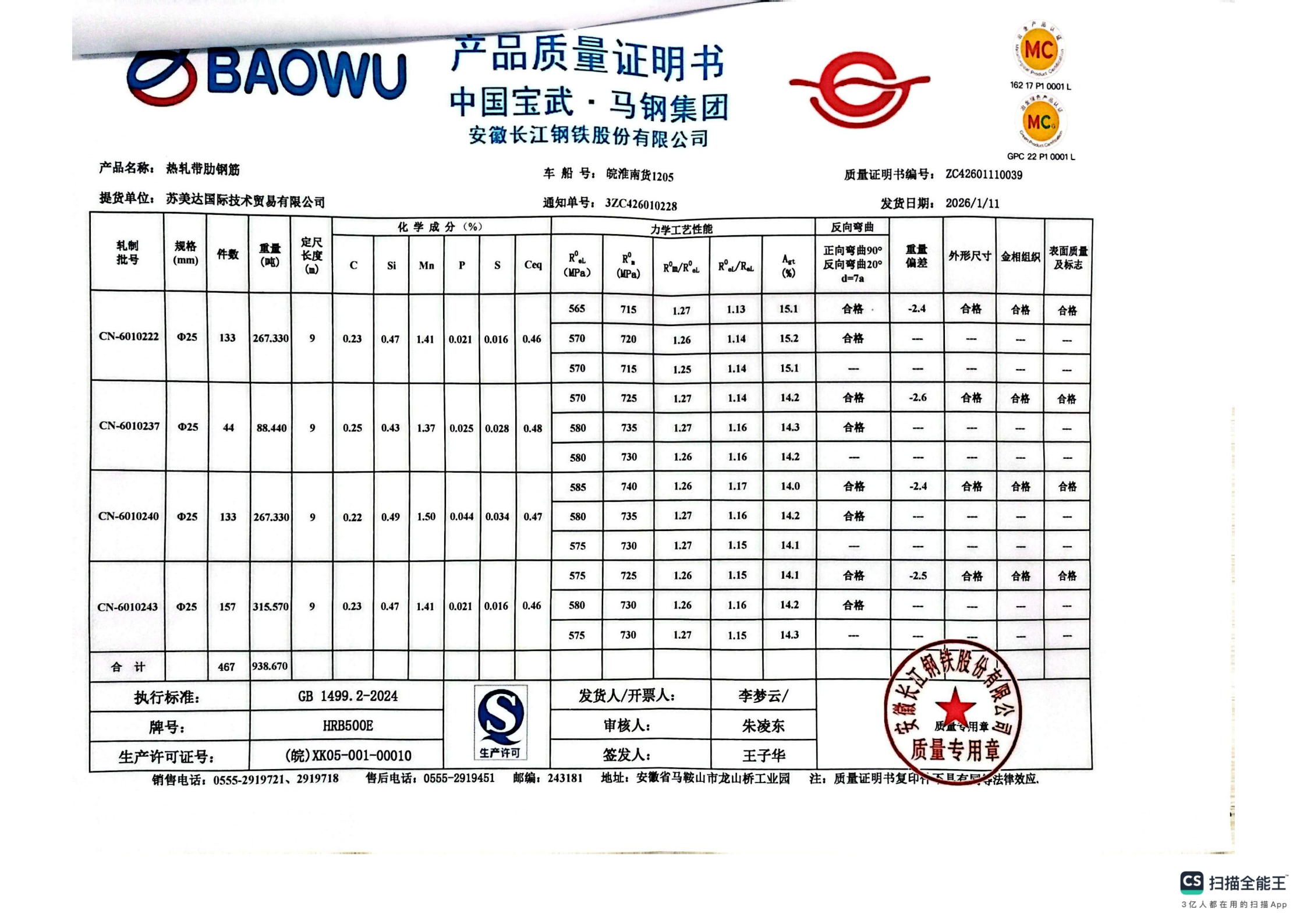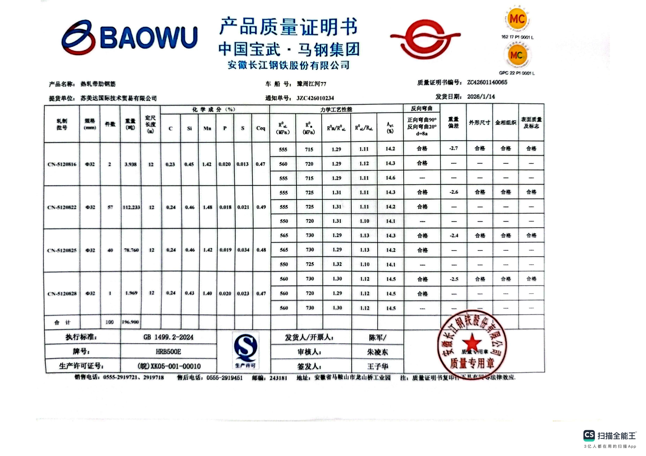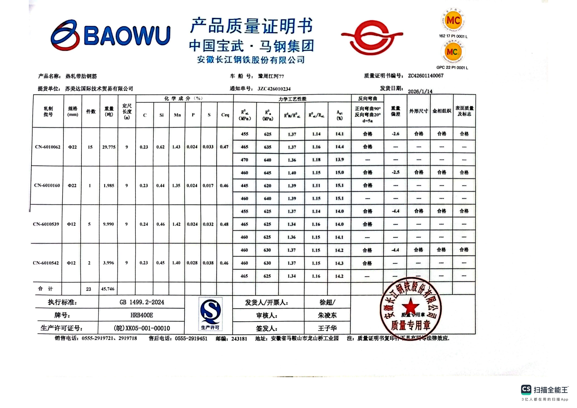 安徽长江钢铁股份有限公司提货单位:苏美达国际技术贸易有限公司
