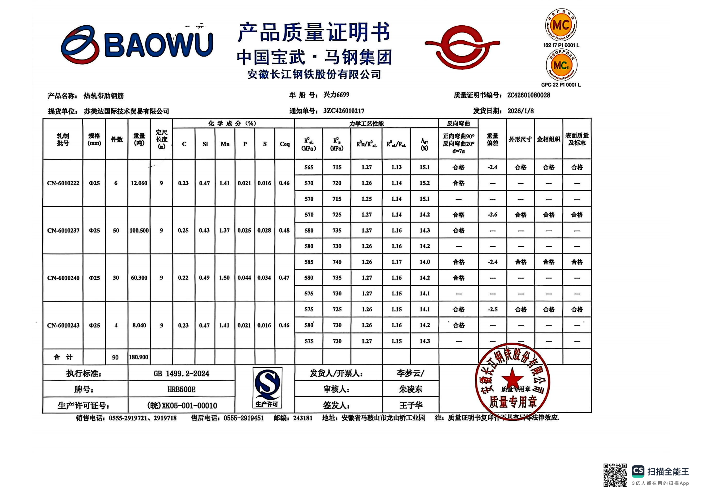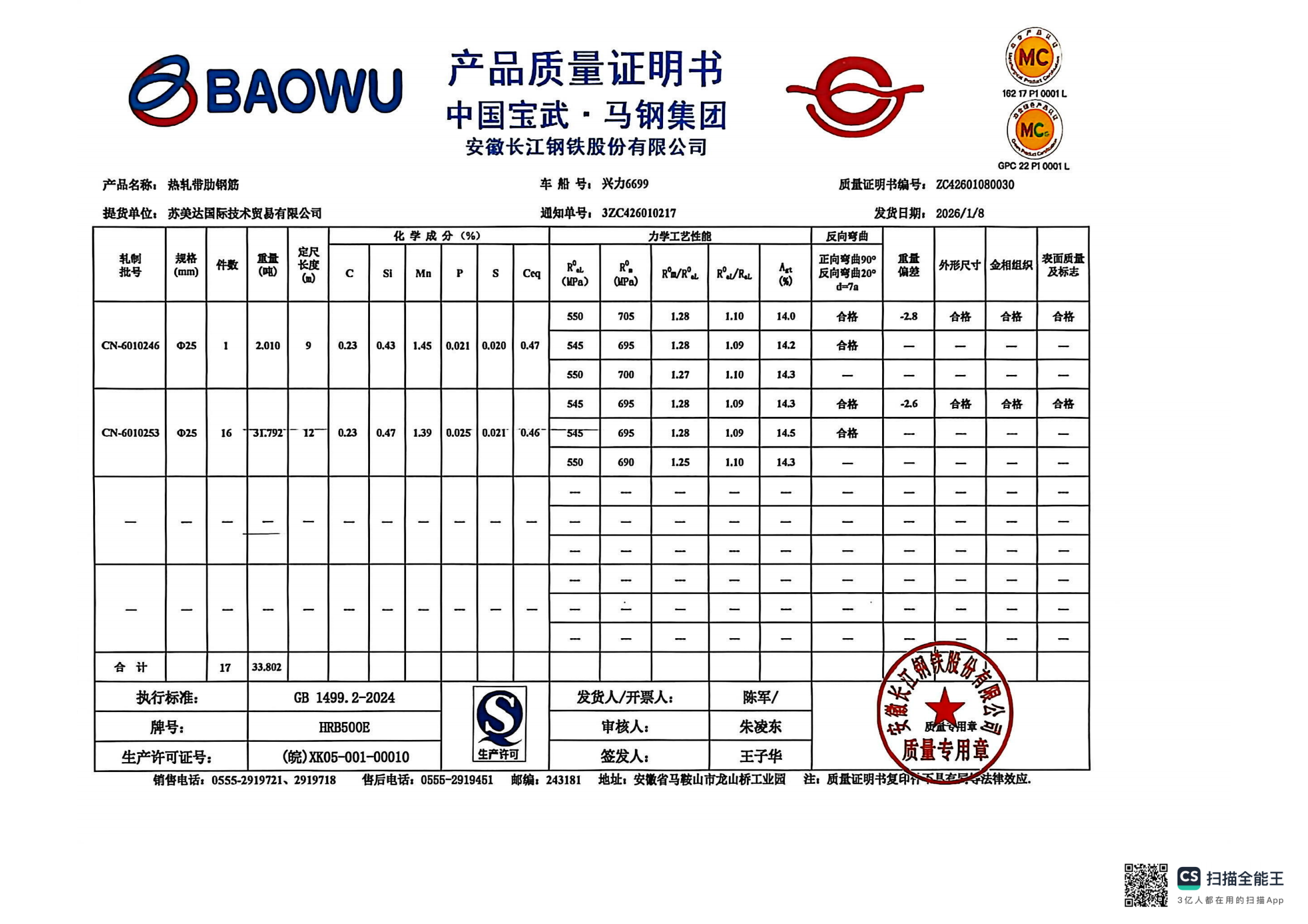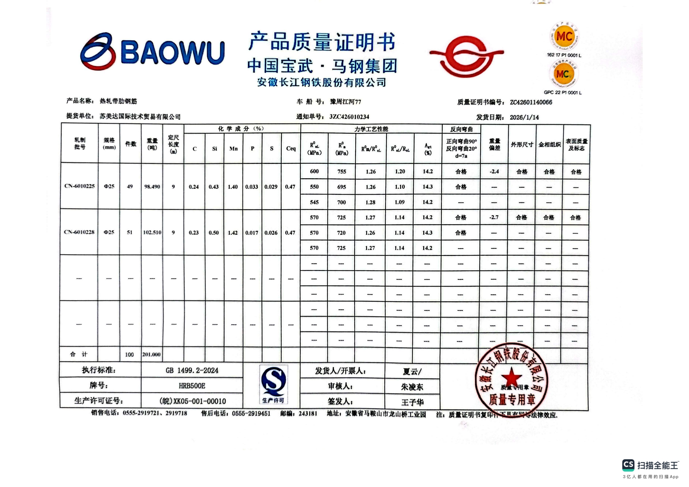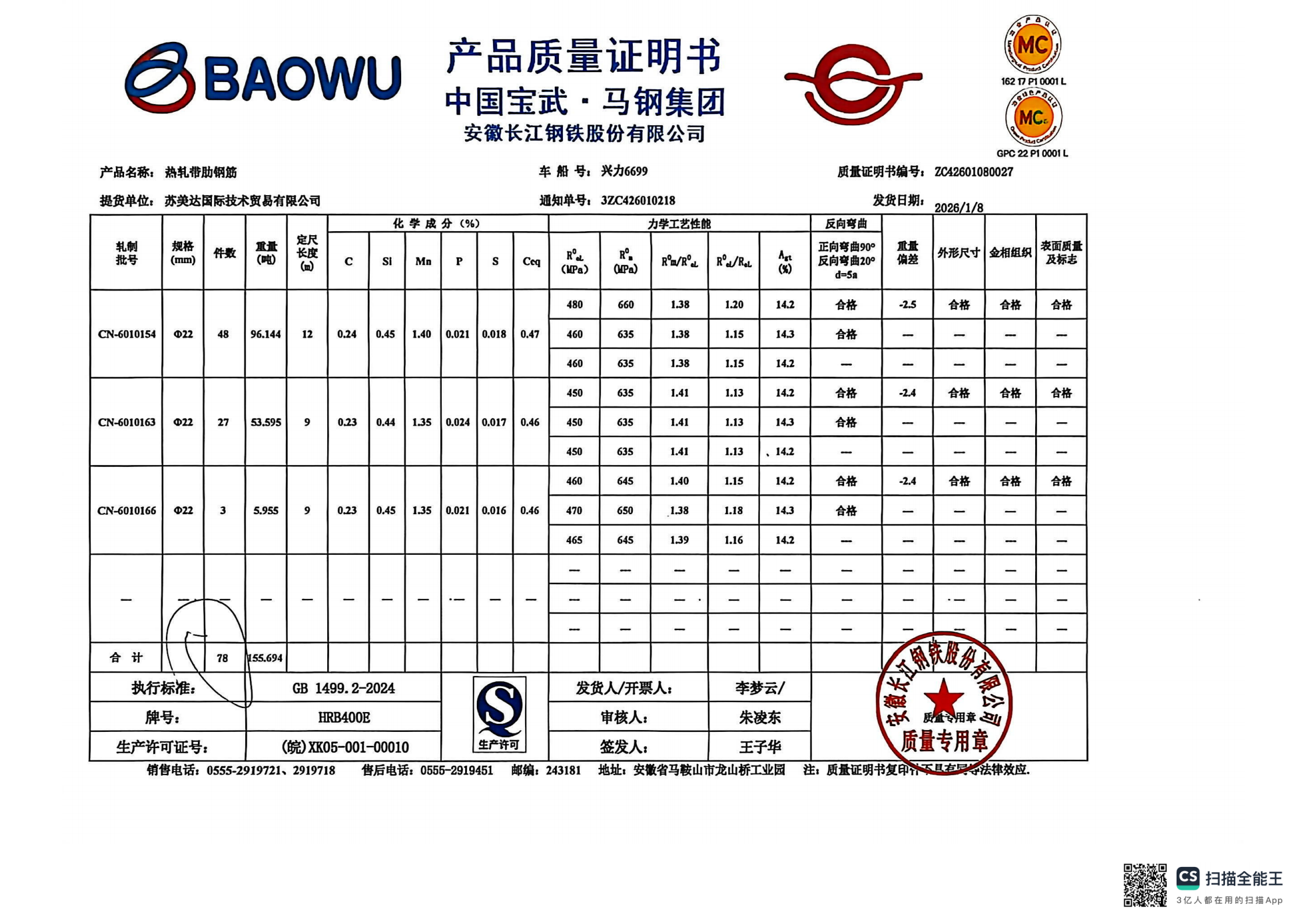 安徽长江钢铁股份有限公司提货单位:苏美达国际技术贸易有限公司