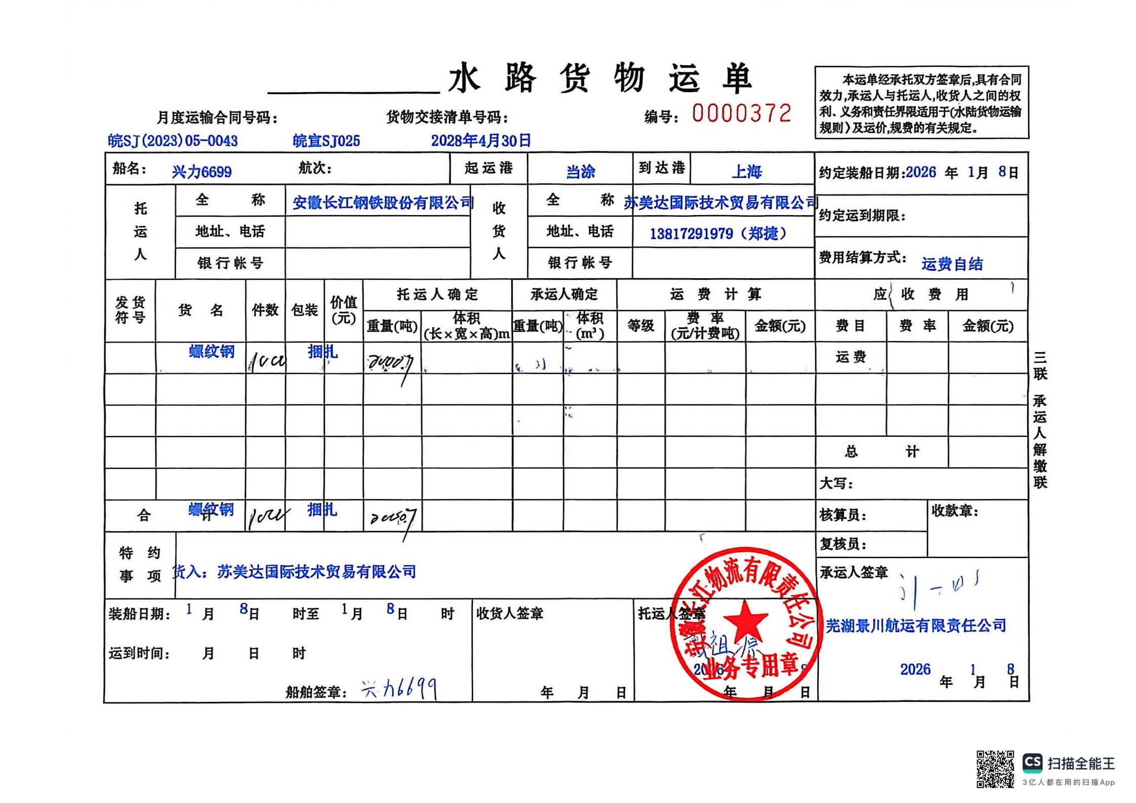 安徽长江钢铁股份有限公司苏美达国际技术贸易有限公司货入:苏美达国际技术贸易有限公司芜湖景川航运有限责任公司