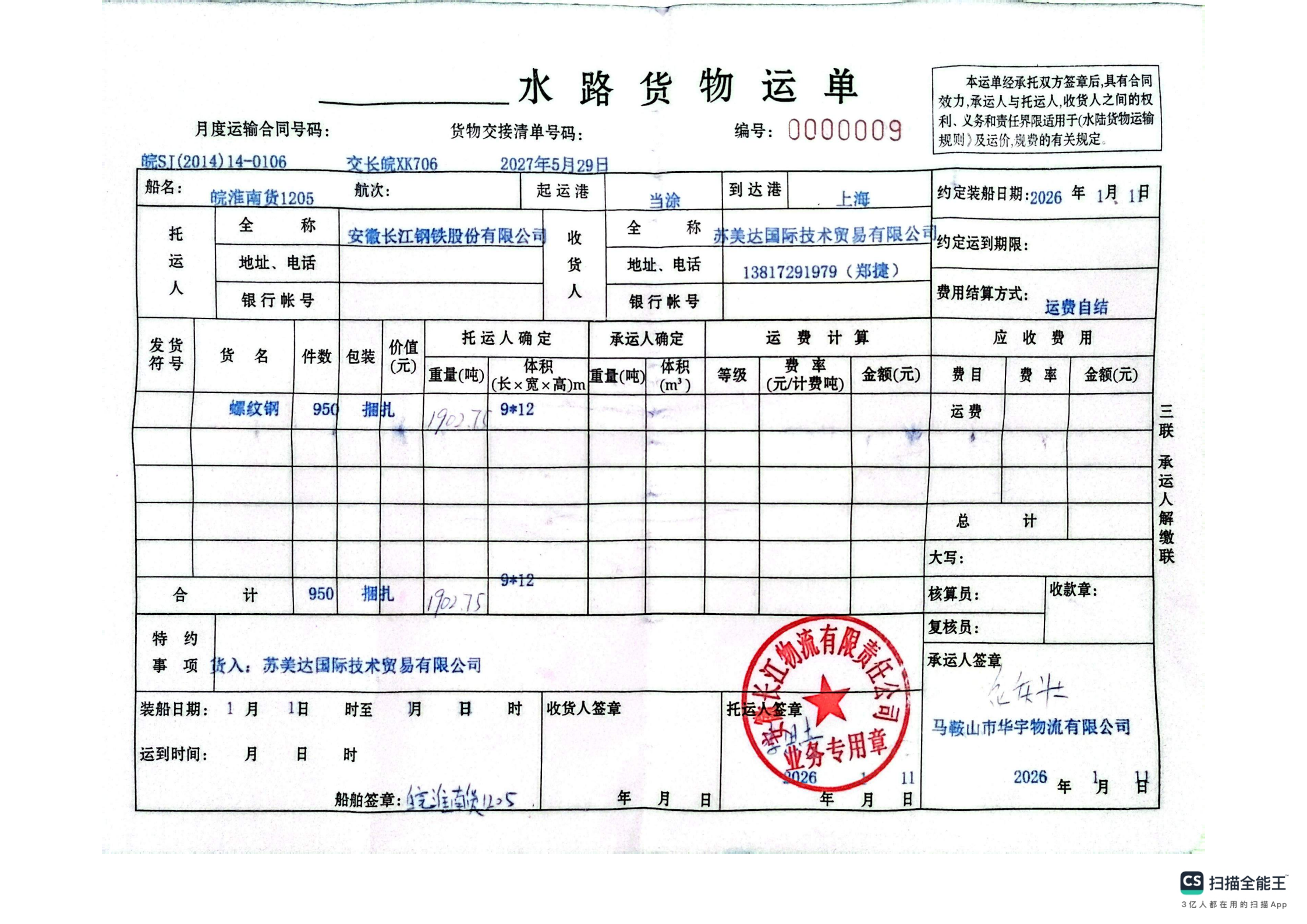 安徽长江钢铁股份有限公司苏美达国际技术贸易有限公司货入:苏美达国际技术贸易有限公司马鞍山市华宇物流有限公司