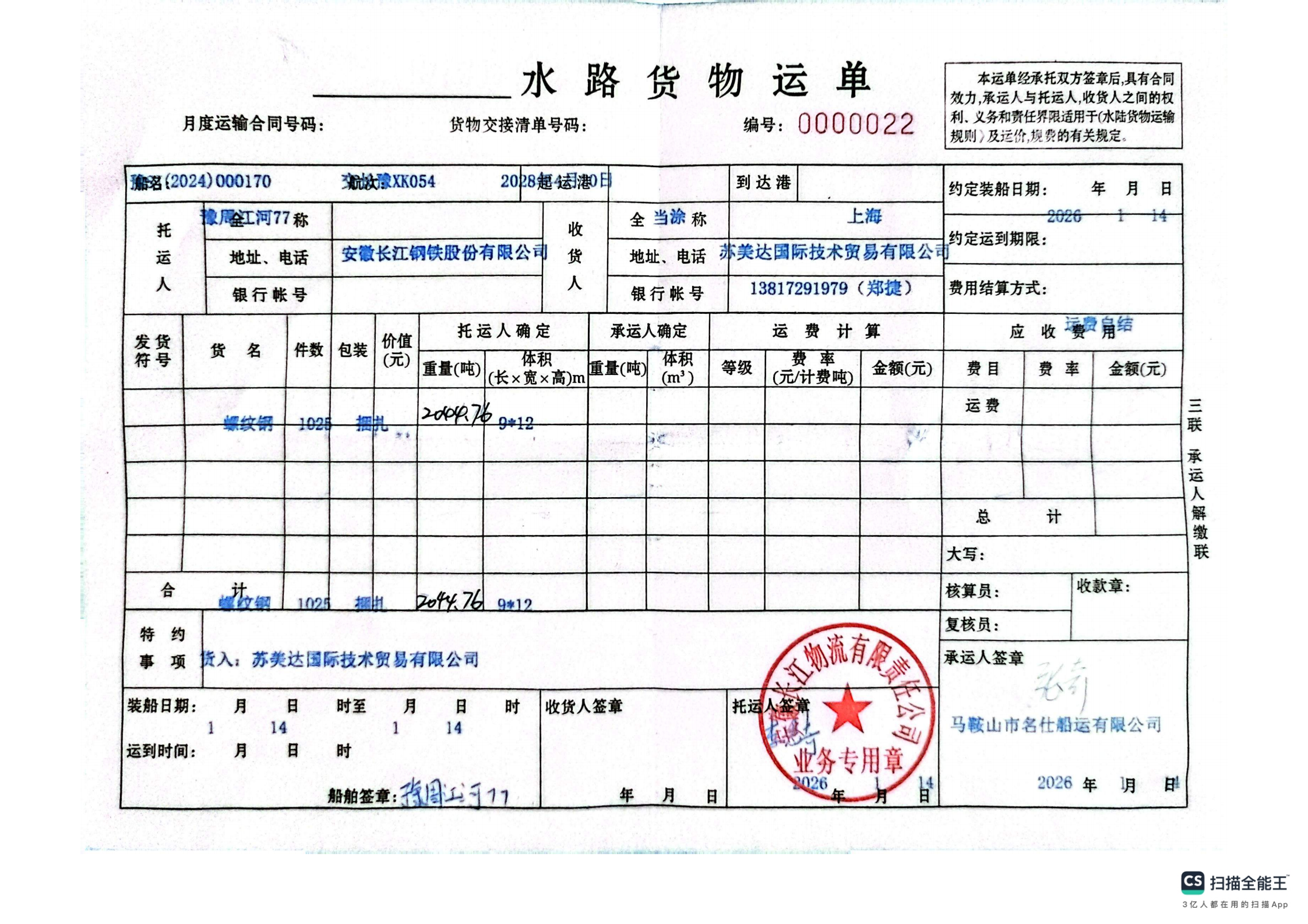 安徽长江钢铁股份有限公司苏美达国际技术贸易有限公司货入:苏美达国际技术贸易有限公司马鞍山市名仕船运有限公司