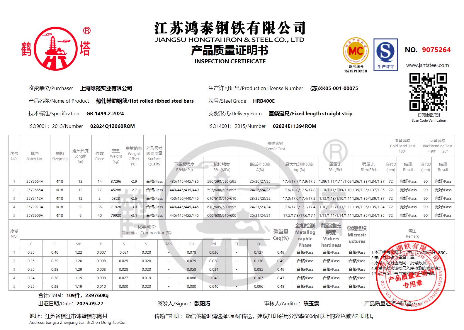 江苏鸿泰钢铁有限公司9075267上海咏鑫实业有限公司NOHI