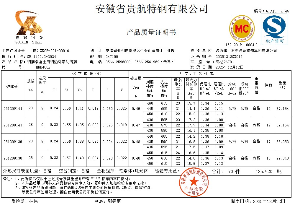 安徽省贵航特钢有限公司GH/JL-JZ-45提货单位:陕西建工材料设备物流集团有限公司3、如发现产品质量问题,请在验收后5天内向我公司质量科提出异议并保留实物,等我公司审验后处理,擅自使用我公司不负任何责任。