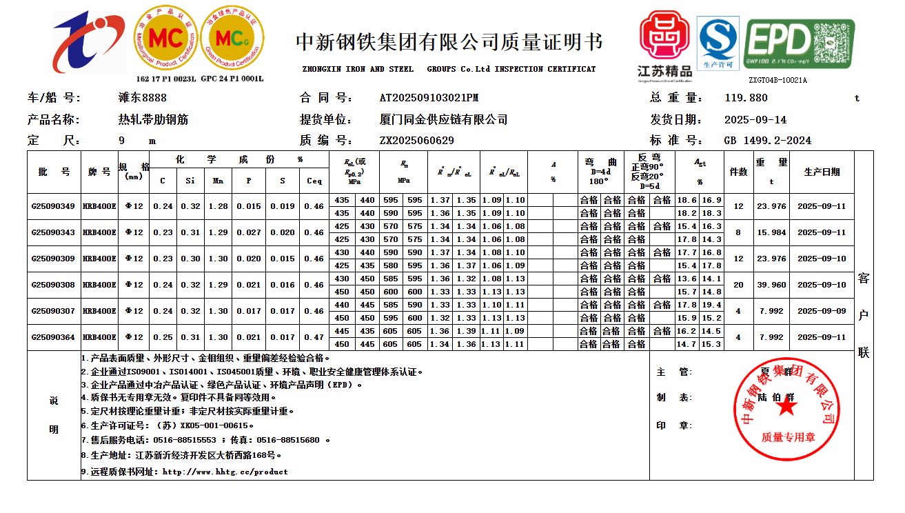 中新钢铁集团有限公司质量证明书厦门同金供应链有限公司