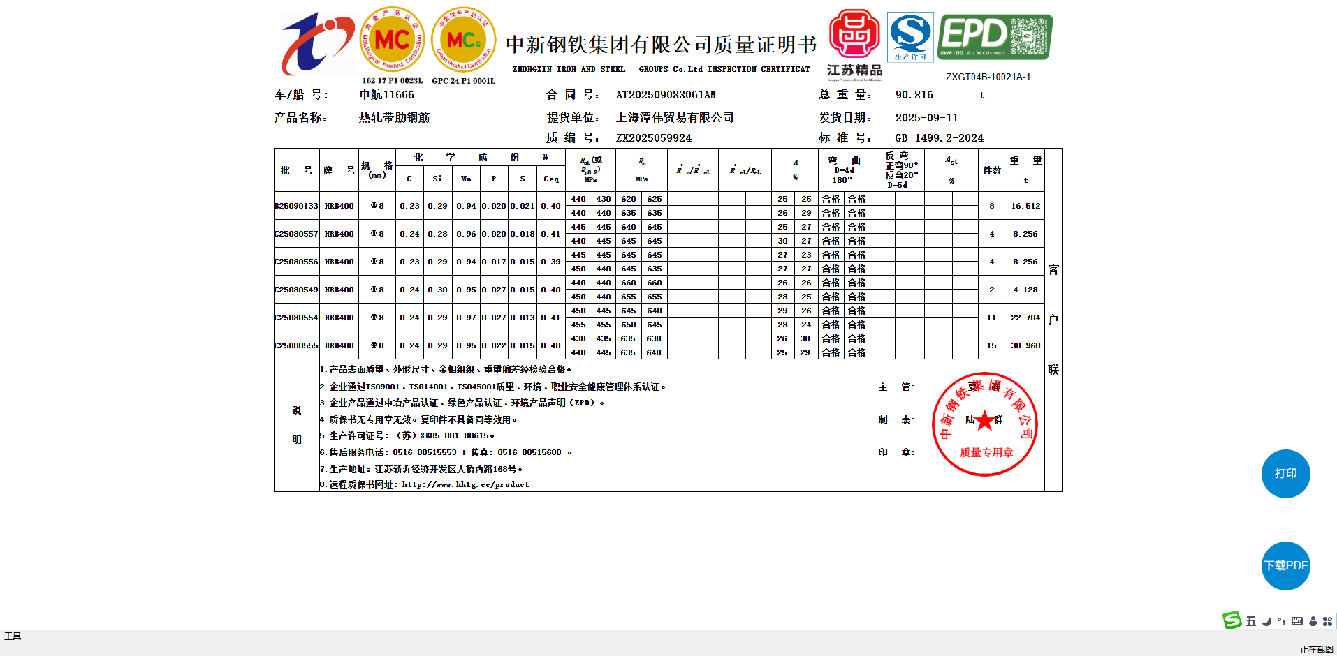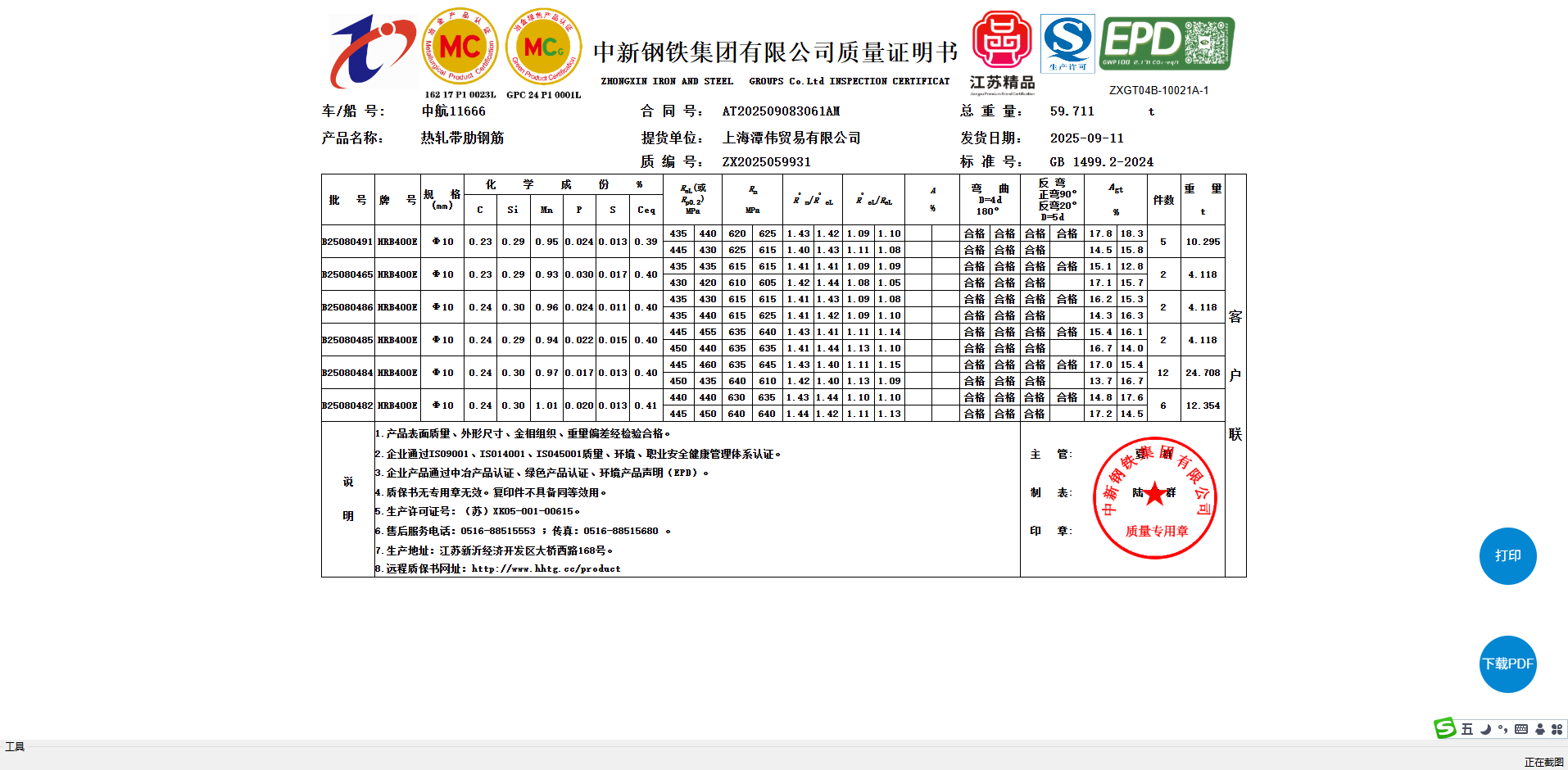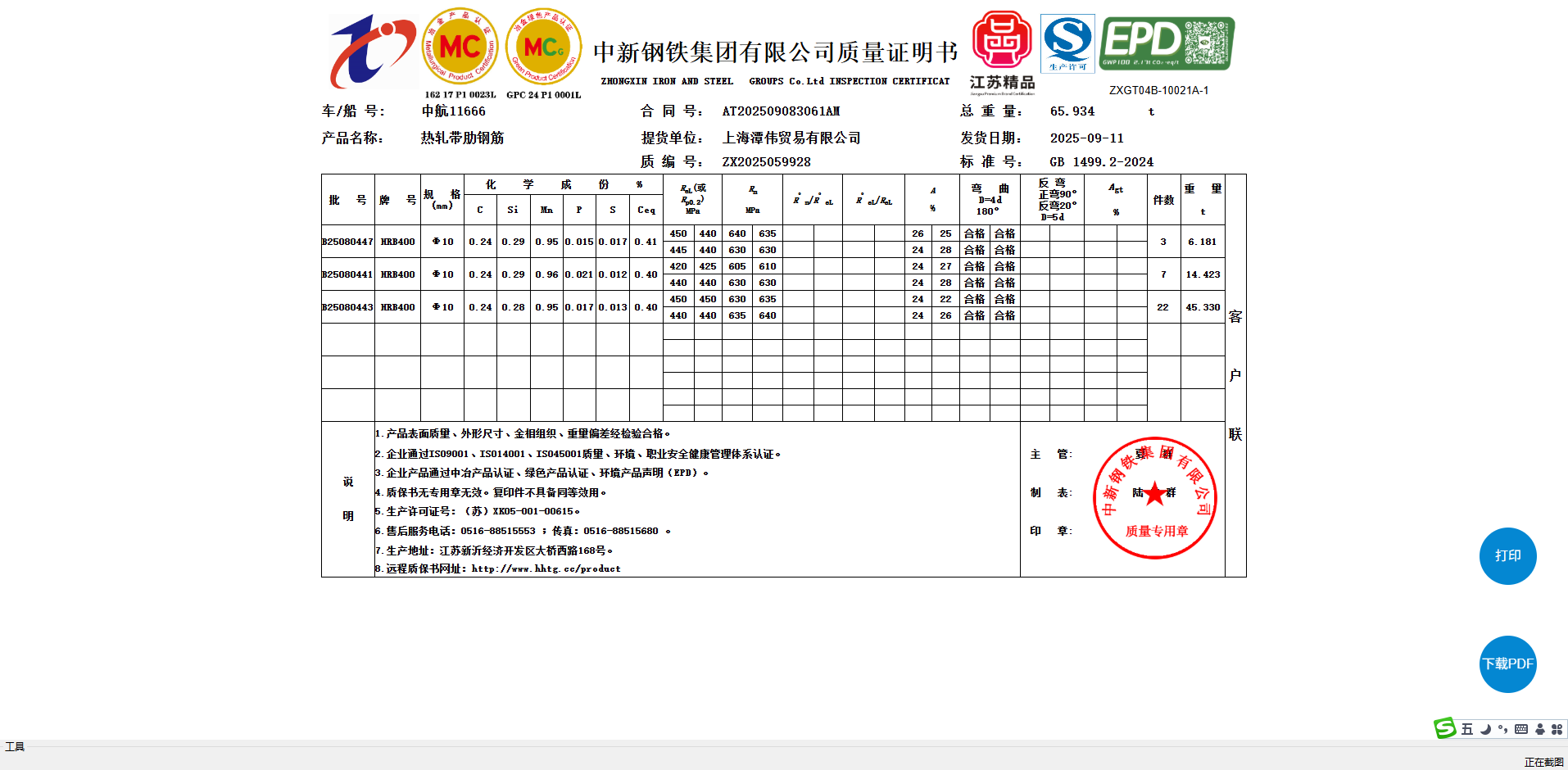 中新钢铁集团有限公司质量证明书上海潭伟贸易有限公司