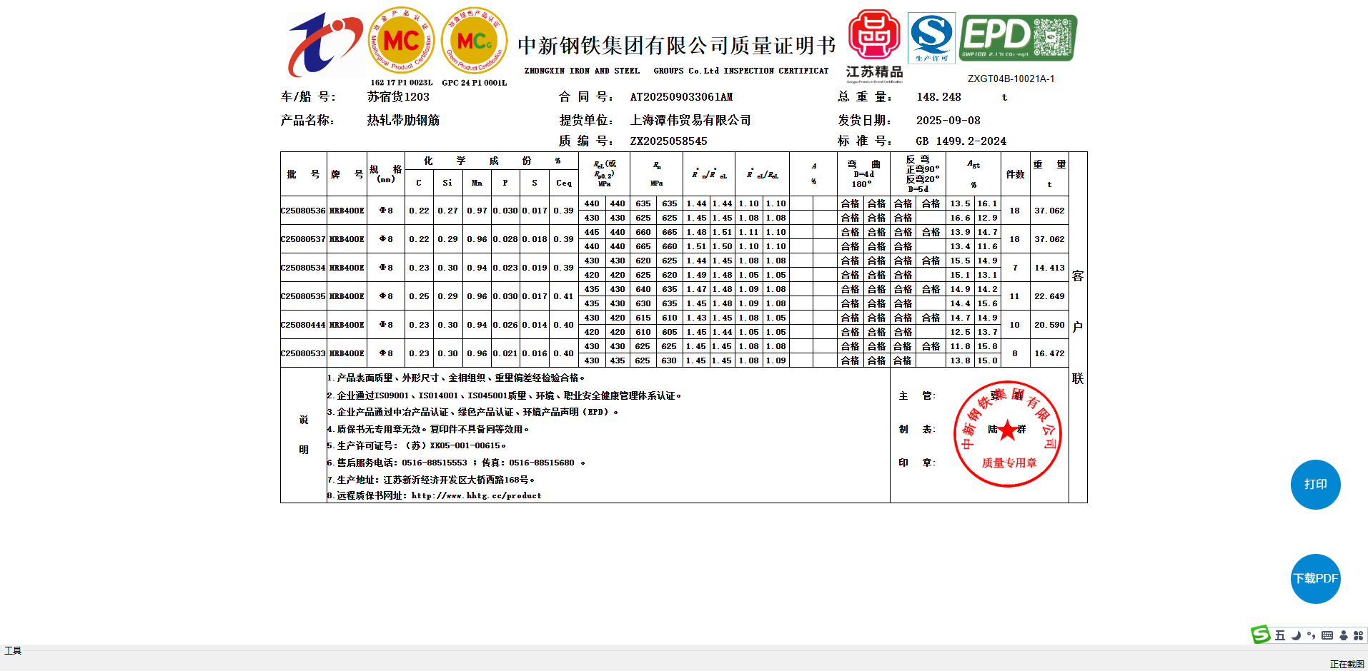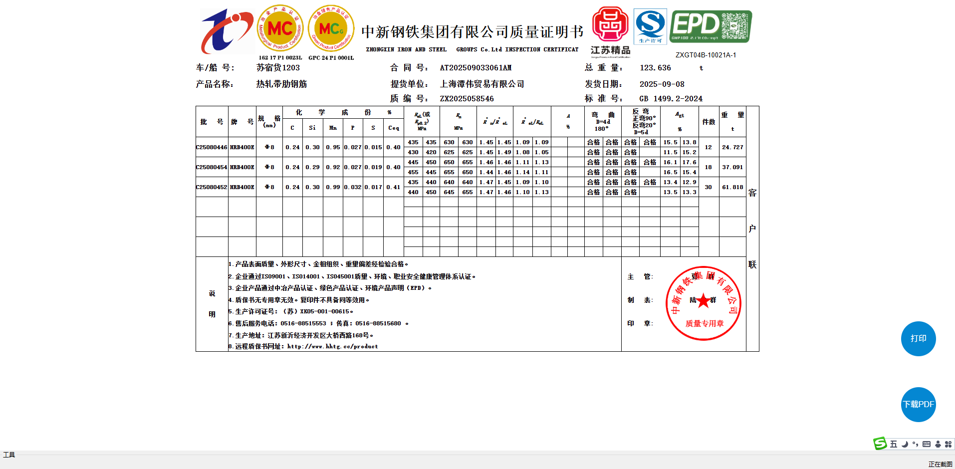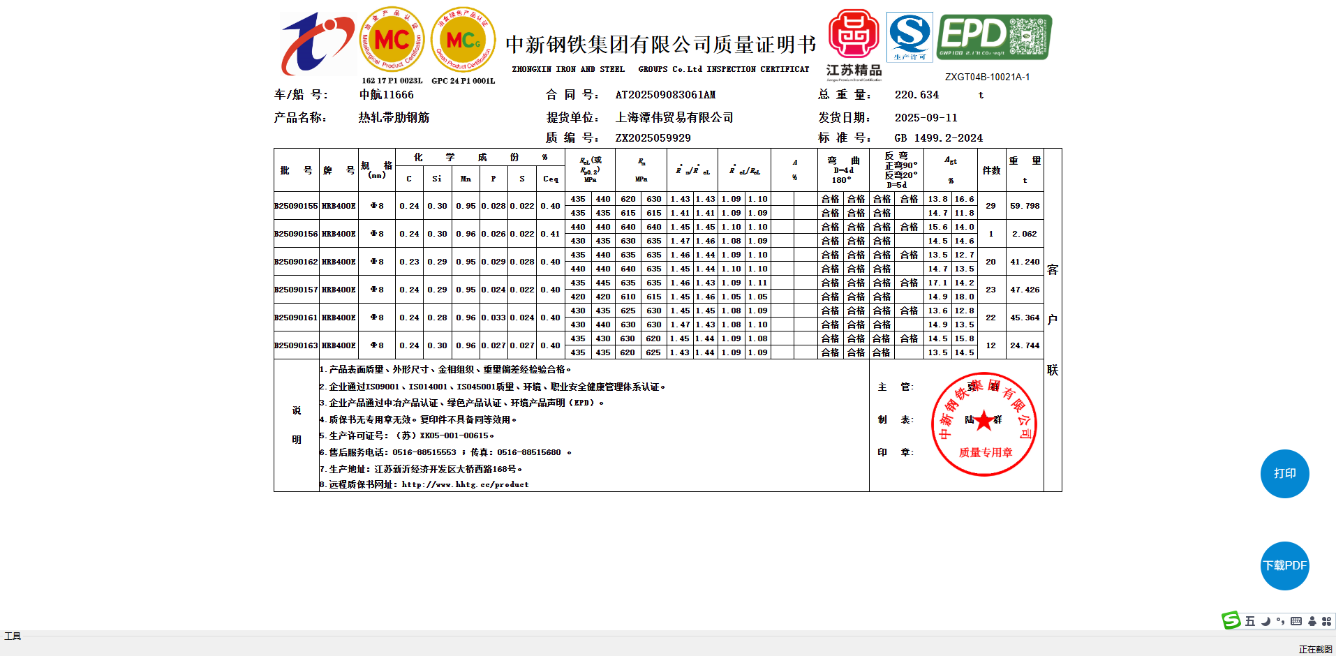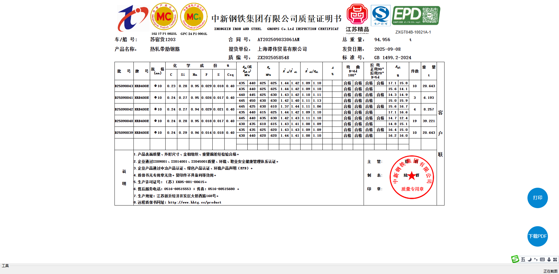 中新钢铁集团有限公司质量证明书上海潭伟贸易有限公司