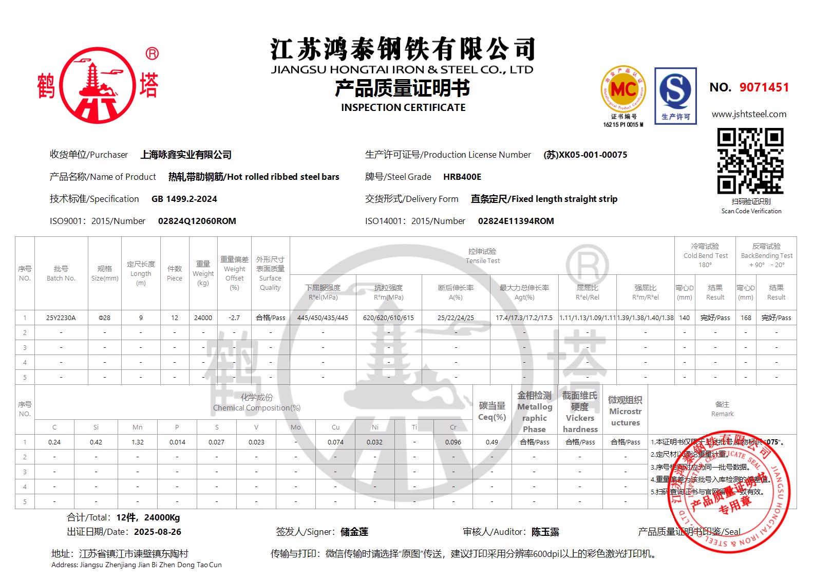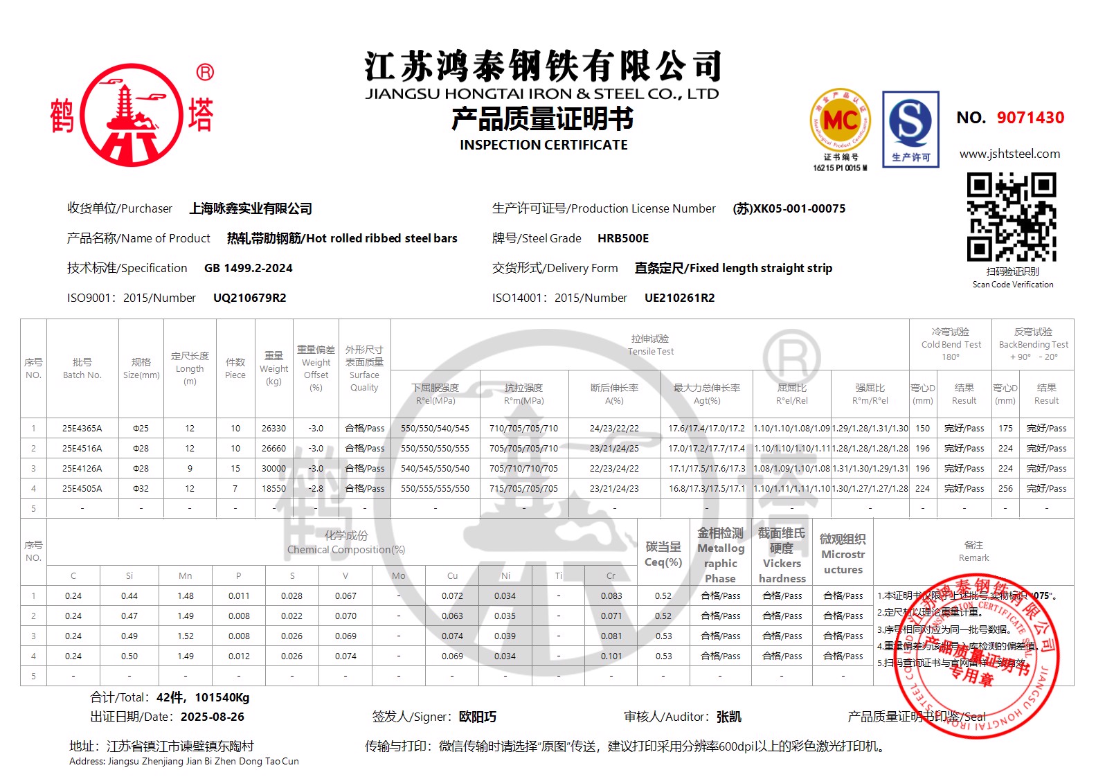 江苏鸿泰钢铁有限公司9071763上海咏鑫实业有限公司NOH NSO