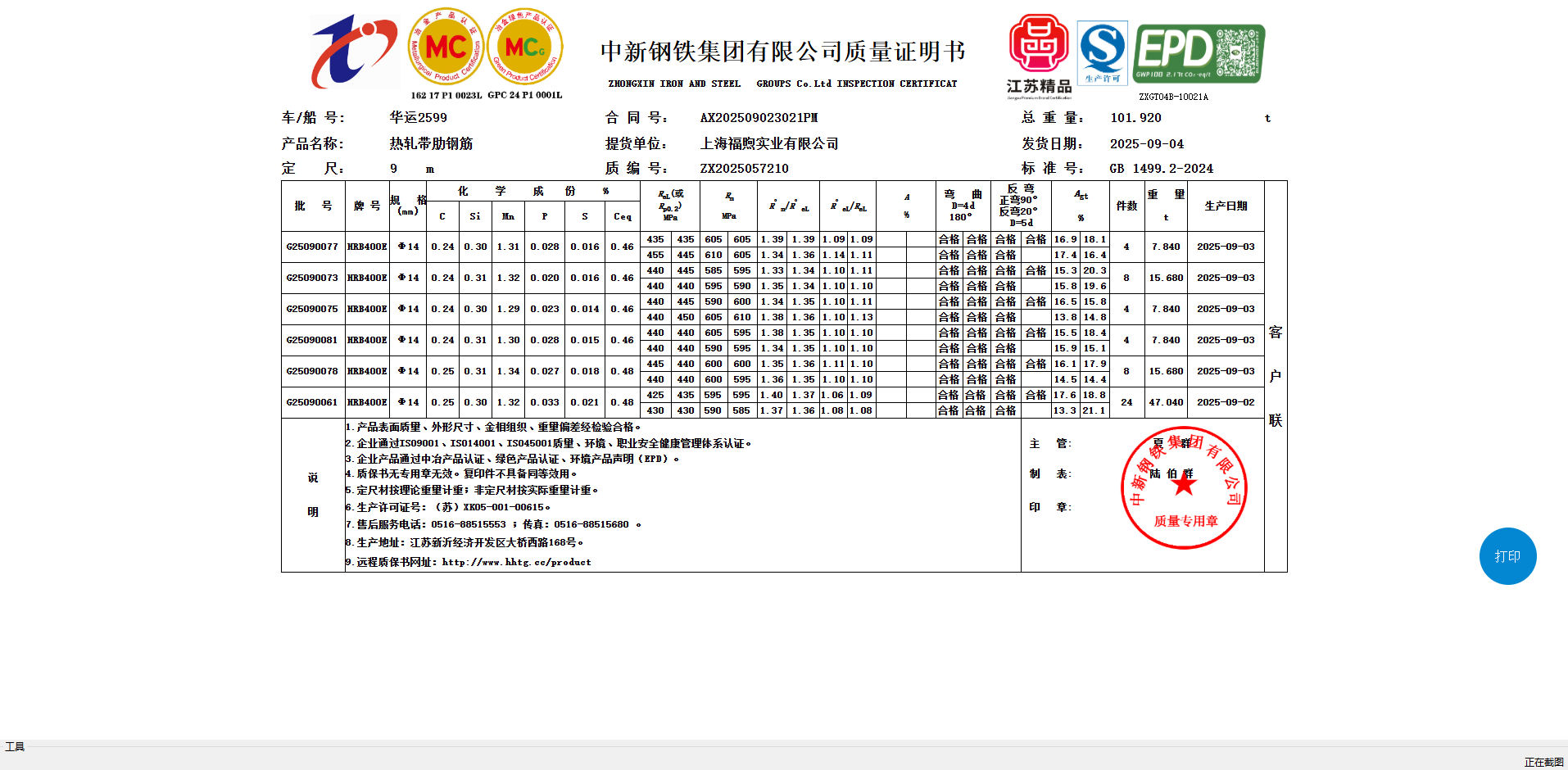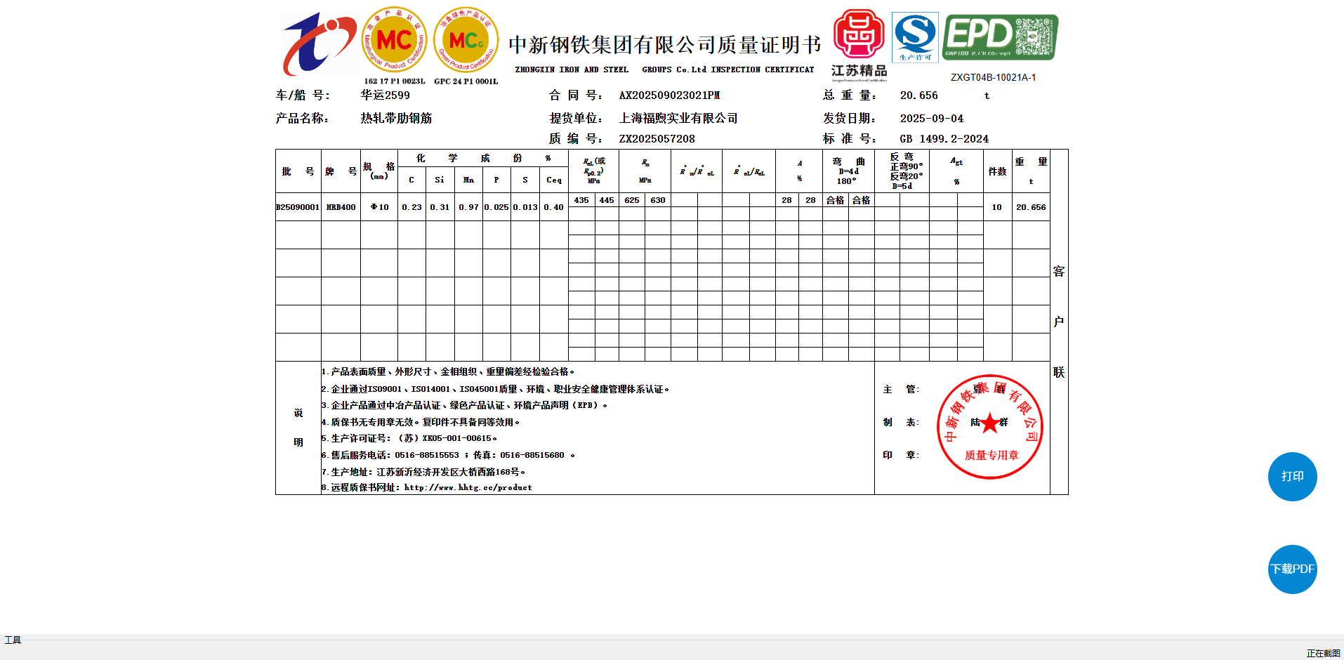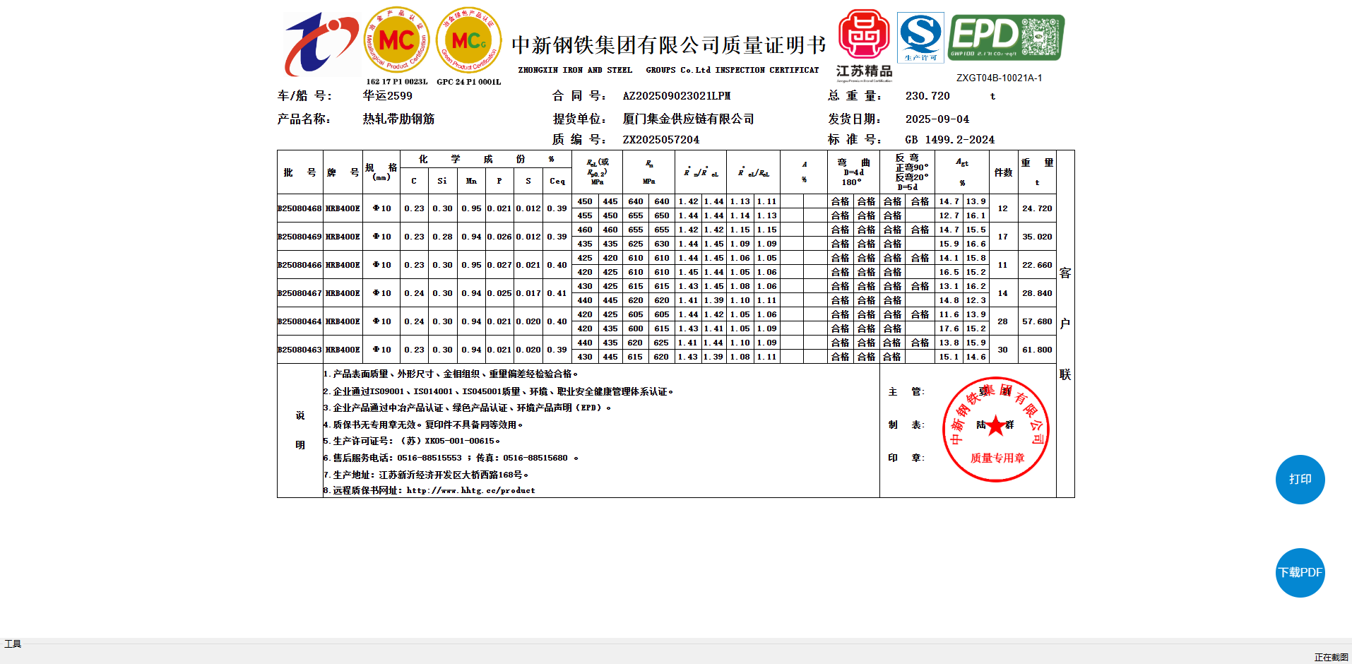 中新钢铁集团有限公司质量证明书厦门集金供应链有限公司