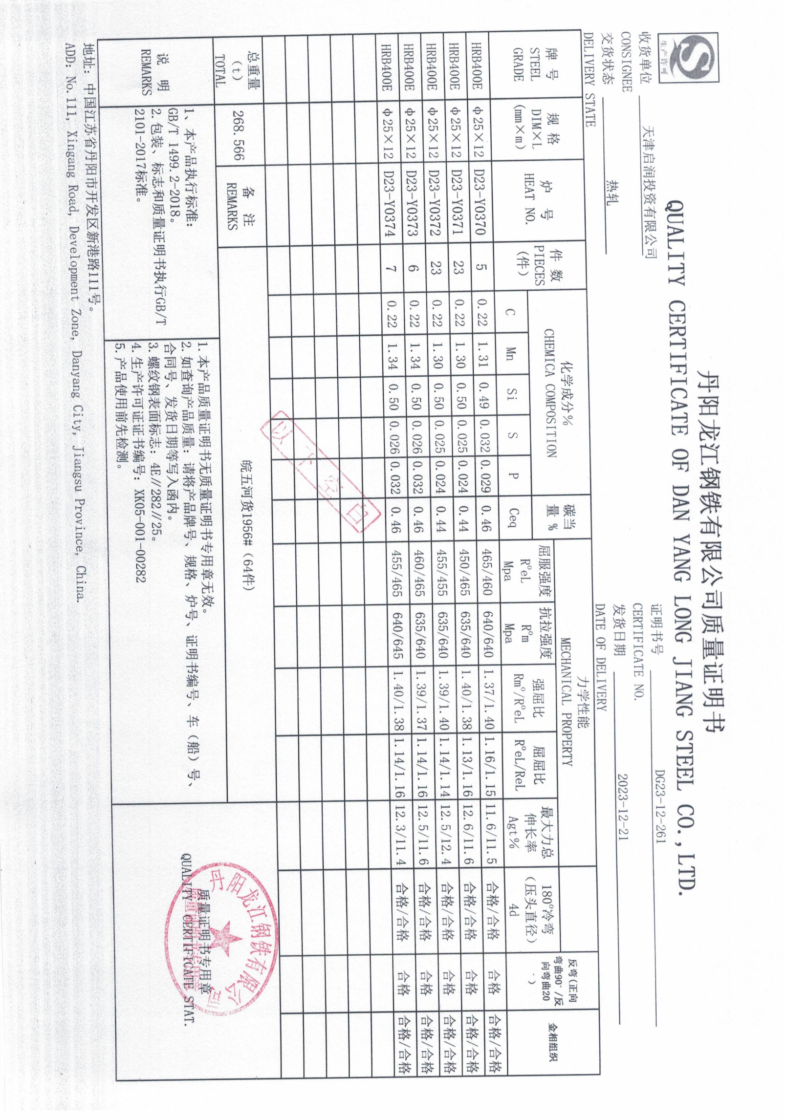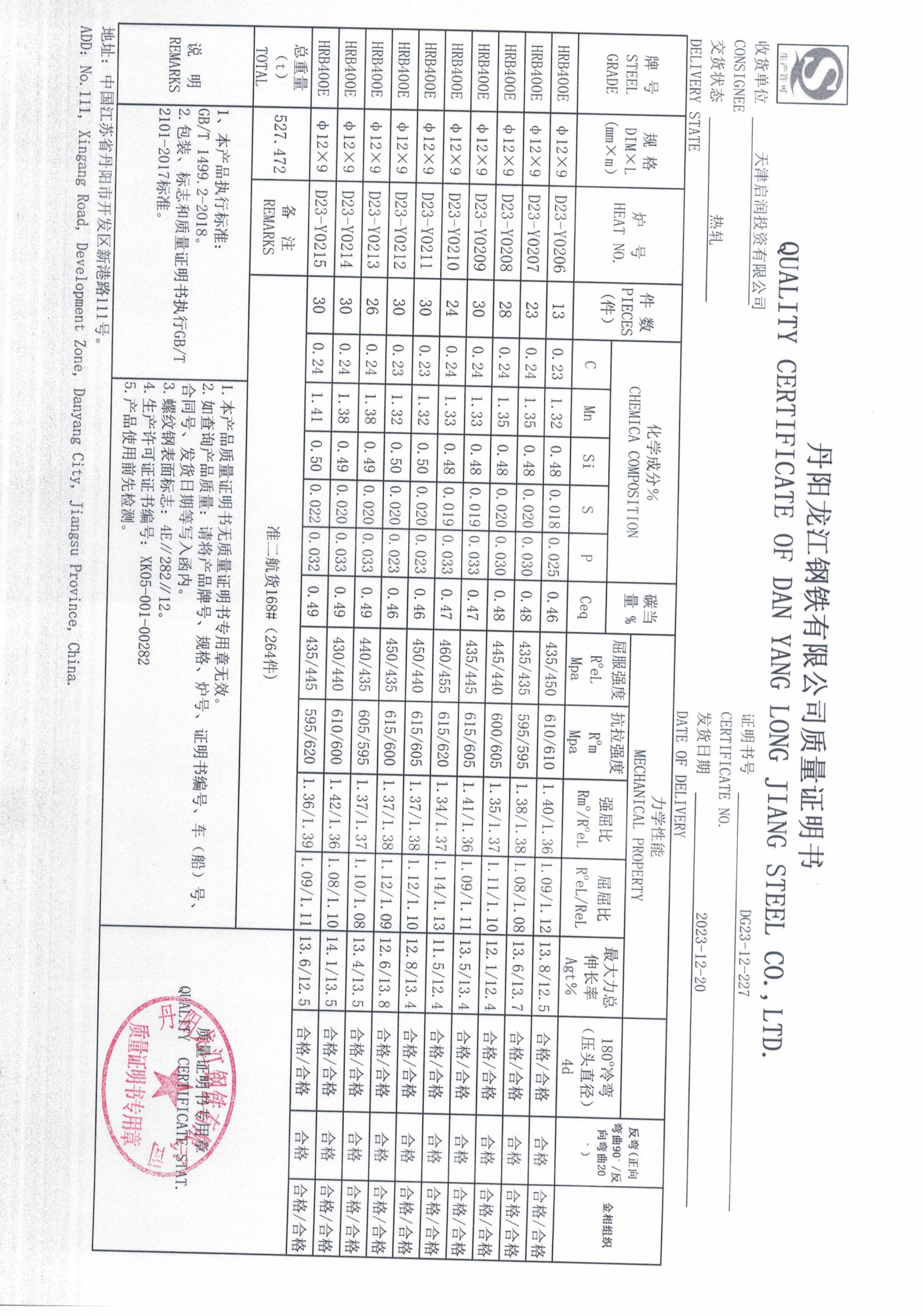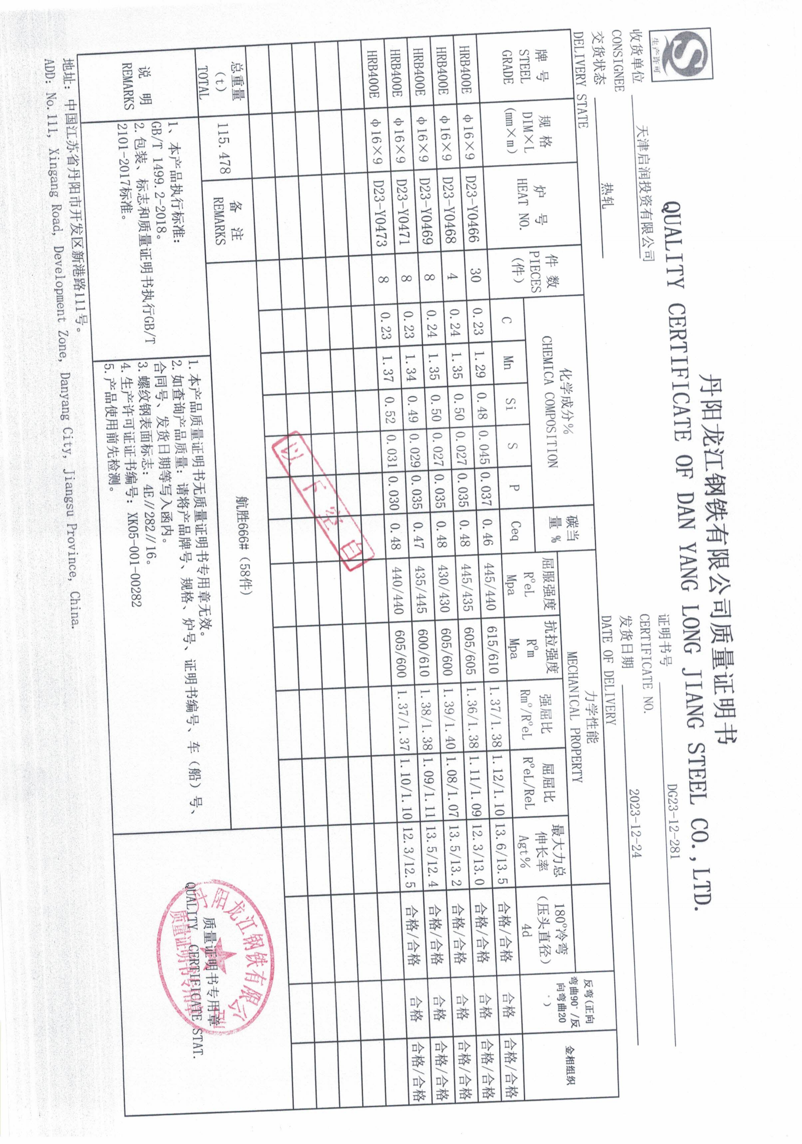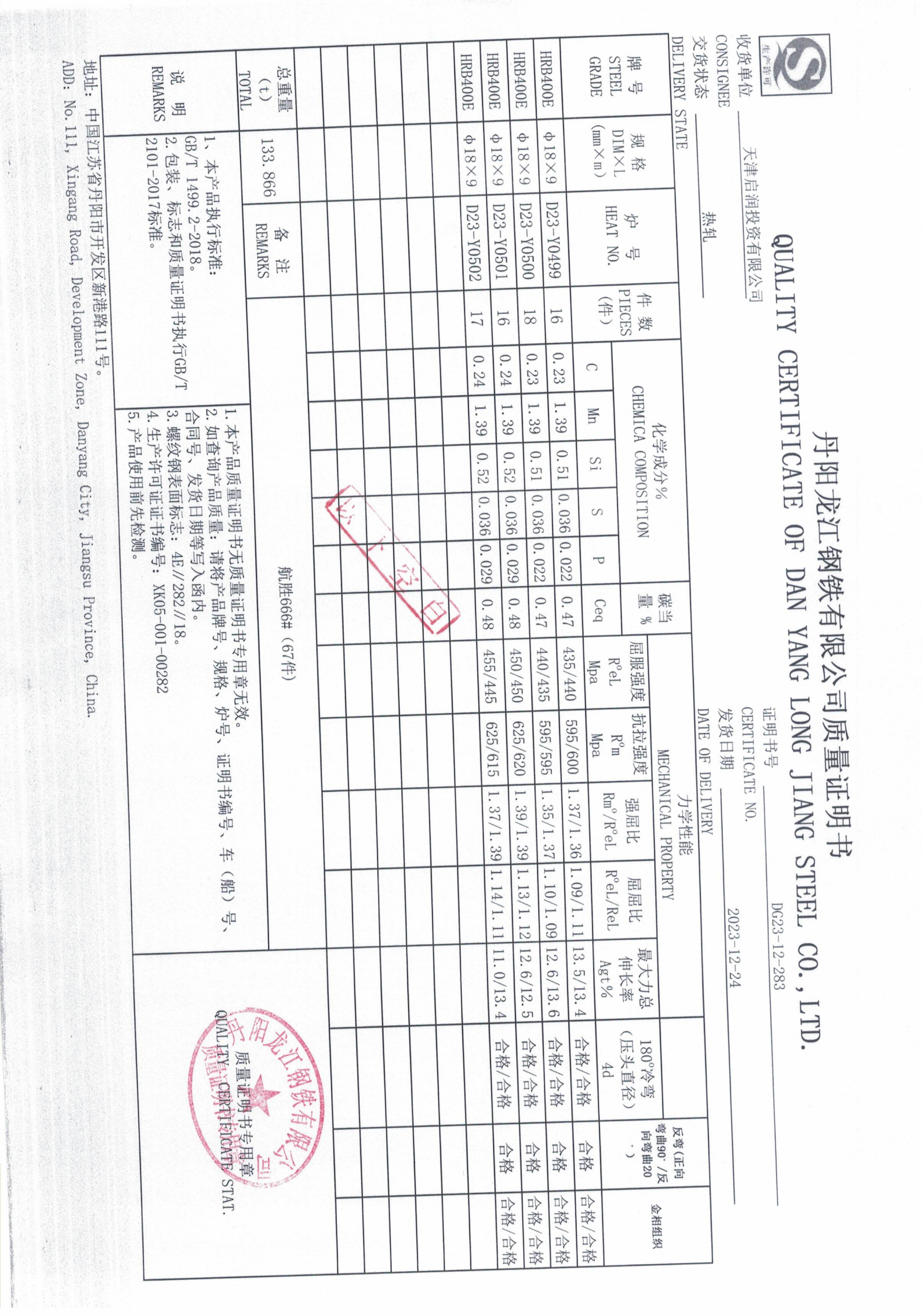 丹阳龙江钢铁有限公司质量证明书天津启润投资有限公司
