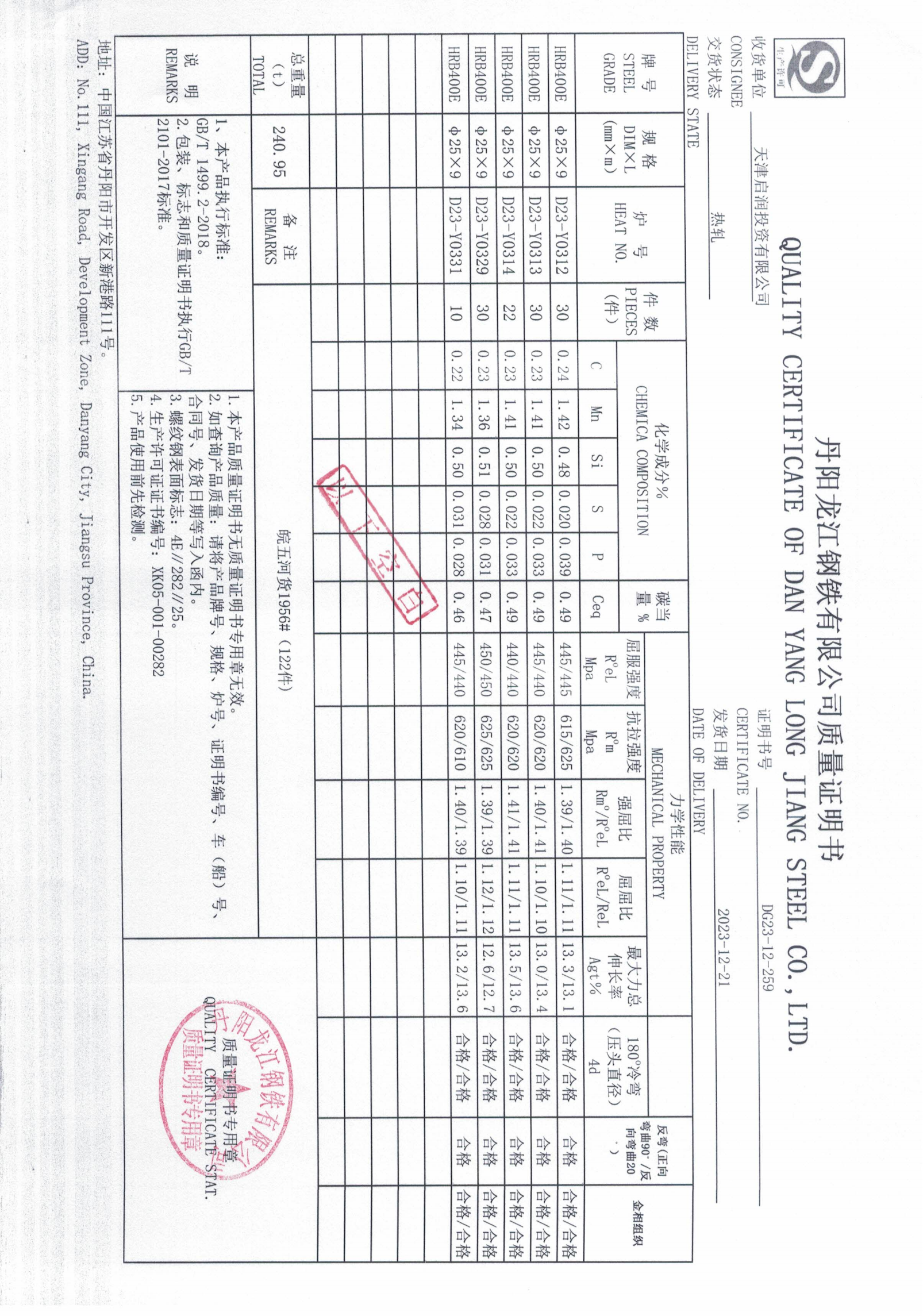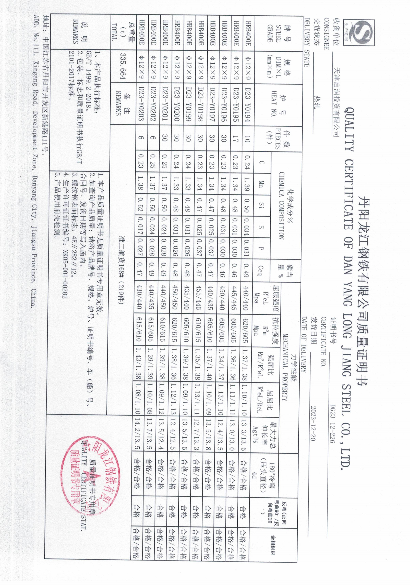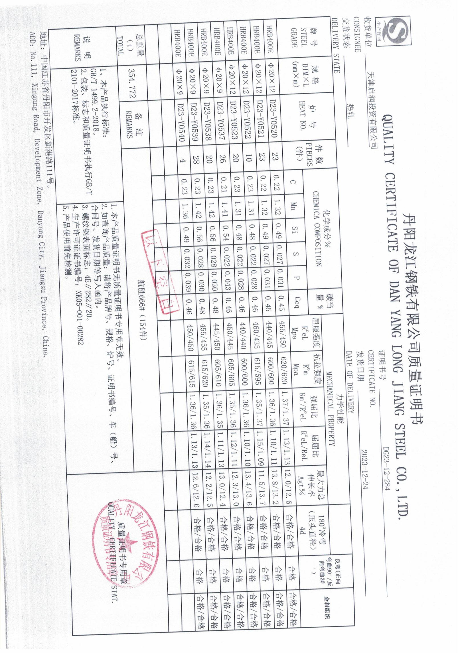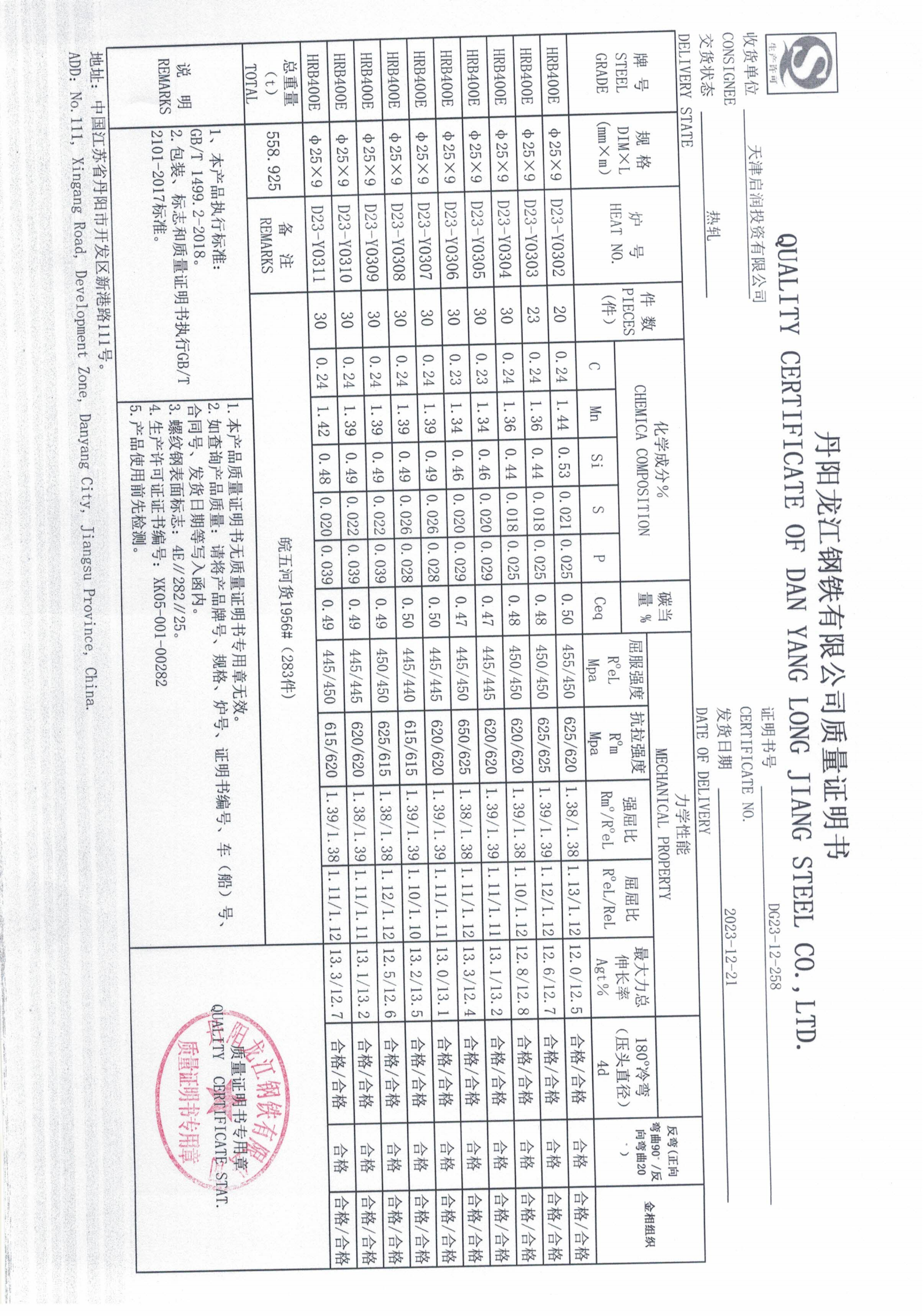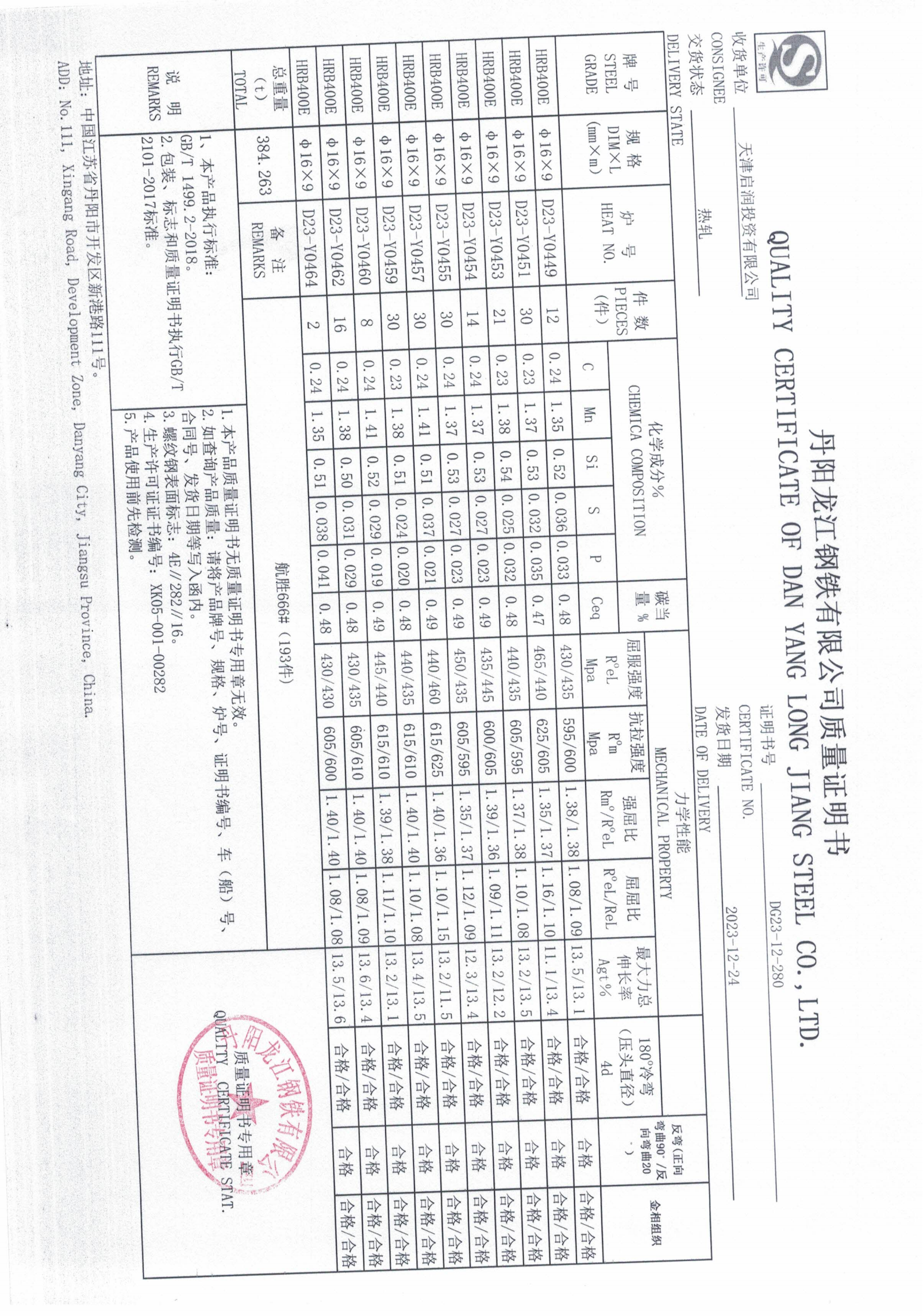 丹阳龙江钢铁有限公司质量证明书天津启润投资有限公司