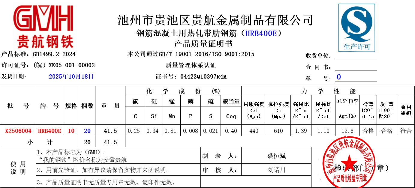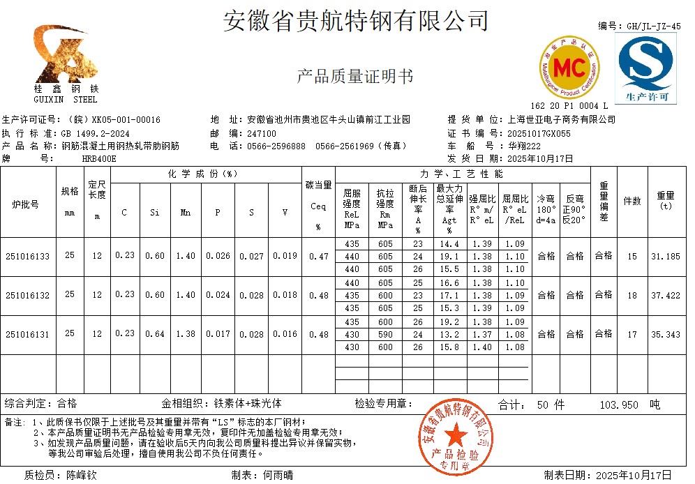 安徽省贵航特钢有限公司GH/JL-JZ-45提货单位:上海世亚电子商务有限公司3、如发现产品质量问题,请在验收后5天内向我公司质量科提出异议并保留实物,等我公司审验后处理,擅自使用我公司不负任何责任。