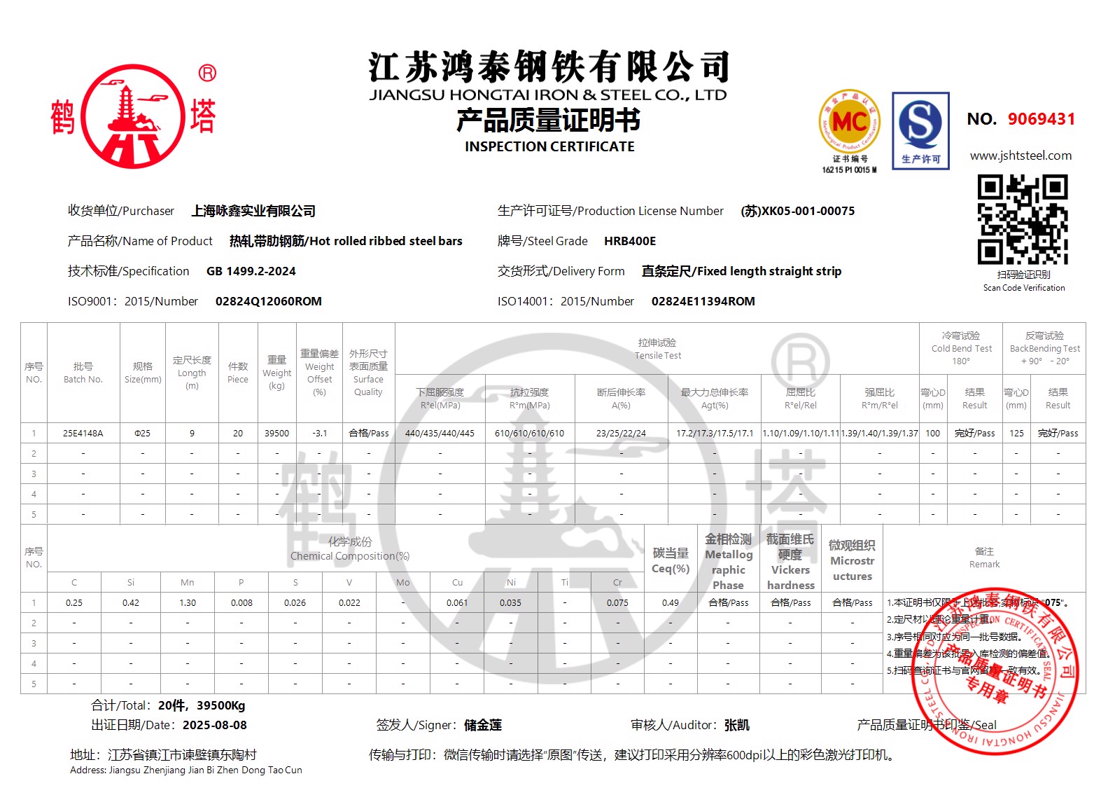 江苏鸿泰钢铁有限公司9069431上海咏鑫实业有限公司