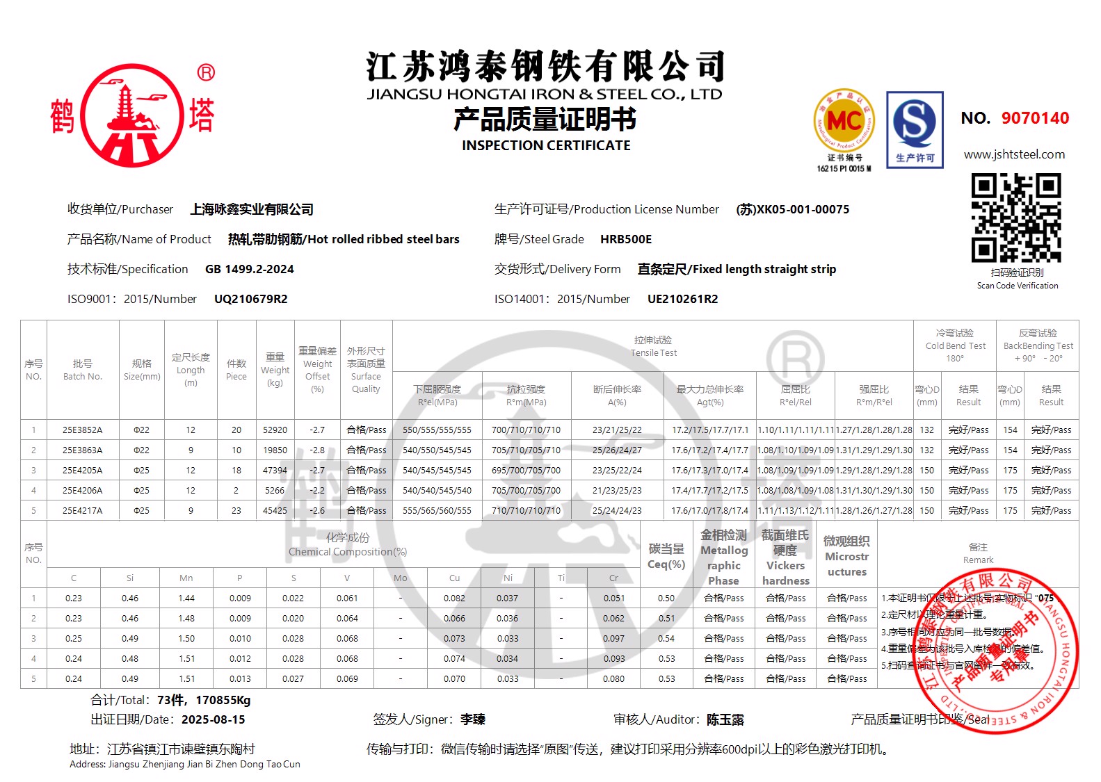 江苏鸿泰钢铁有限公司9070138上海咏鑫实业有限公司NOHI