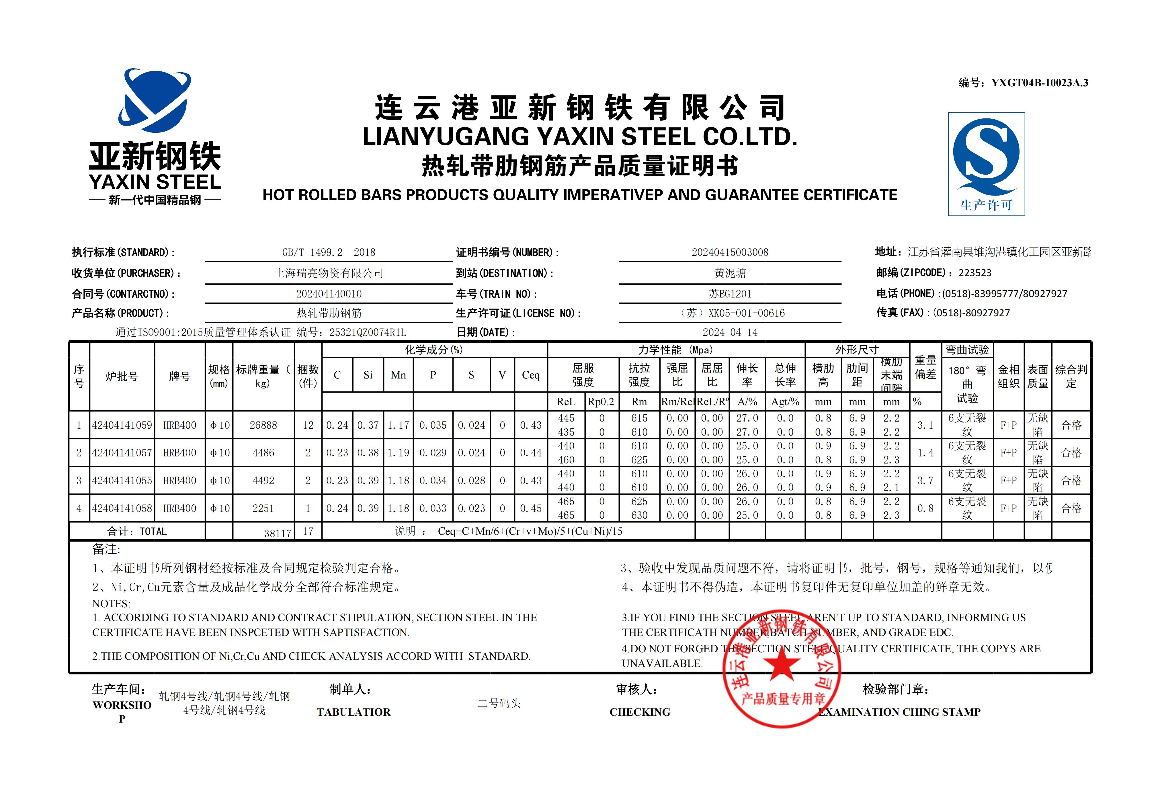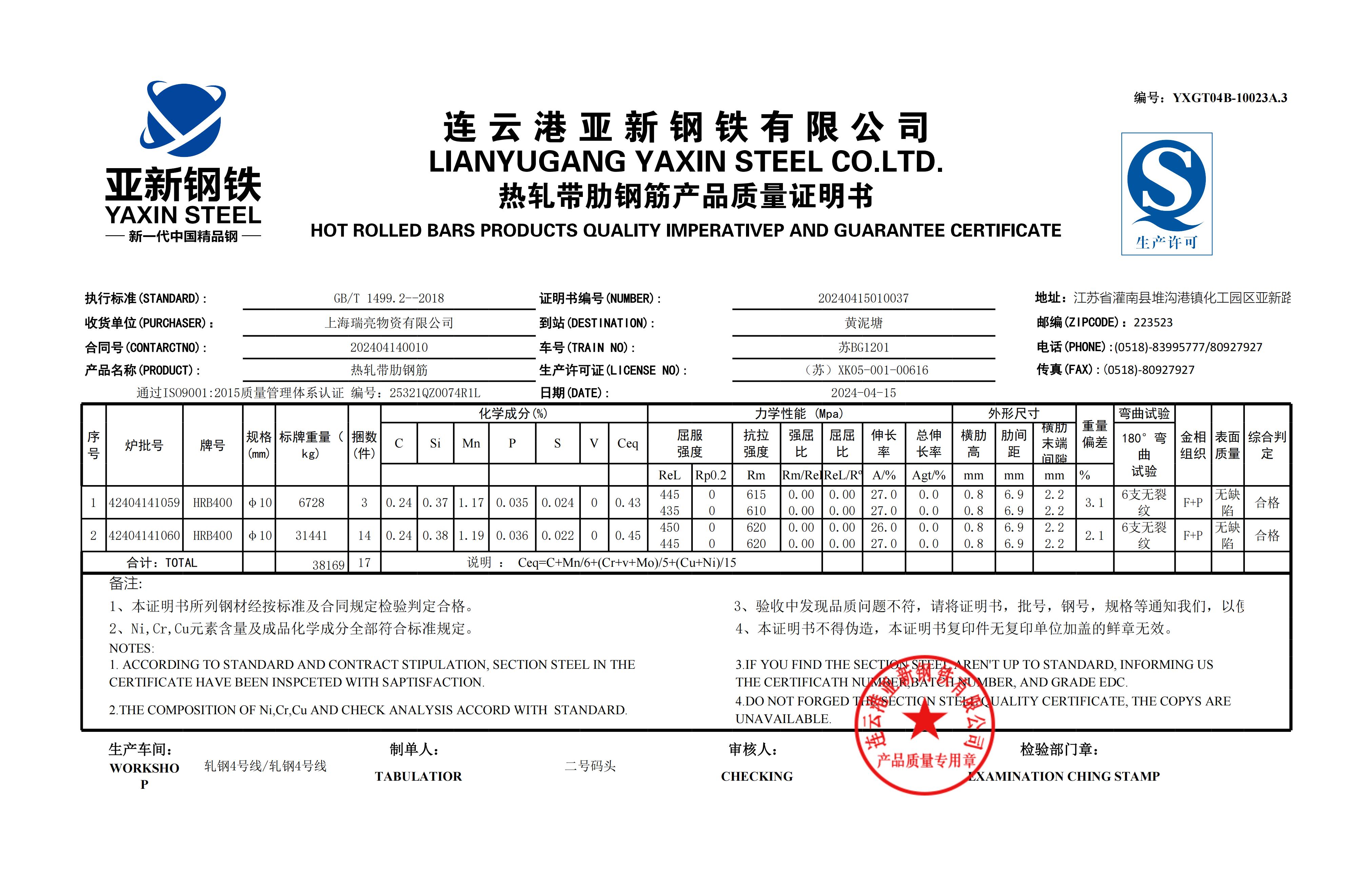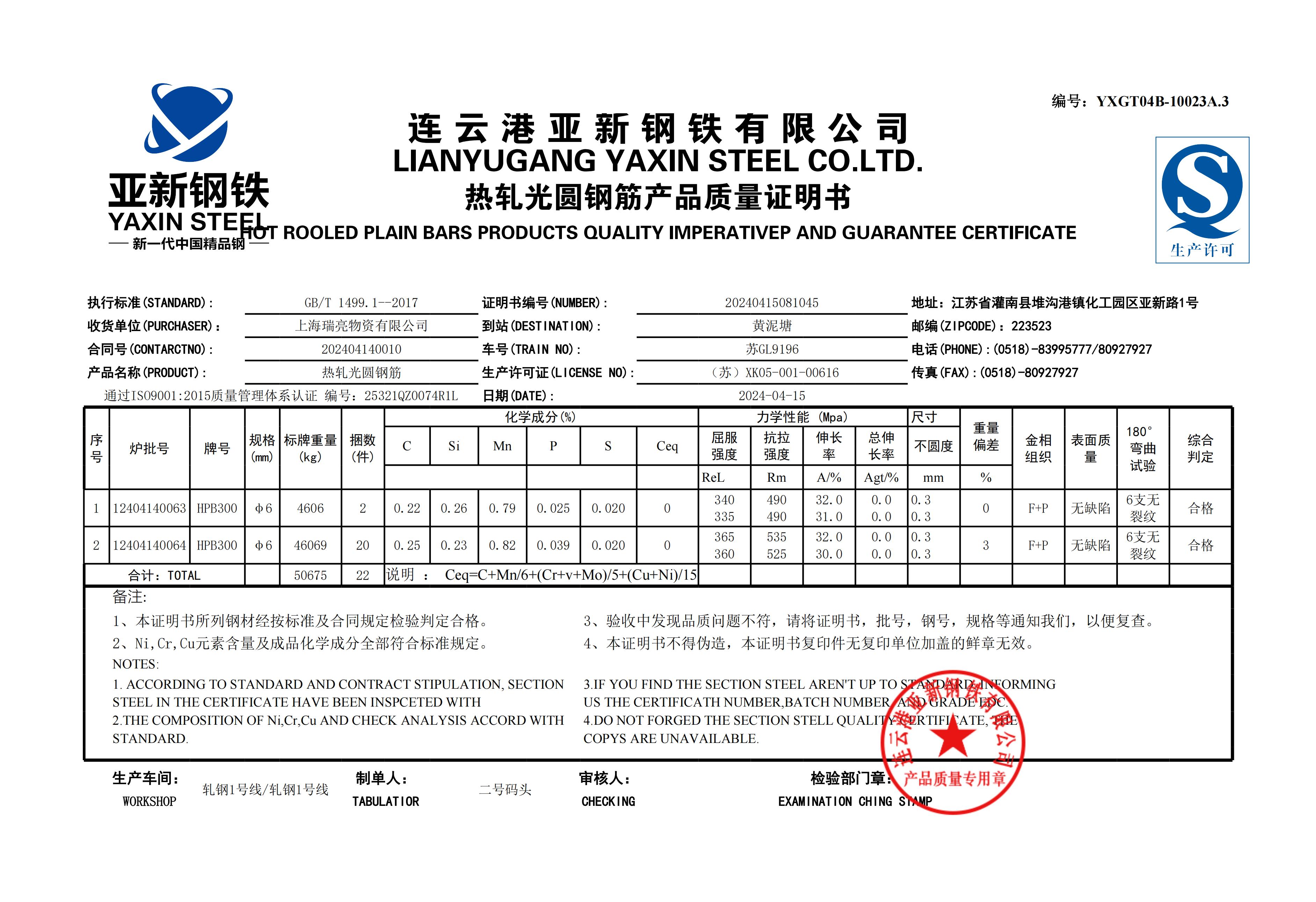 YXGT04B-10023A.3连云港亚新钢铁有限公司上海瑞亮物资有限公司NOTES: