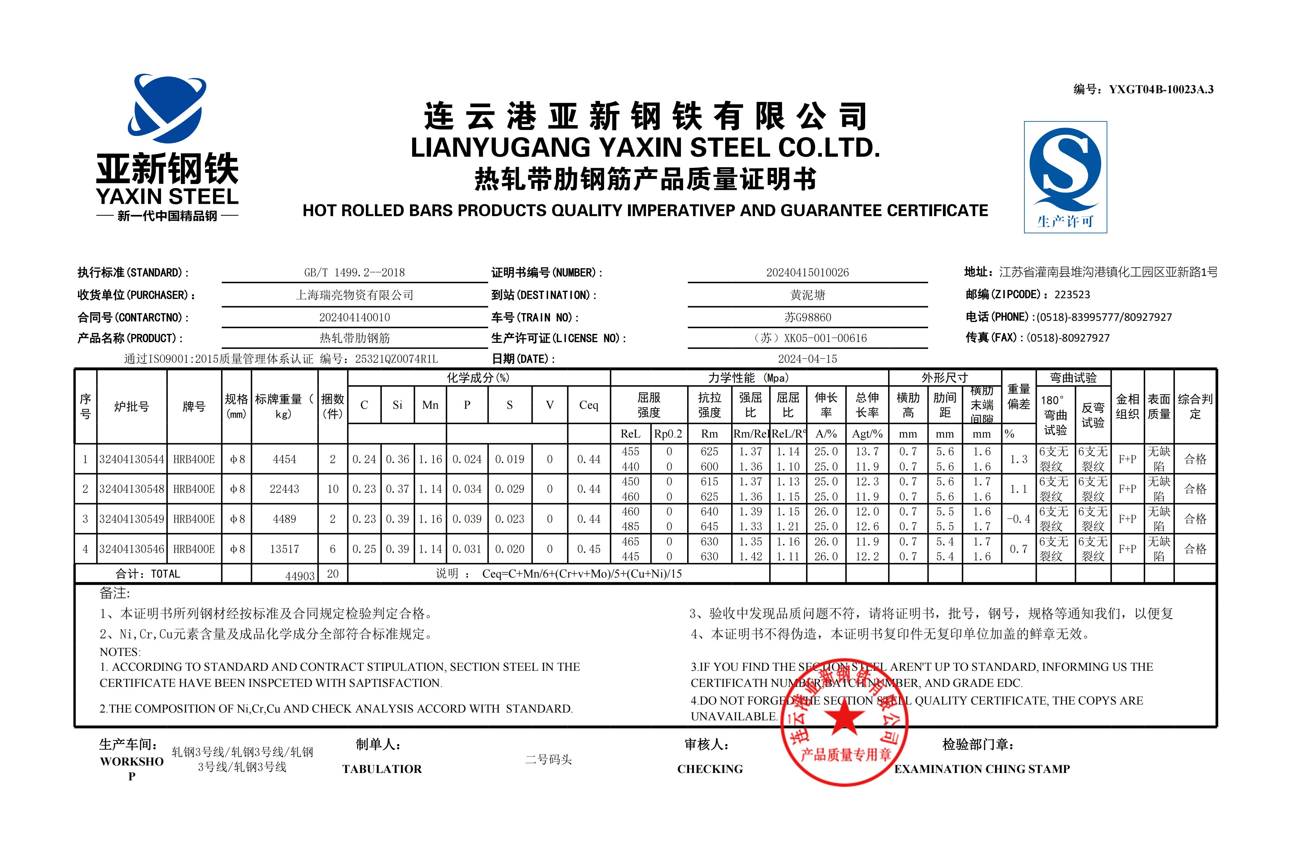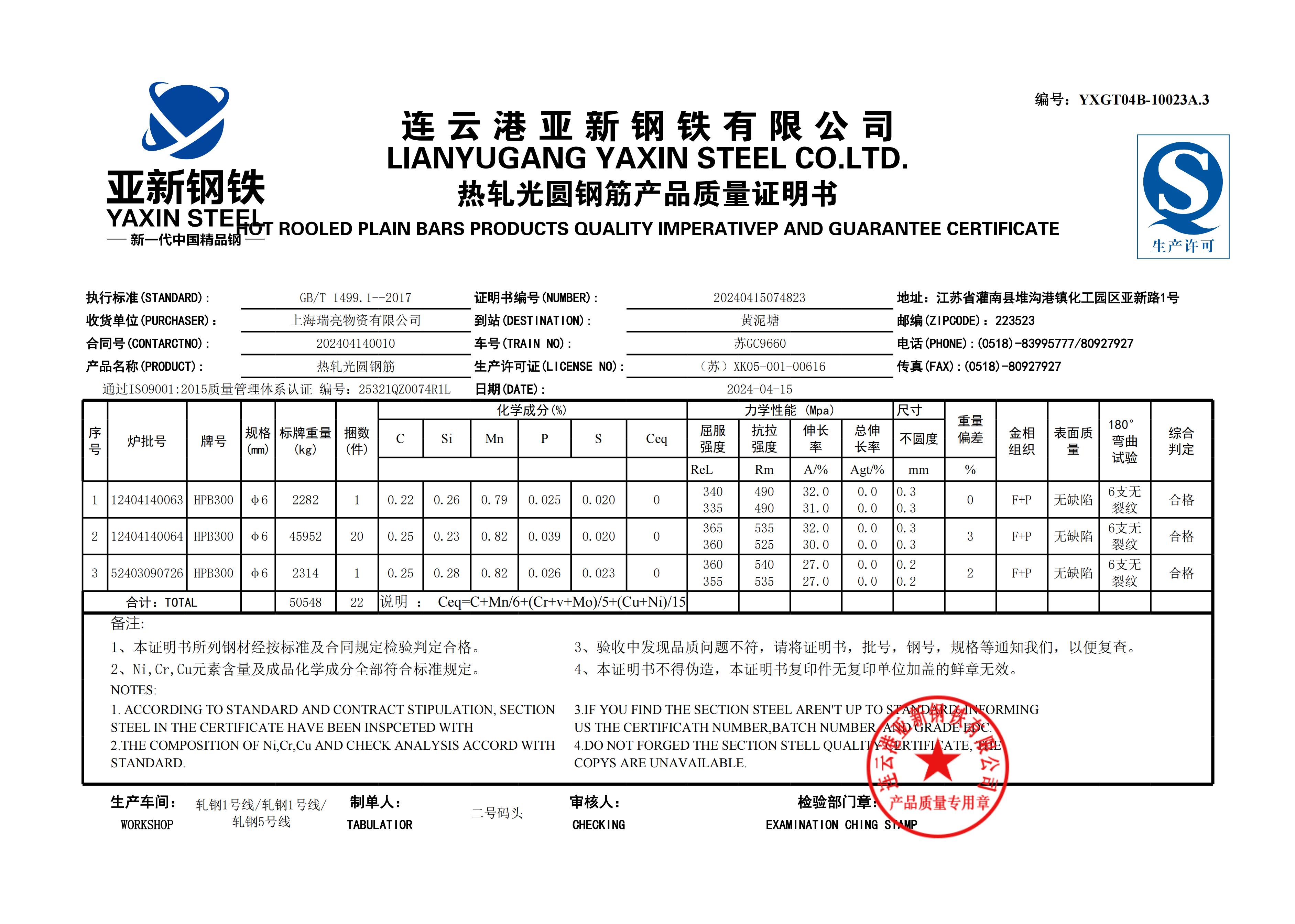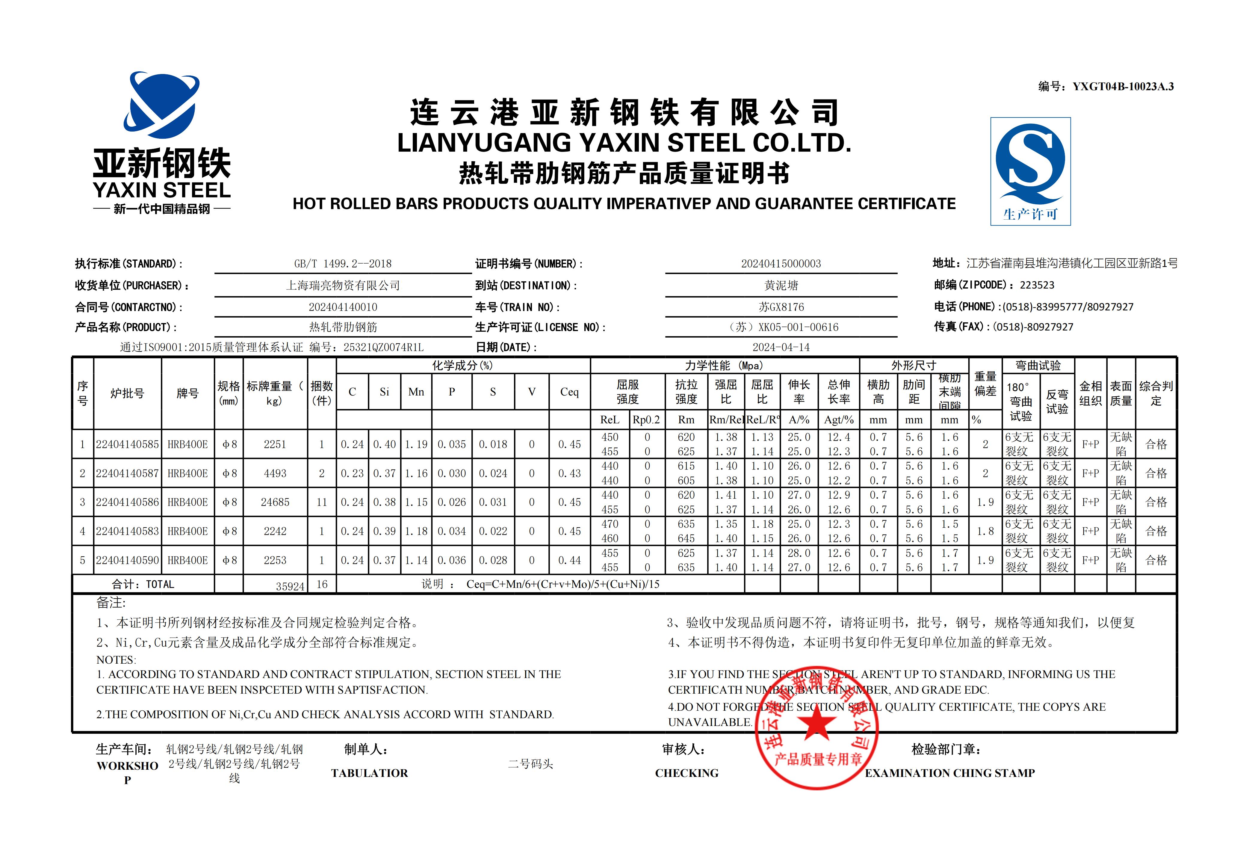 YXGT04B-10023A.3连云港亚新钢铁有限公司上海瑞亮物资有限公司NOTES: