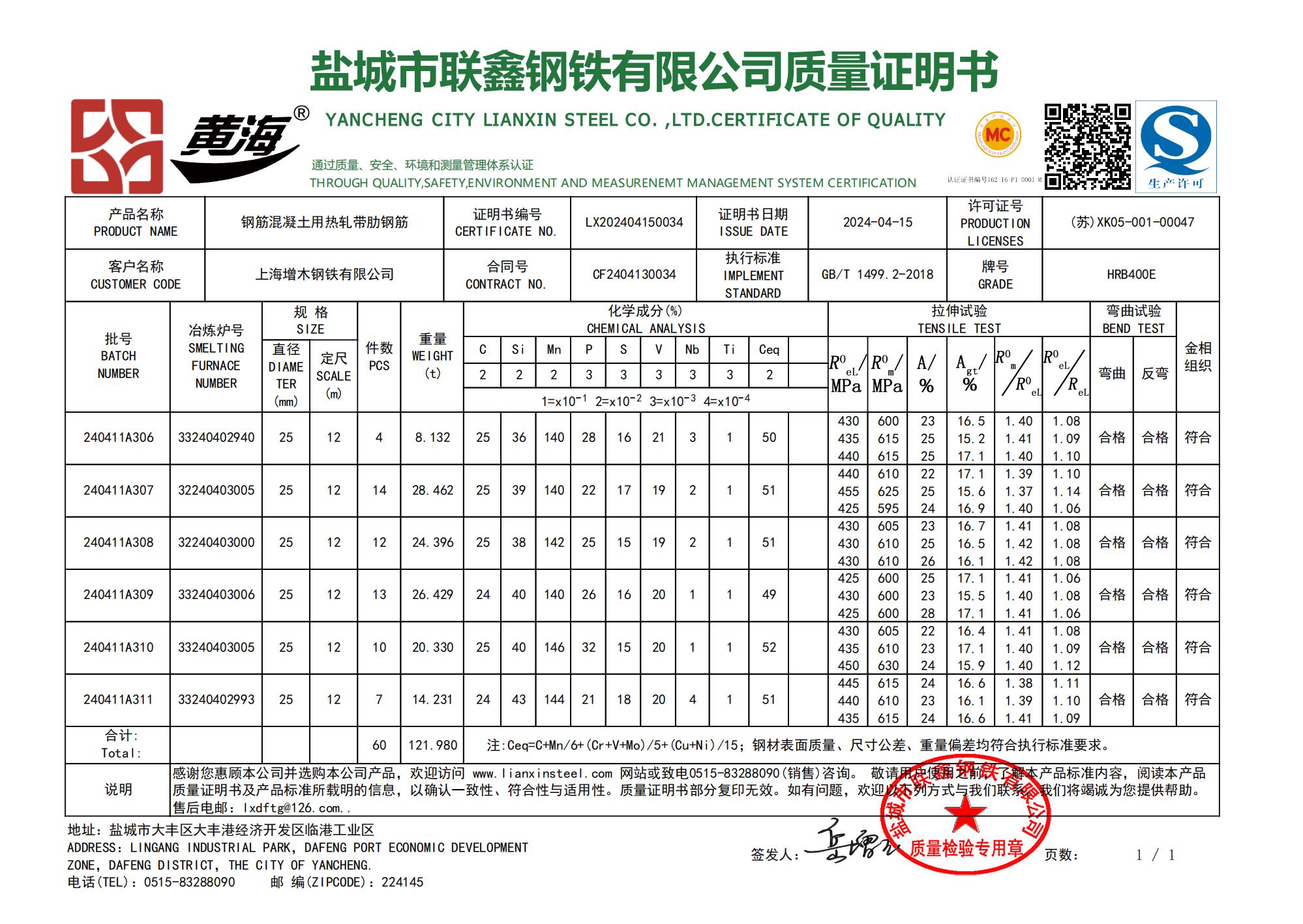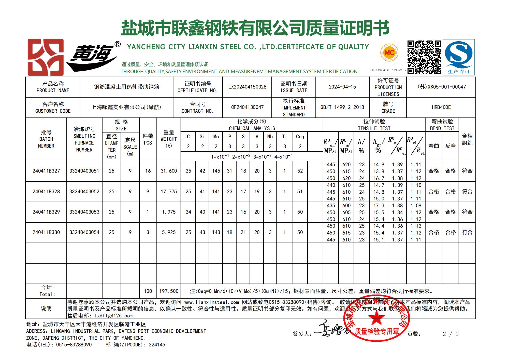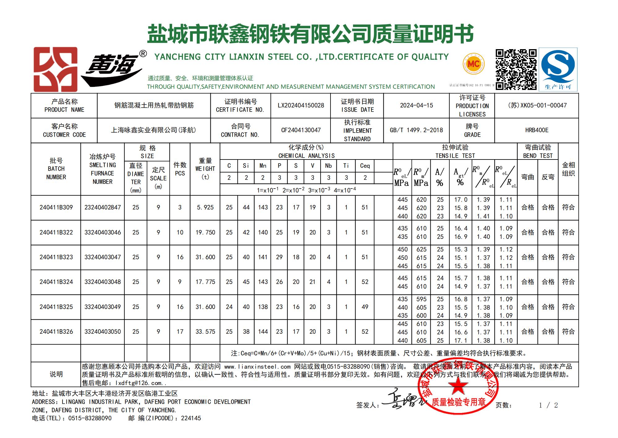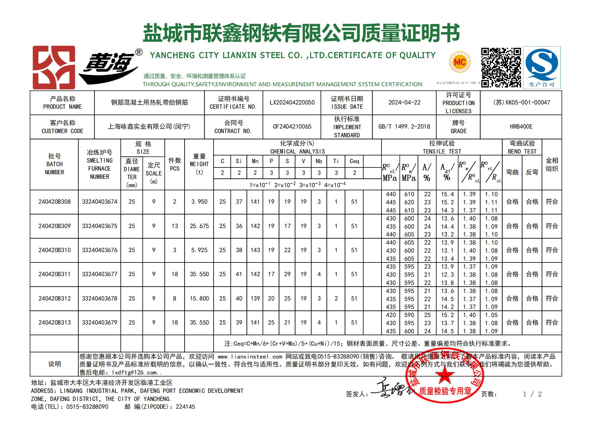 盐城市联鑫钢铁有限公司质量证明书上海咏鑫实业有限公司(泽航)感谢您惠顾本公司并选购本公司产品,欢迎访问www.lianxinsteel.com网站或致电0515-8328090(销售)咨询。敬请用总使用之前,了解本产品标准内容,阅读本产品