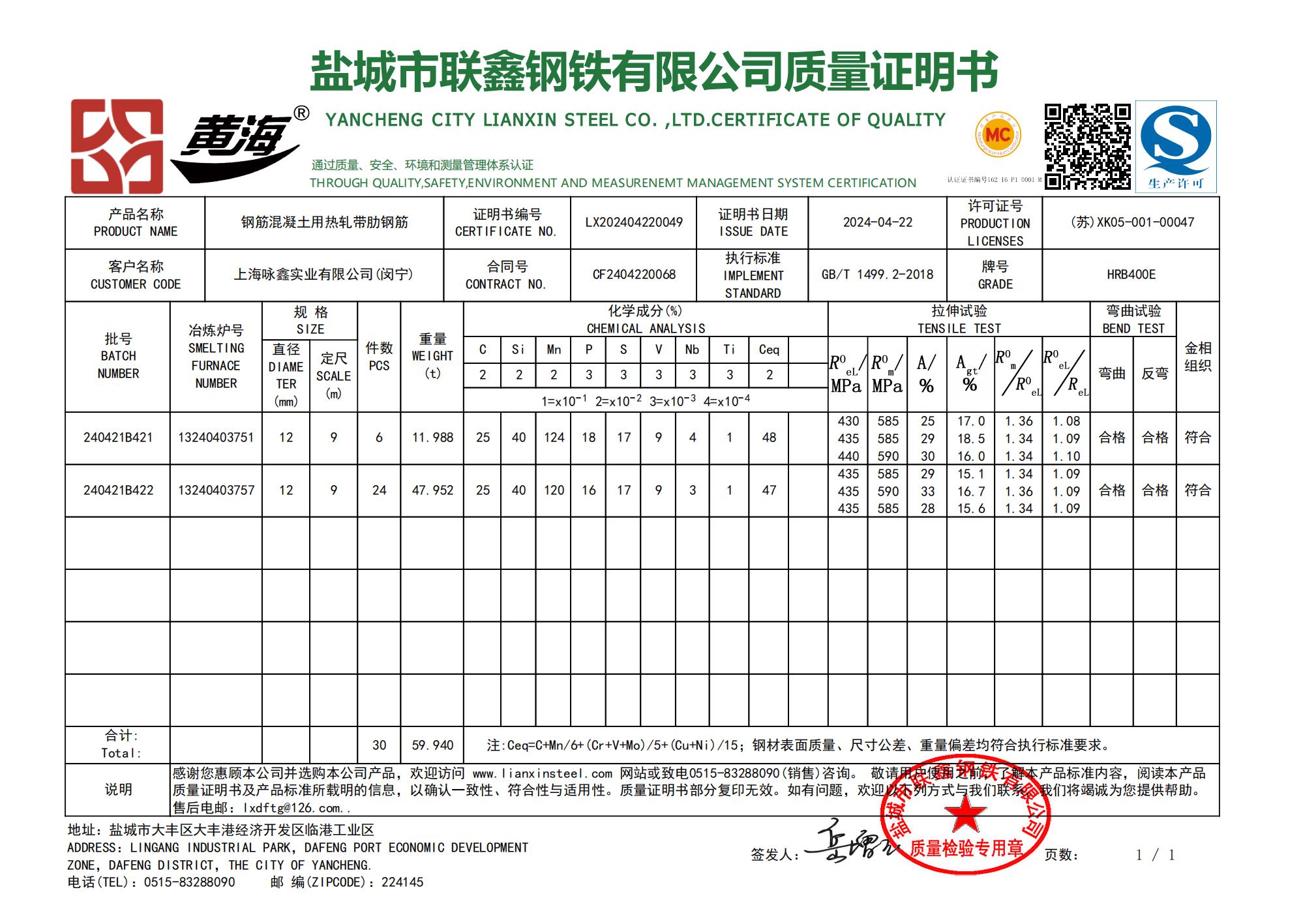 盐城市联鑫钢铁有限公司质量证明书上海咏鑫实业有限公司(闵宁)感谢您惠顾本公司并选购本公司产品,欢迎访问www.lianxinsteel.com网站或致电0515-8328090(销售)咨询。敬请用总使用之前,了解本产品标准内容,阅读本产品