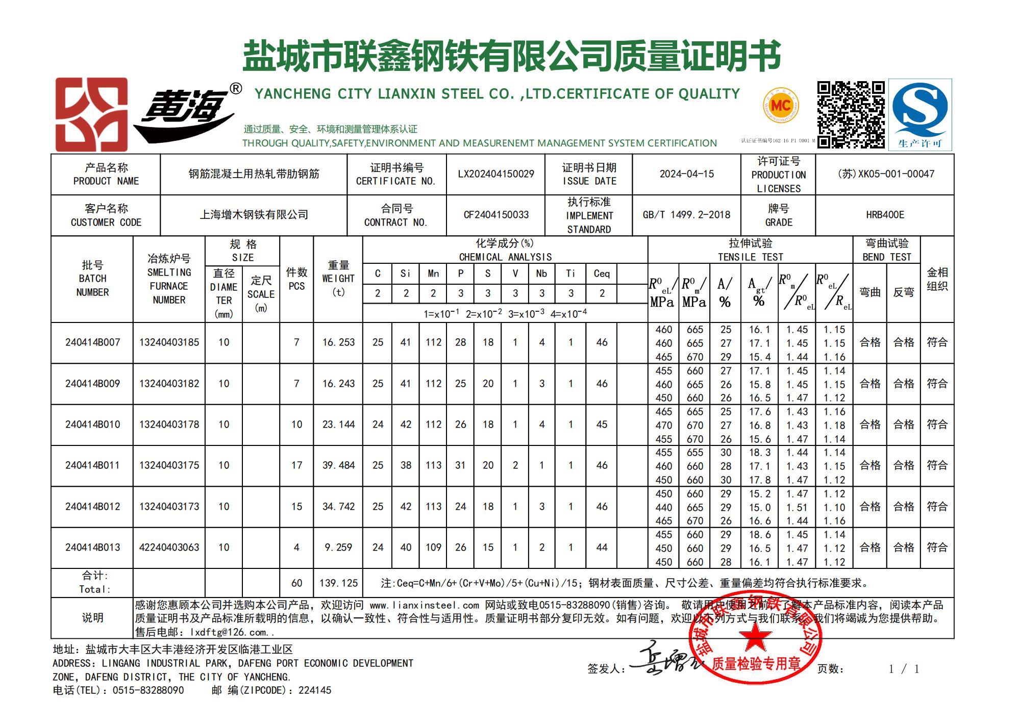 盐城市联鑫钢铁有限公司质量证明书上海增木钢铁有限公司感谢您惠顾本公司并选购本公司产品,欢迎访问www.lianxinsteel.com网站或致电0515-8328090(销售)咨询。敬请用总使用之前,了解本产品标准内容,阅读本产品