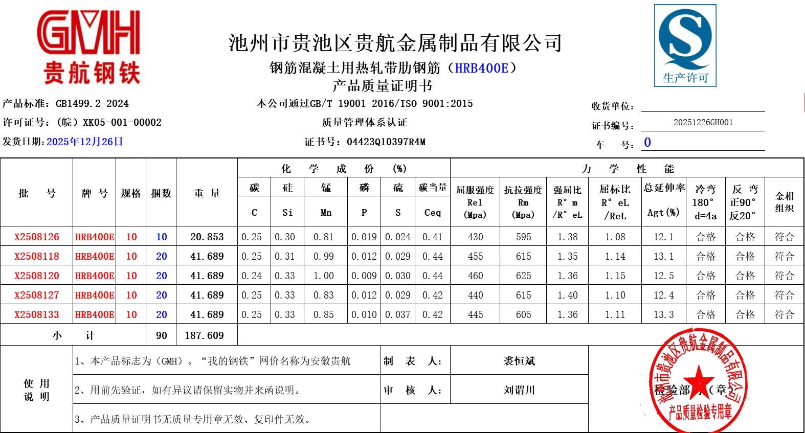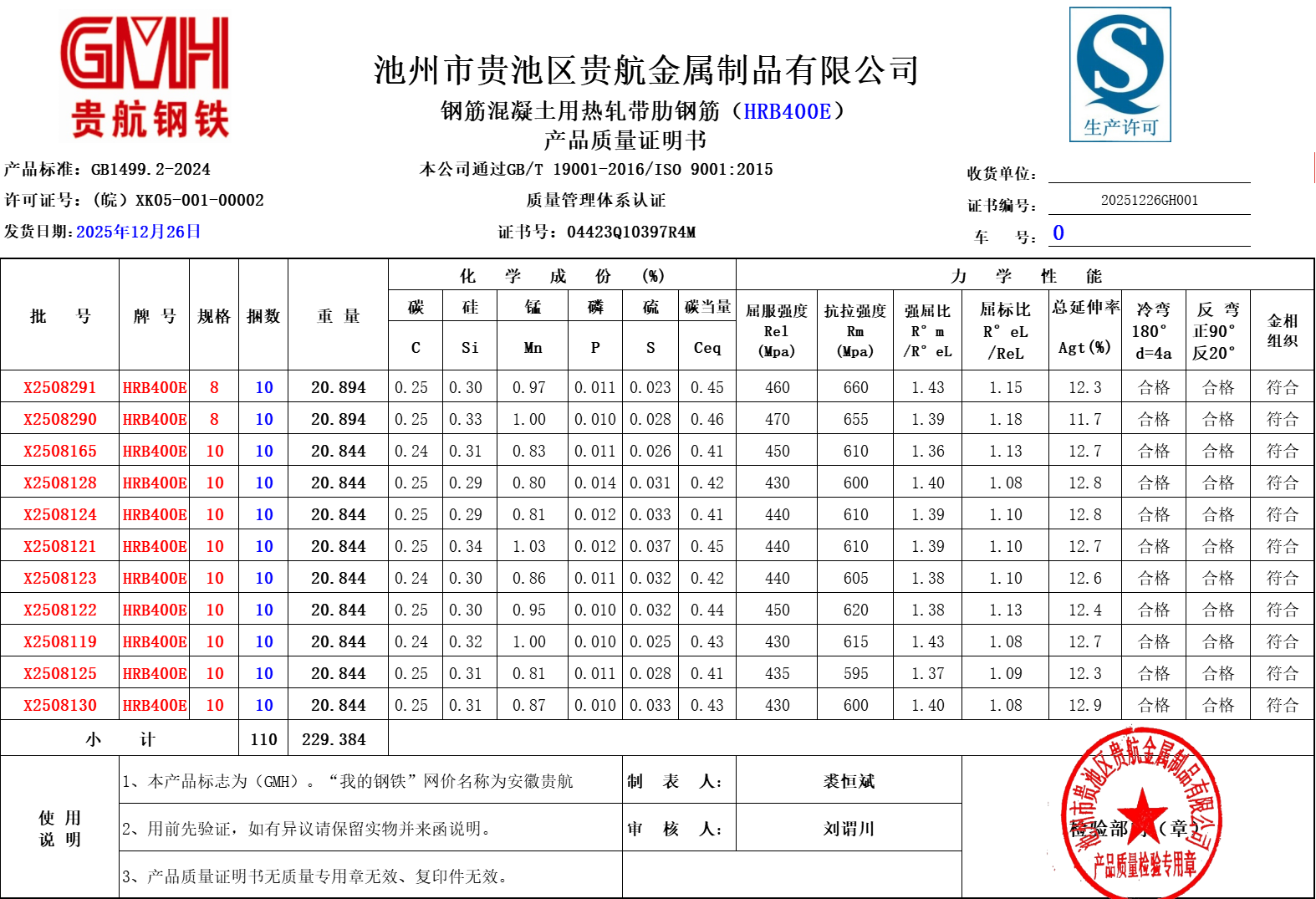 安徽省贵航特钢有限公司GH/JL-JZ-45提货单位:陕西建工材料设备物流集团有限公司3、如发现产品质量问题,请在验收后5天内向我公司质量科提出异议并保留实物,等我公司审验后处理,擅自使用我公司不负任何责任。