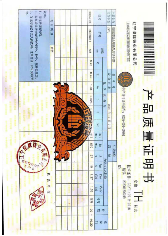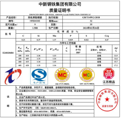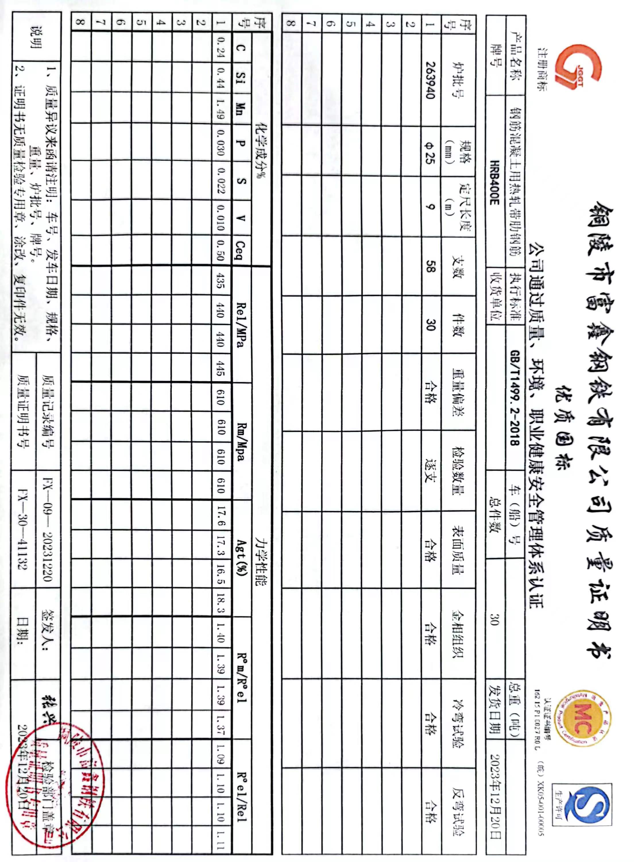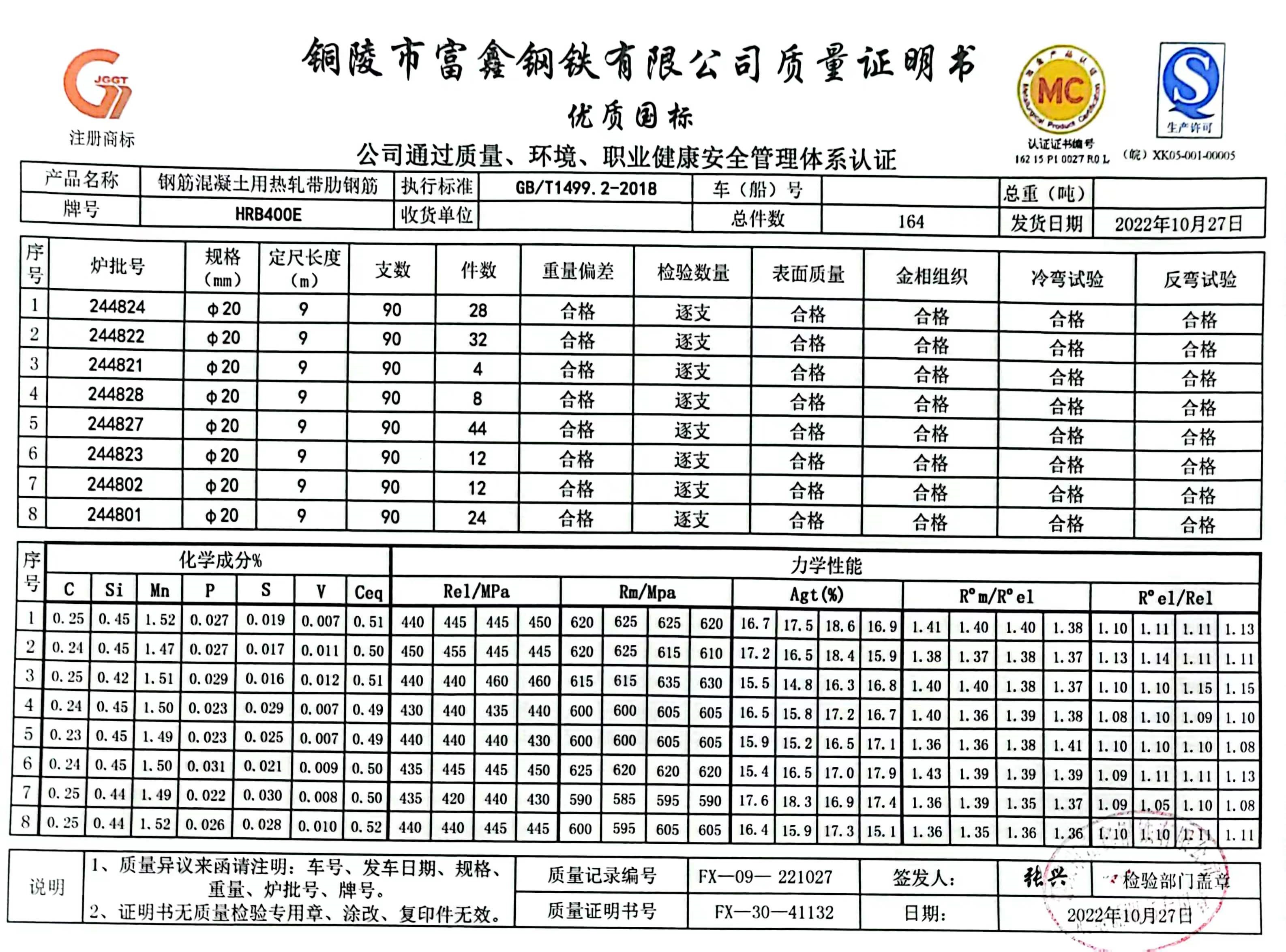 铜陵市富鑫钢铁有限公司质量证明书公司通过质量、环境、职业健康安全管理体系认证