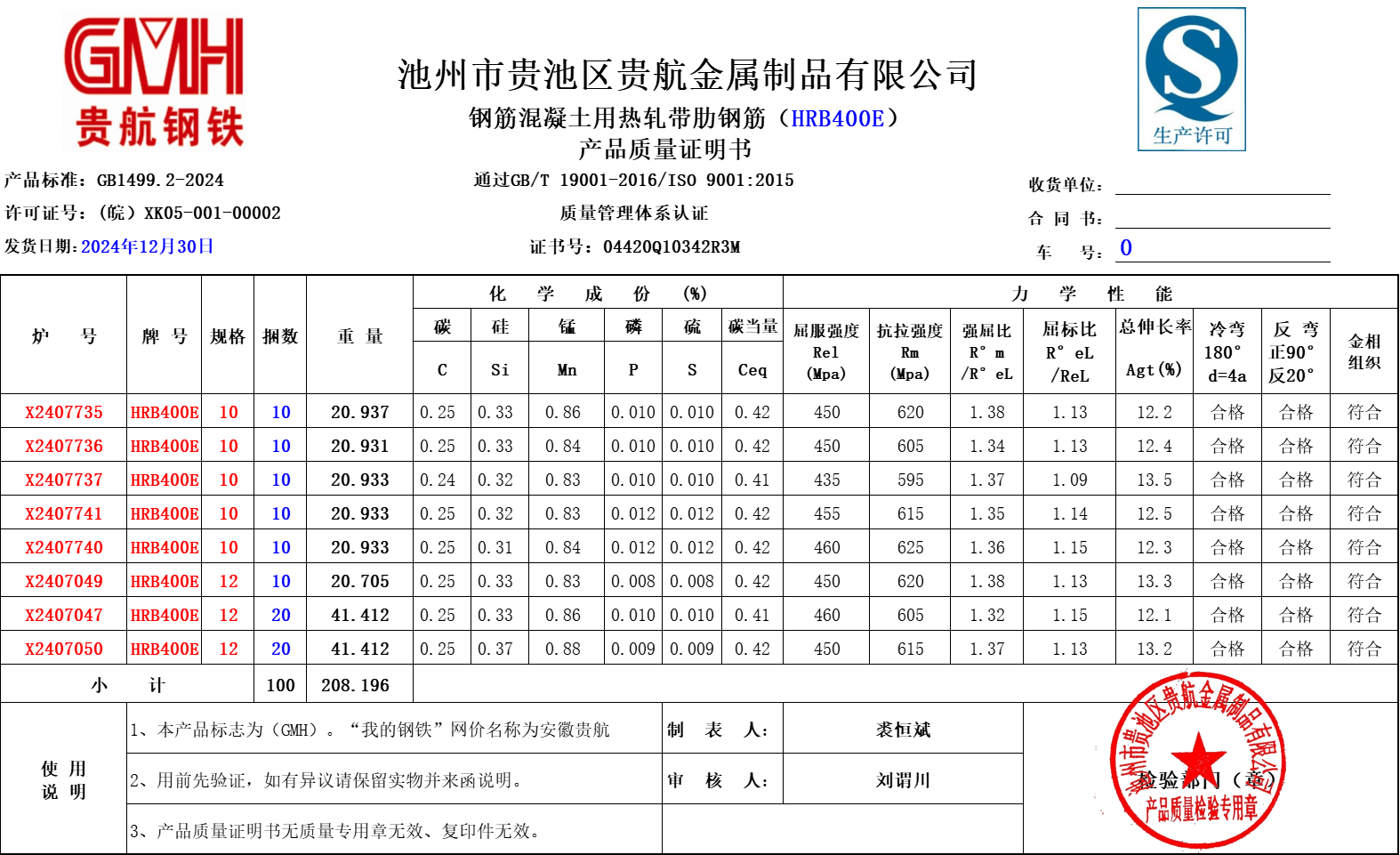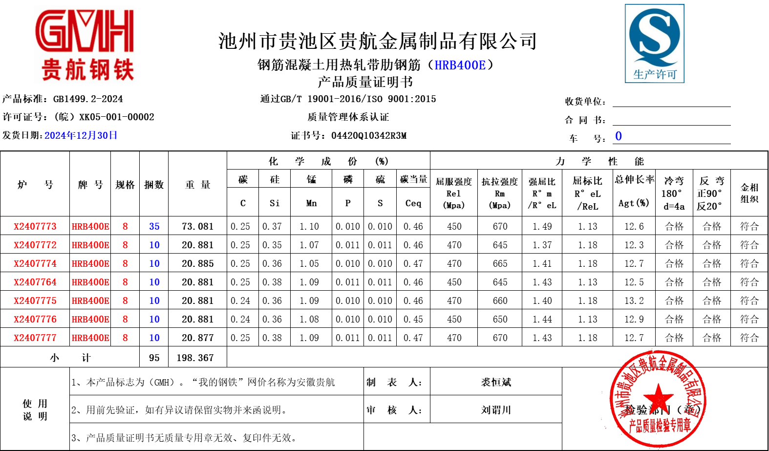 安徽省贵航特钢有限公司GH/JL-JZ-45提货单位:陕西建工材料设备物流集团有限公司3、如发现产品质量问题,请在验收后5天内向我公司质量科提出异议并保留实物,等我公司审验后处理,擅自使用我公司不负任何责任。