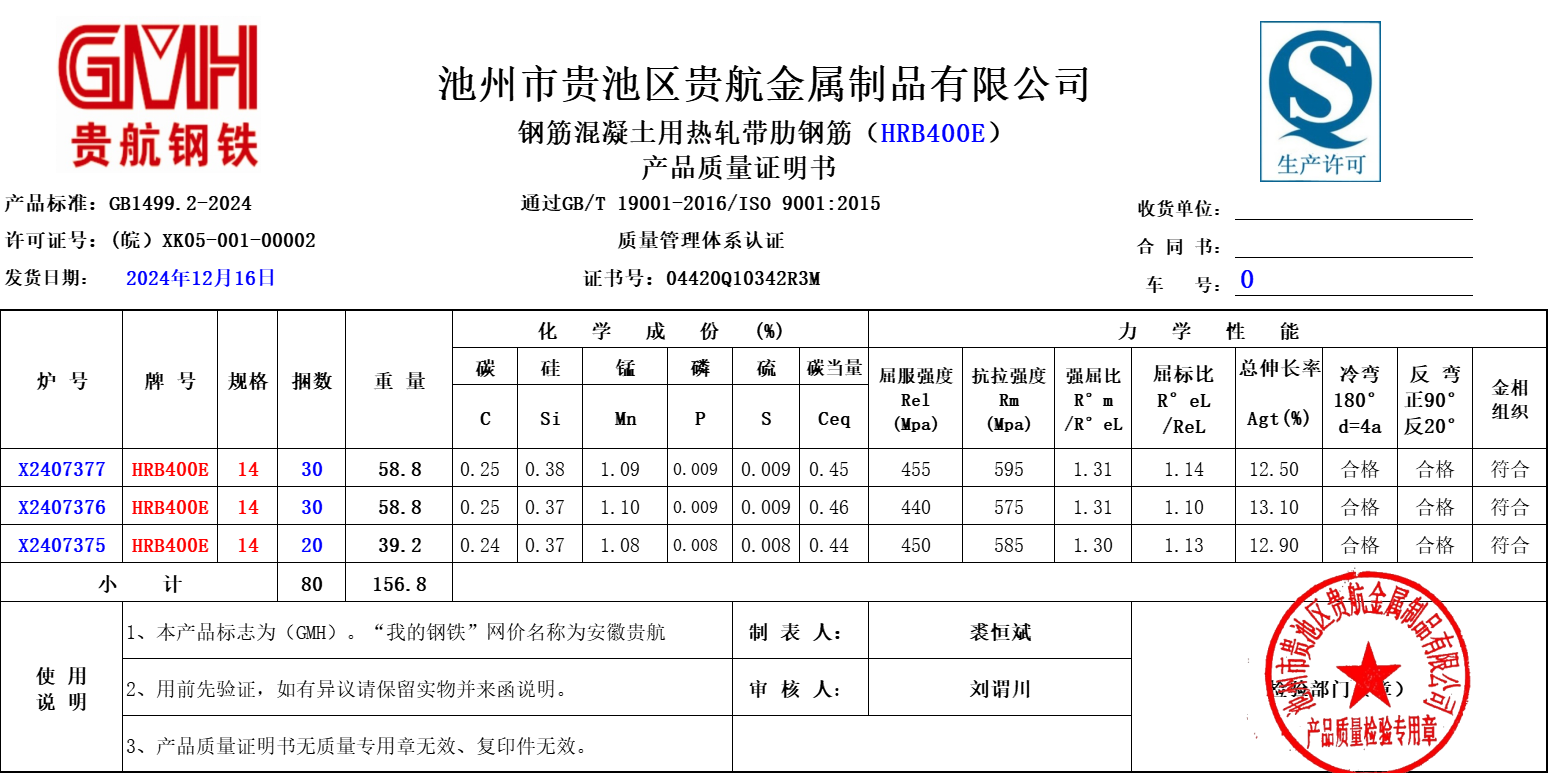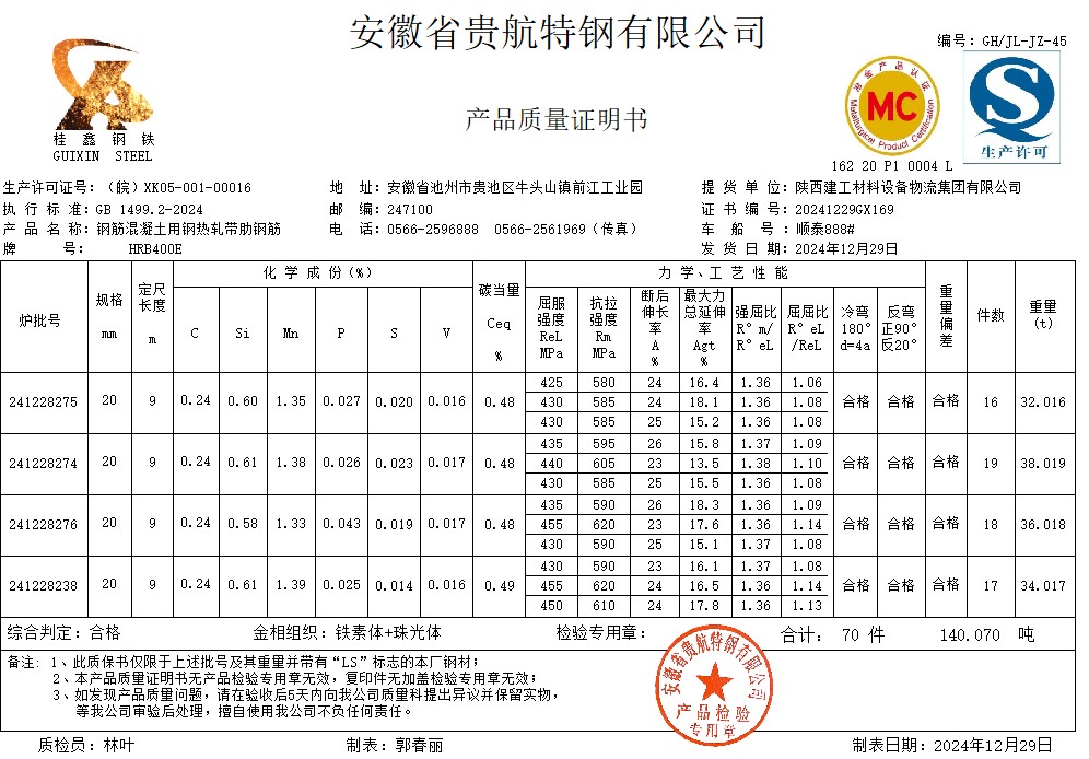 安徽省贵航特钢有限公司GH/JL-JZ-45提货单位:陕西建工材料设备物流集团有限公司3、如发现产品质量问题,请在验收后5天内向我公司质量科提出异议并保留实物,等我公司审验后处理,擅自使用我公司不负任何责任。