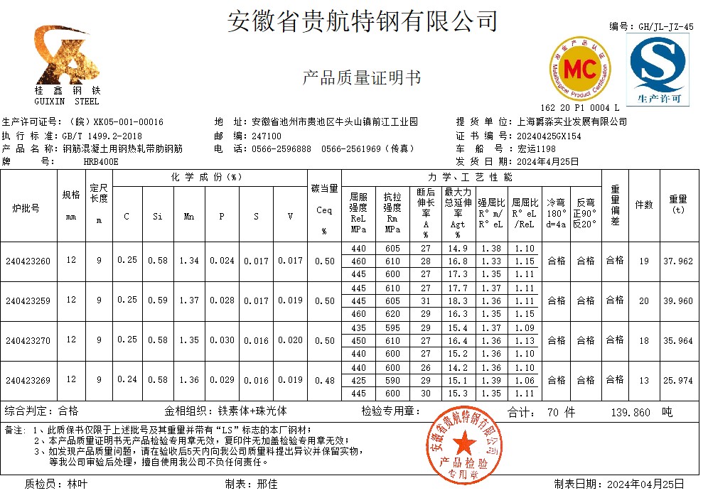 安徽省贵航特钢有限公司GH/JL-JZ-45提货单位:上海乘翔实业有限公司3、如发现产品质重问题,请在验收后5天内向我公司质里科提出异议并保留实物,等我公司审验后处理,擅自使用我公司不负任何责任。